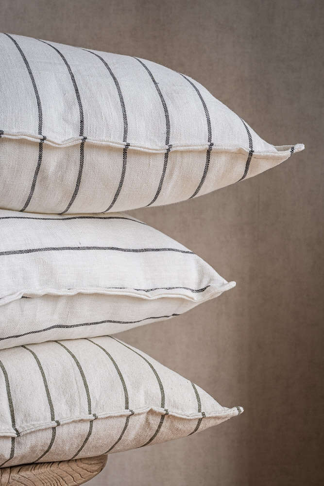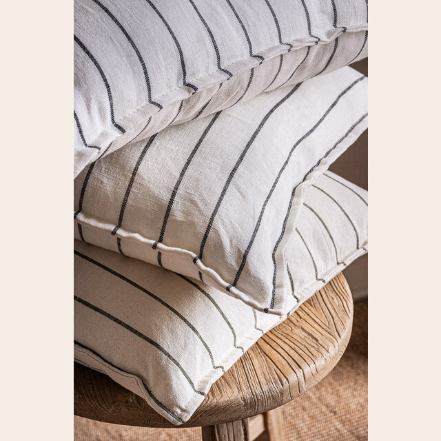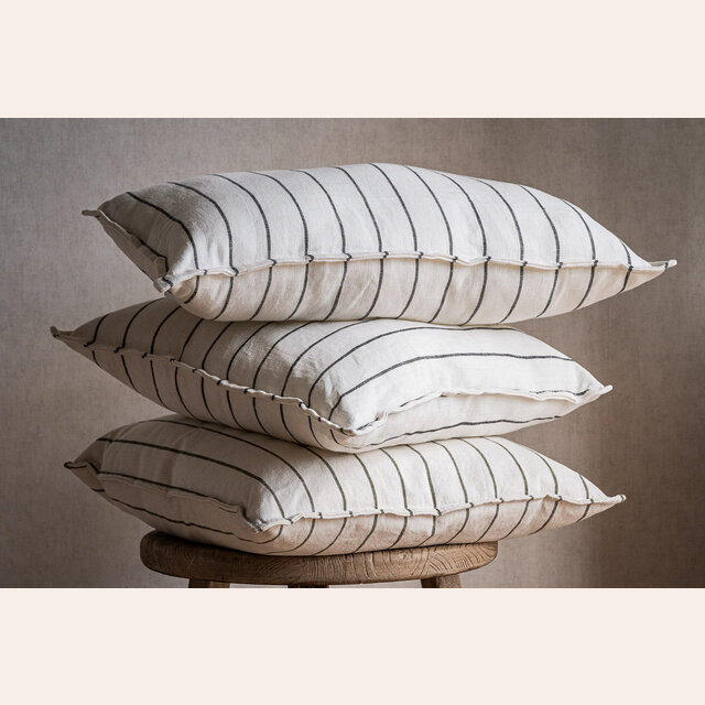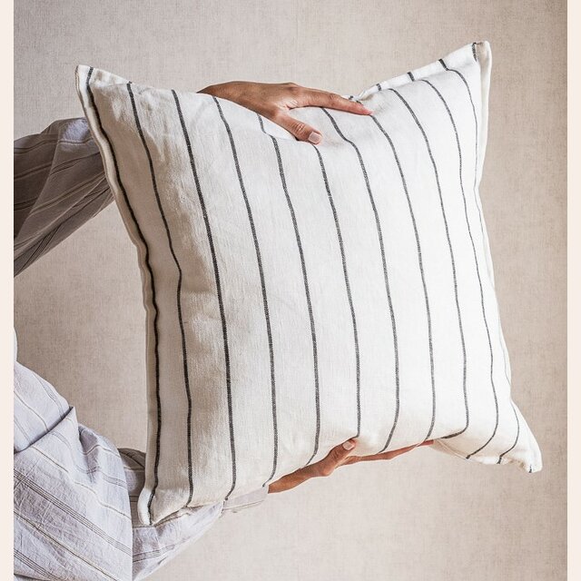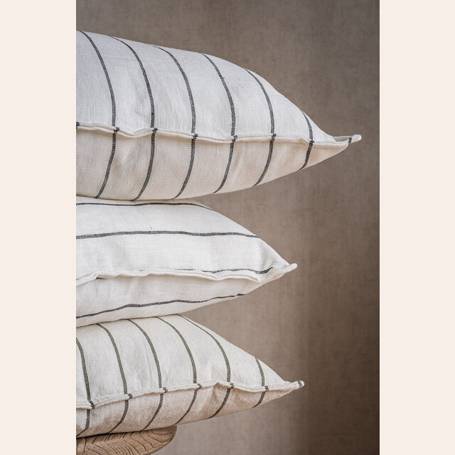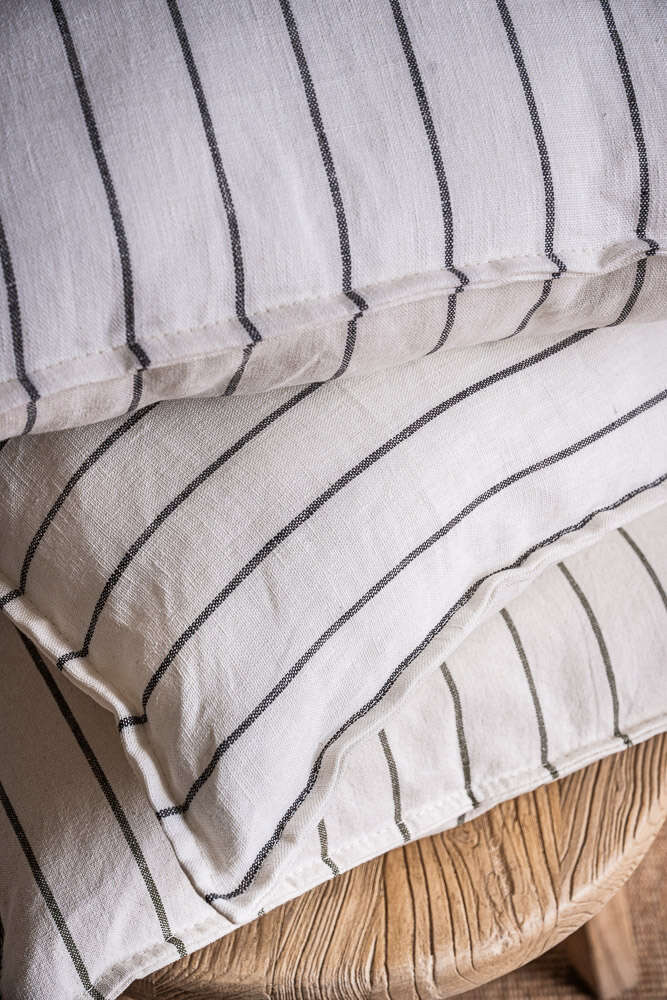 Almohadón 100% lino natural de trama gruesa en estampa rayada gris oscuro / azul.