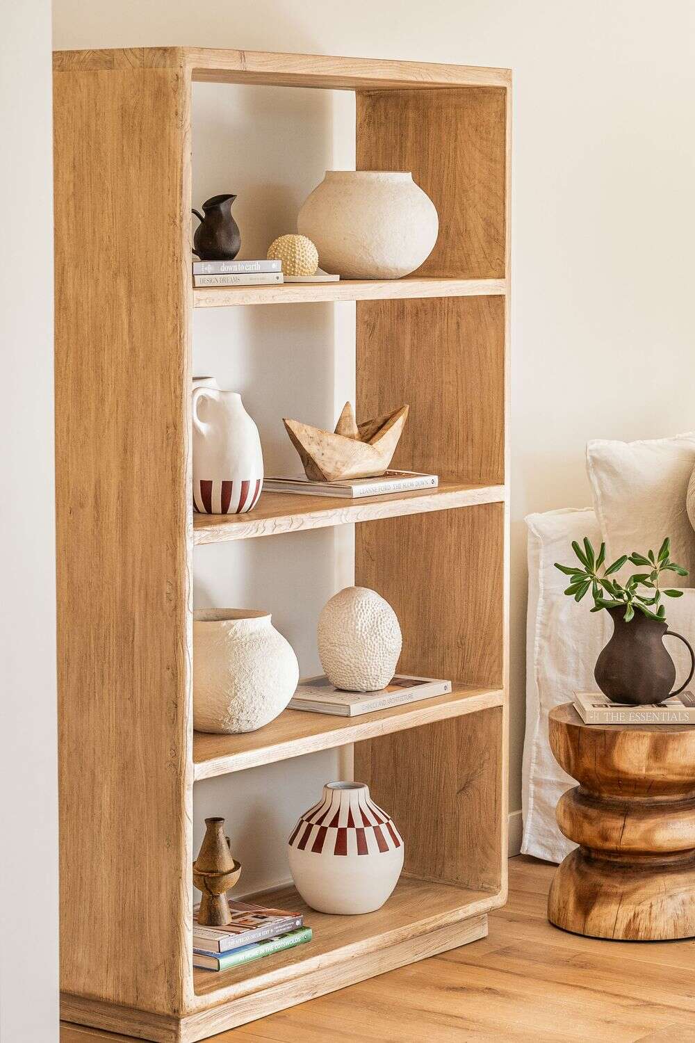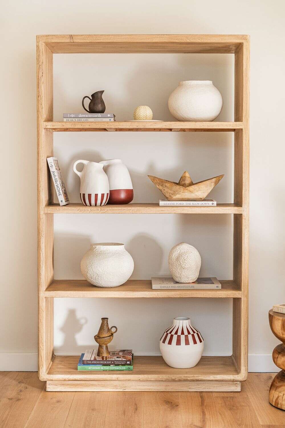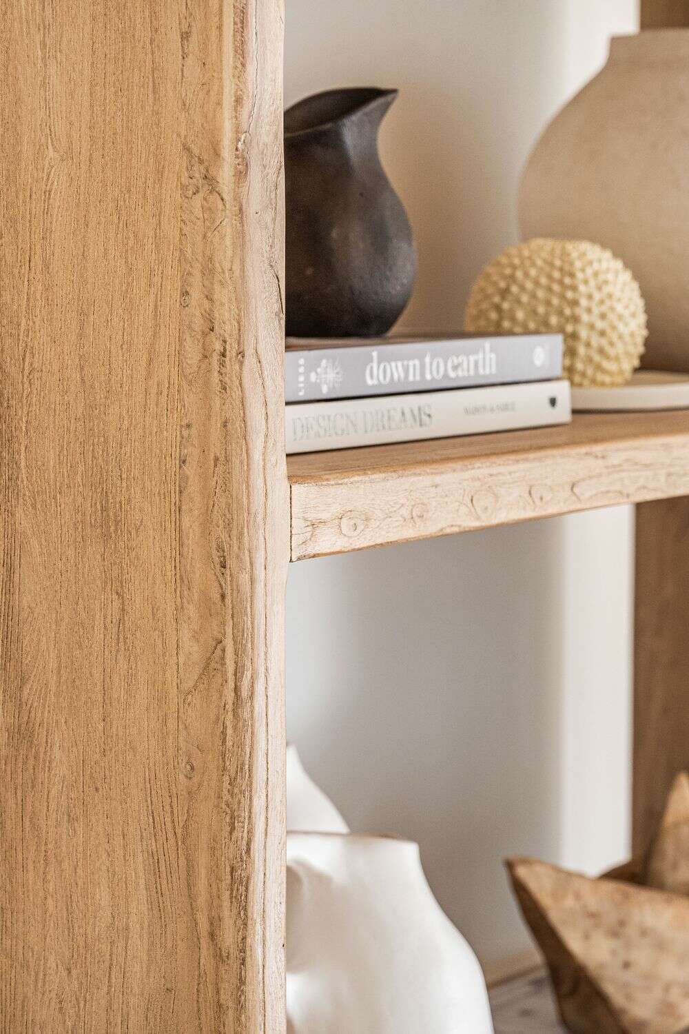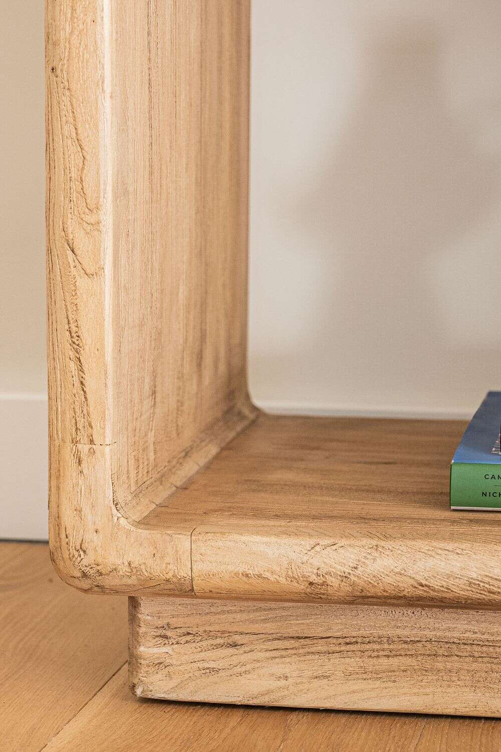 Gran biblioteca de olmo antiguo en lustre natural con suaves terminaciones curvas.