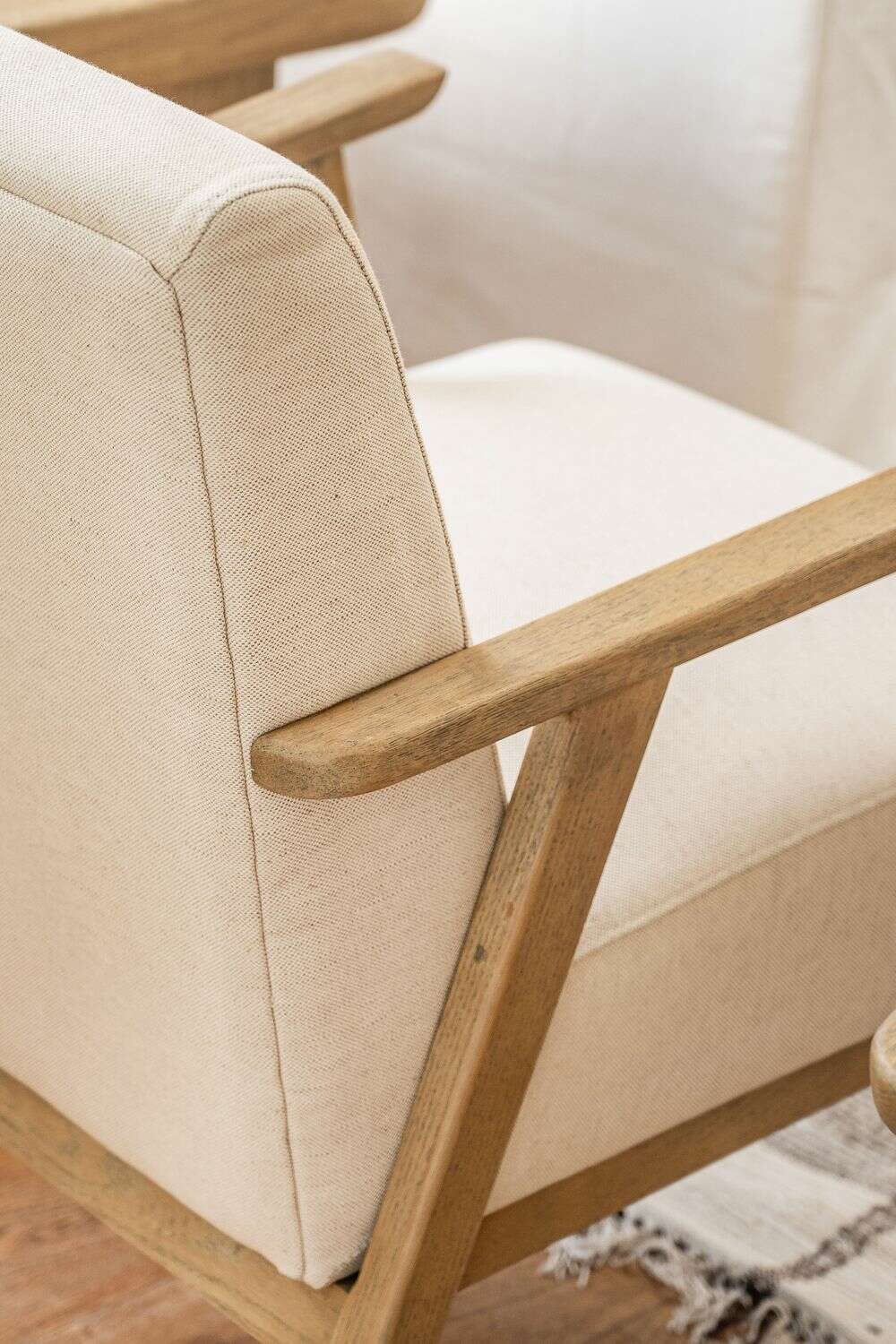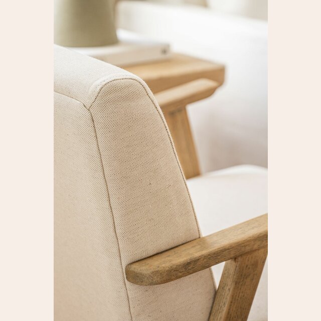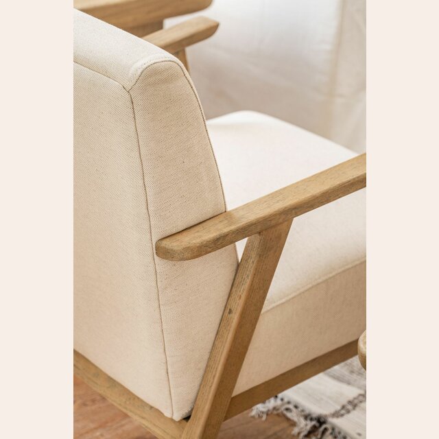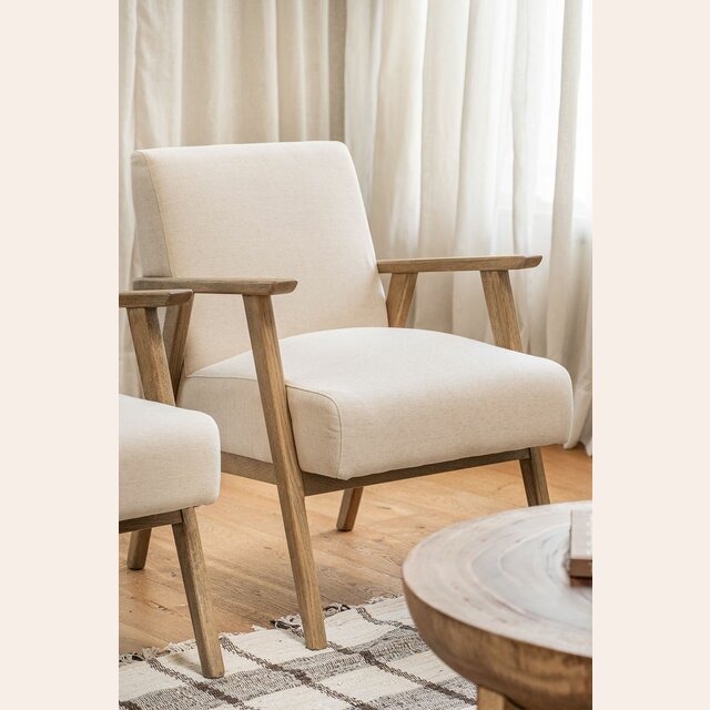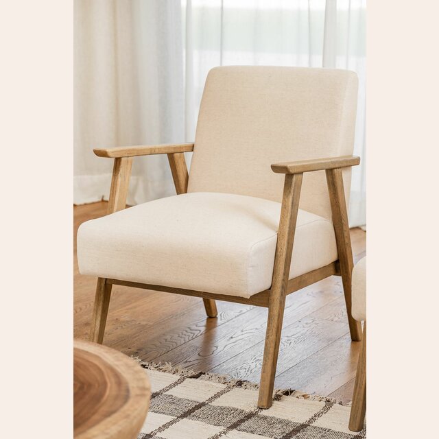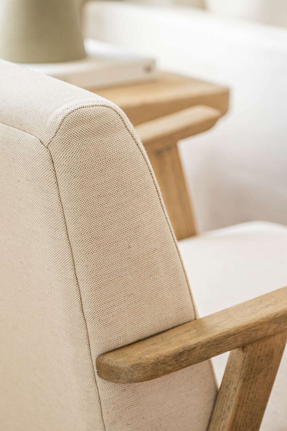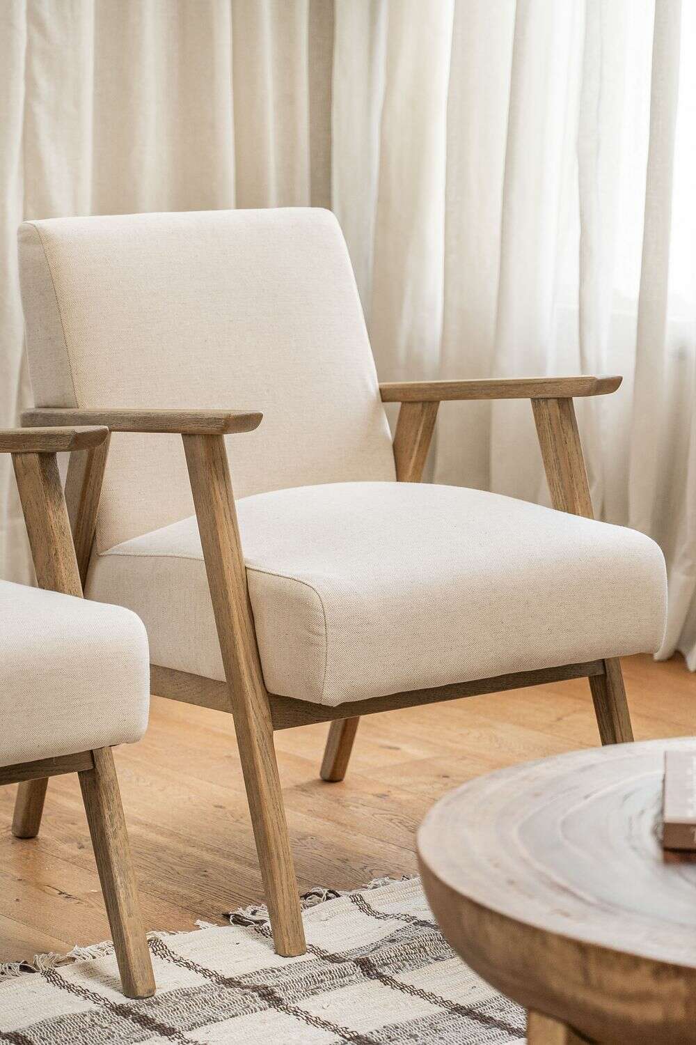 Butaca de fresno macizo y lino crudo en dimensiones perfectas para múltiples ambientes: livings, dormitorios y rincones difíciles.