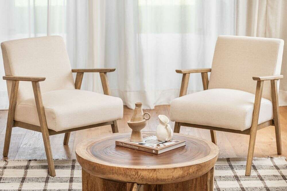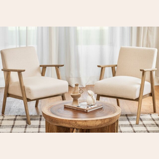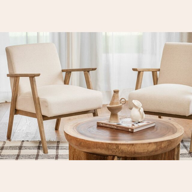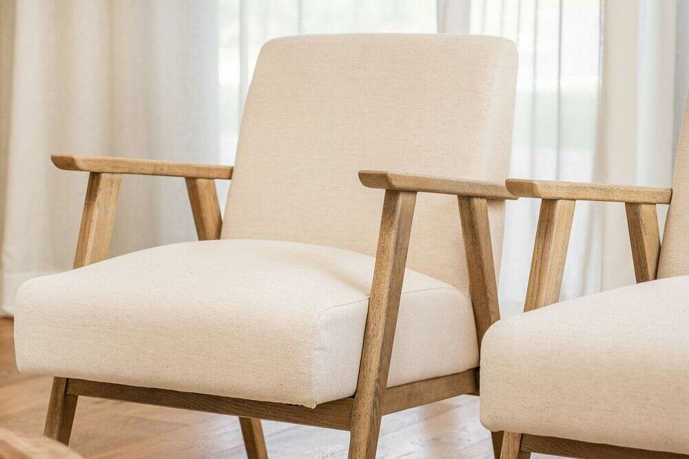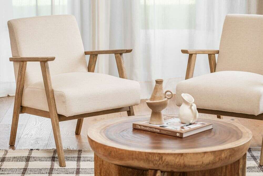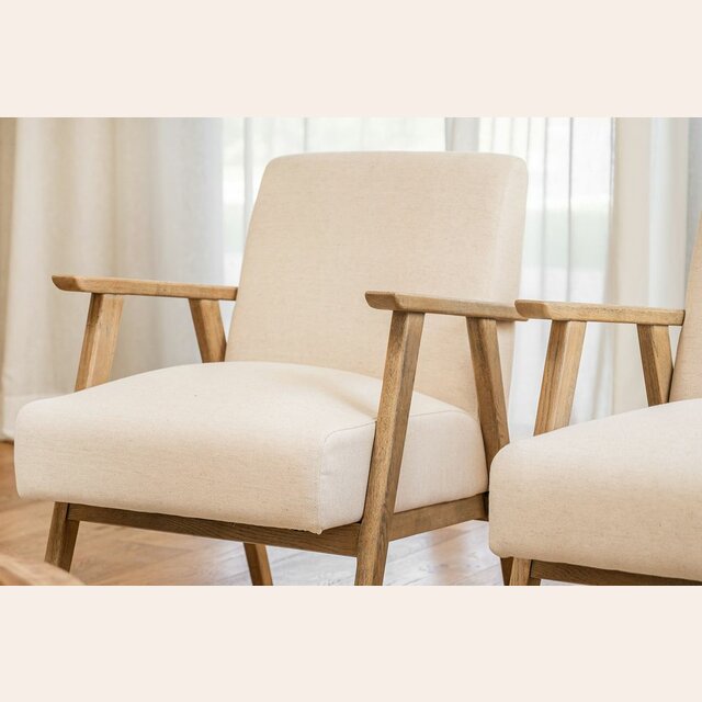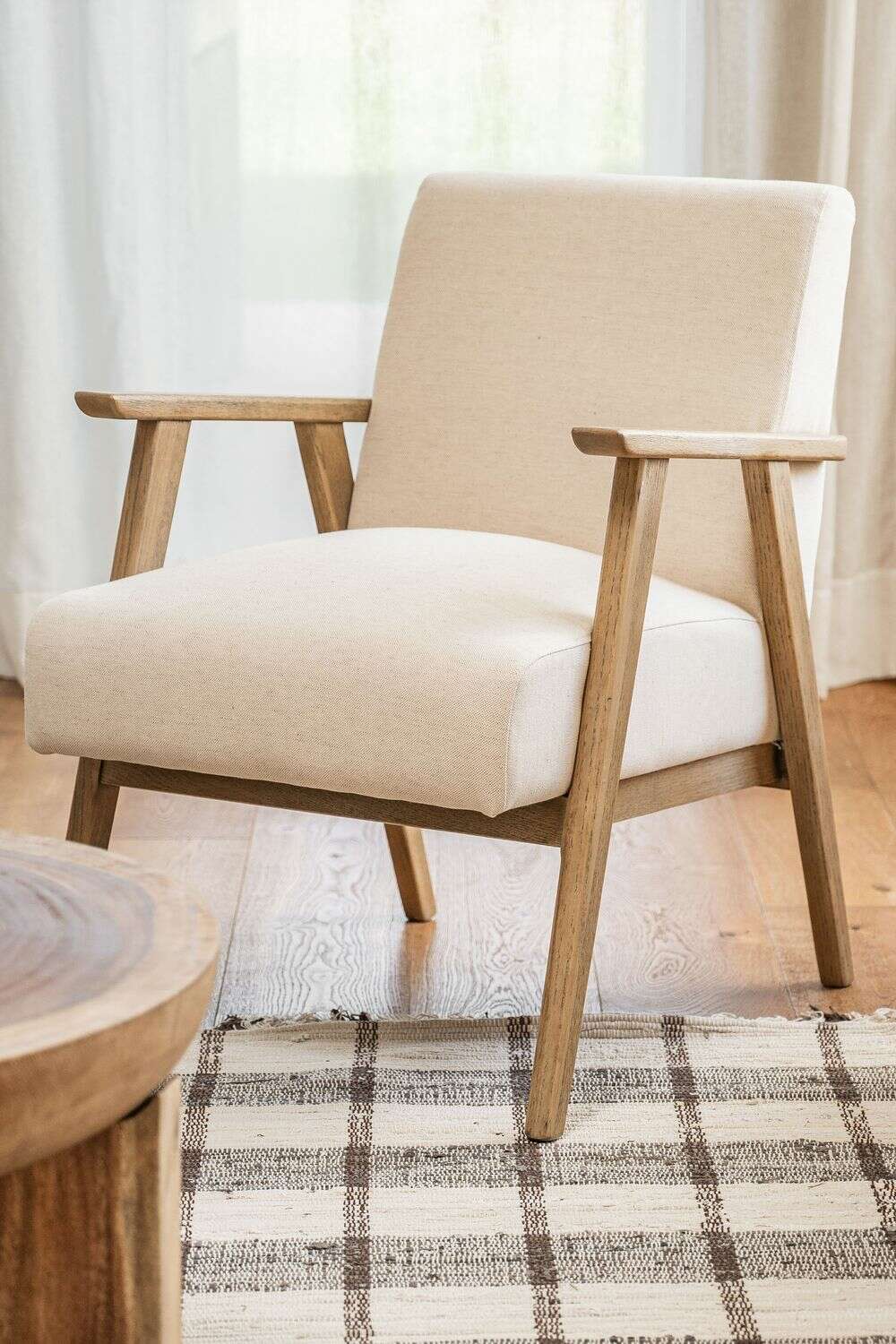 Butaca de fresno macizo y lino crudo en dimensiones perfectas para múltiples ambientes: livings, dormitorios y rincones difíciles.