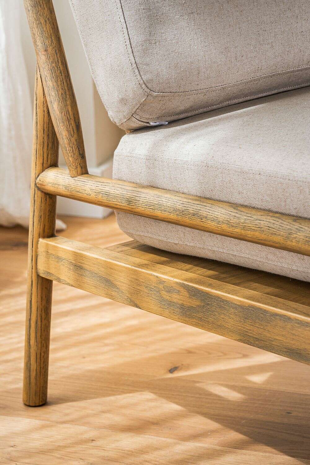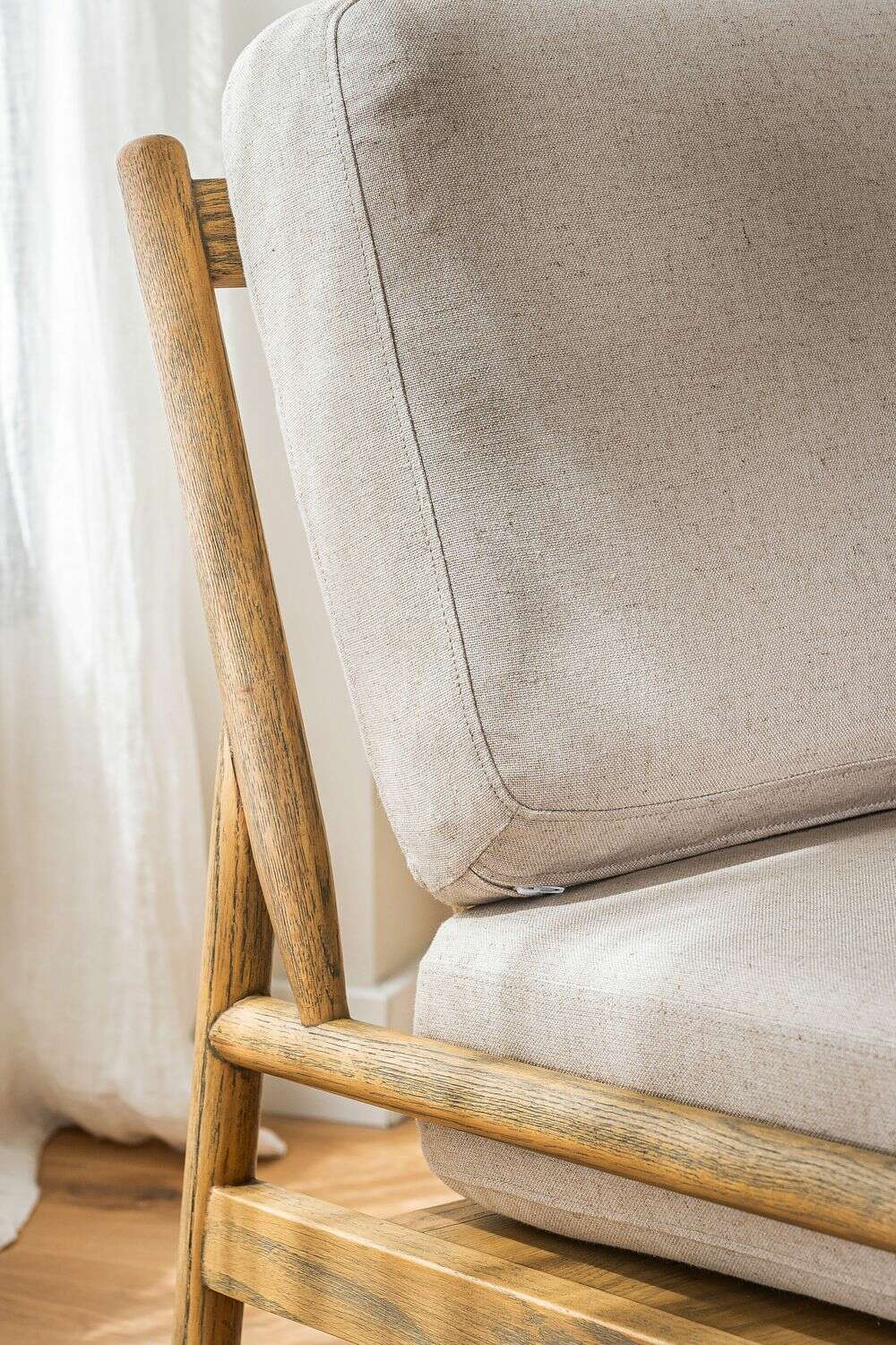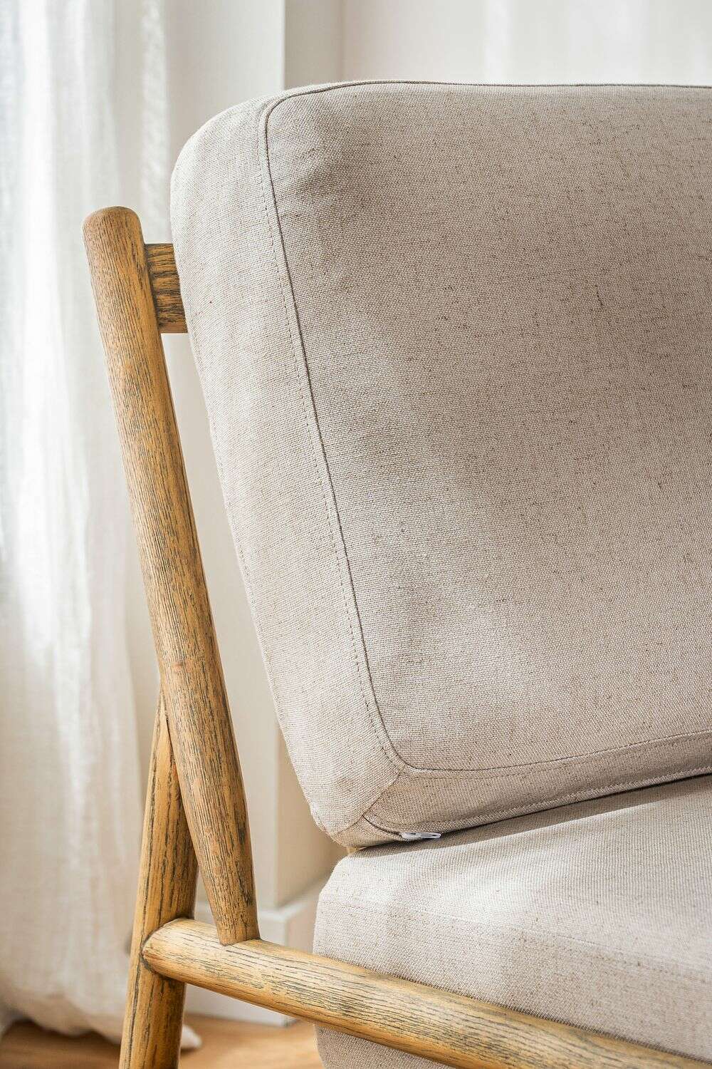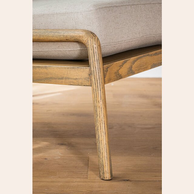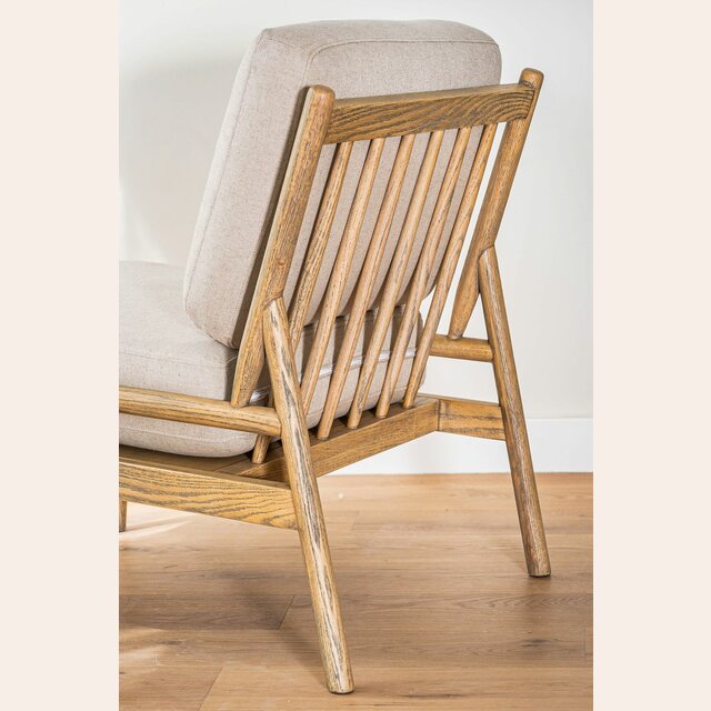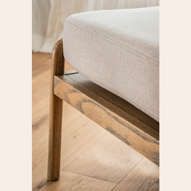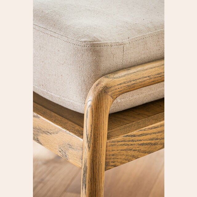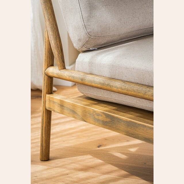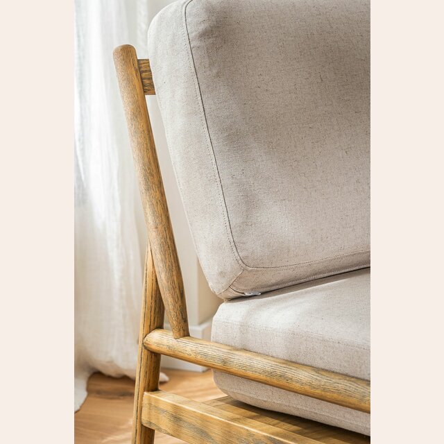 Divina butaca con estructura de caños redondos de fresno macizo y detalles en respaldo, tapizada en lino crudo, versátil y combinable.