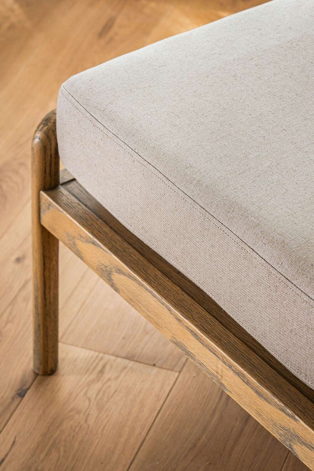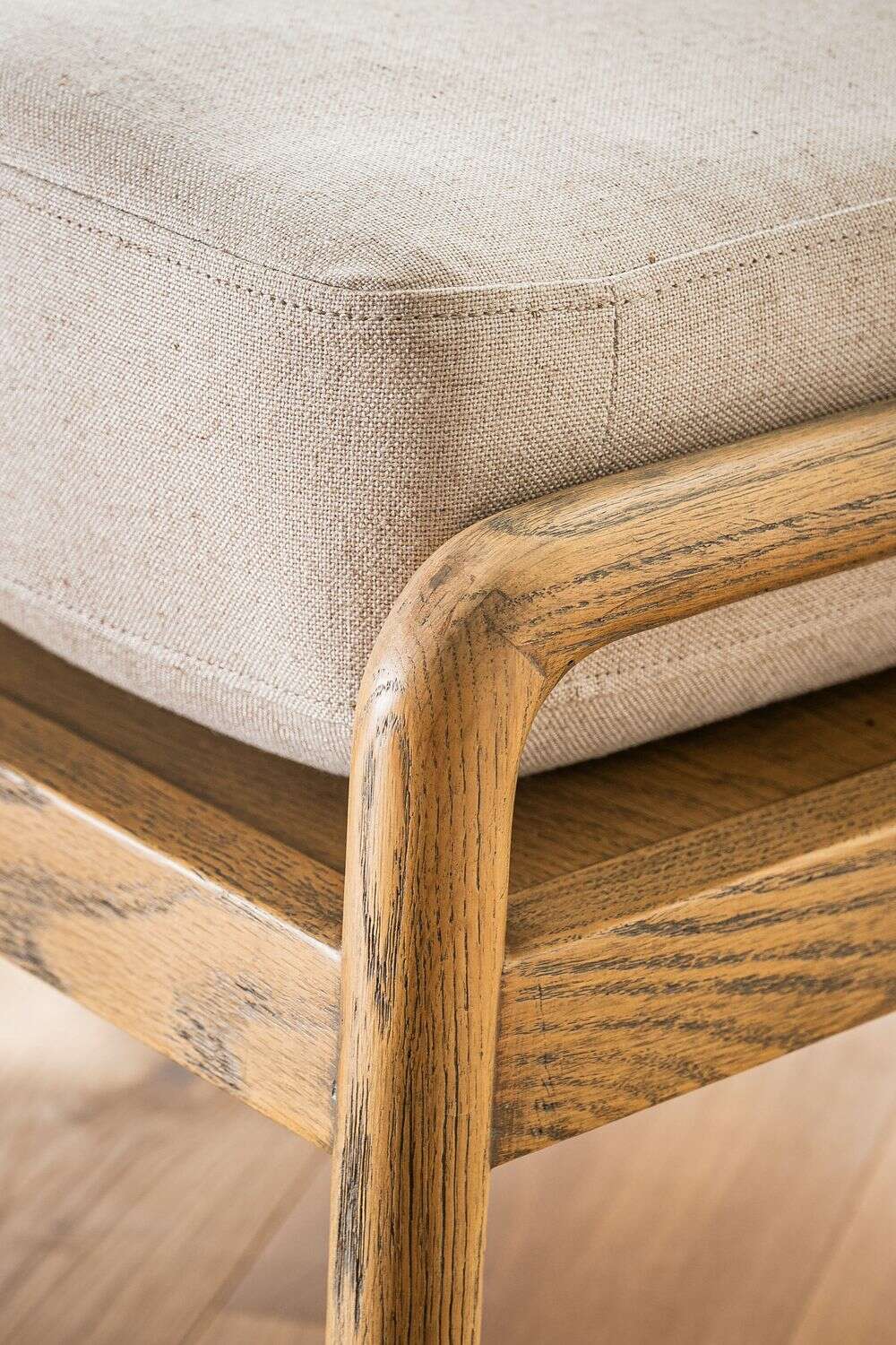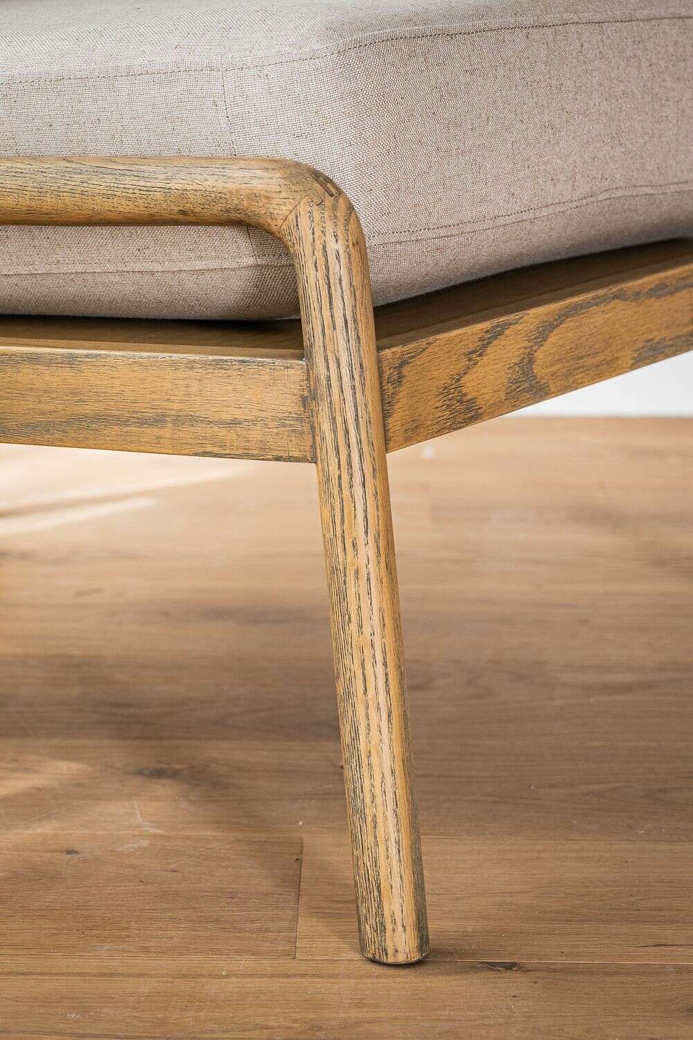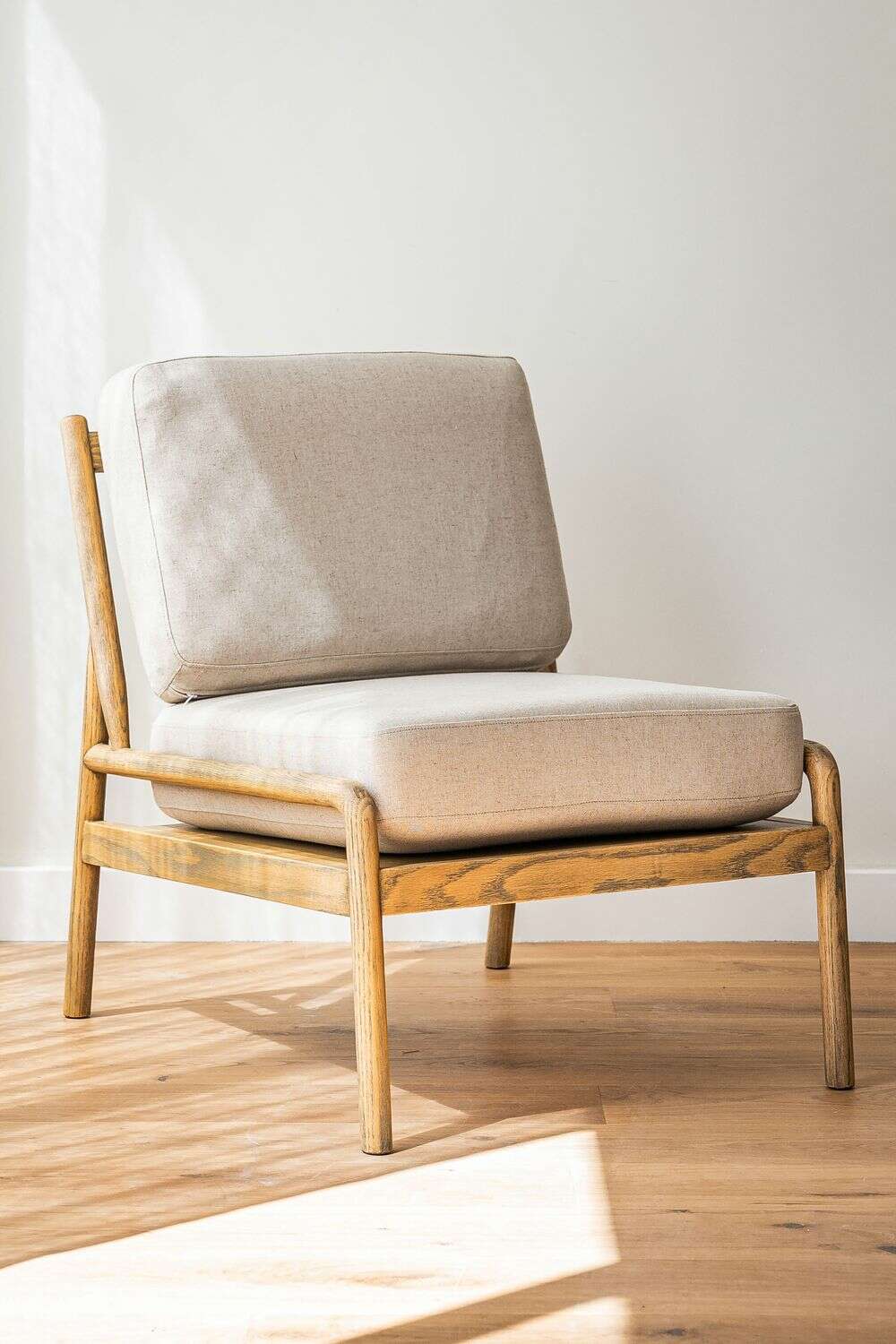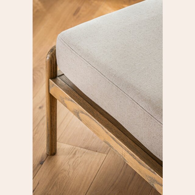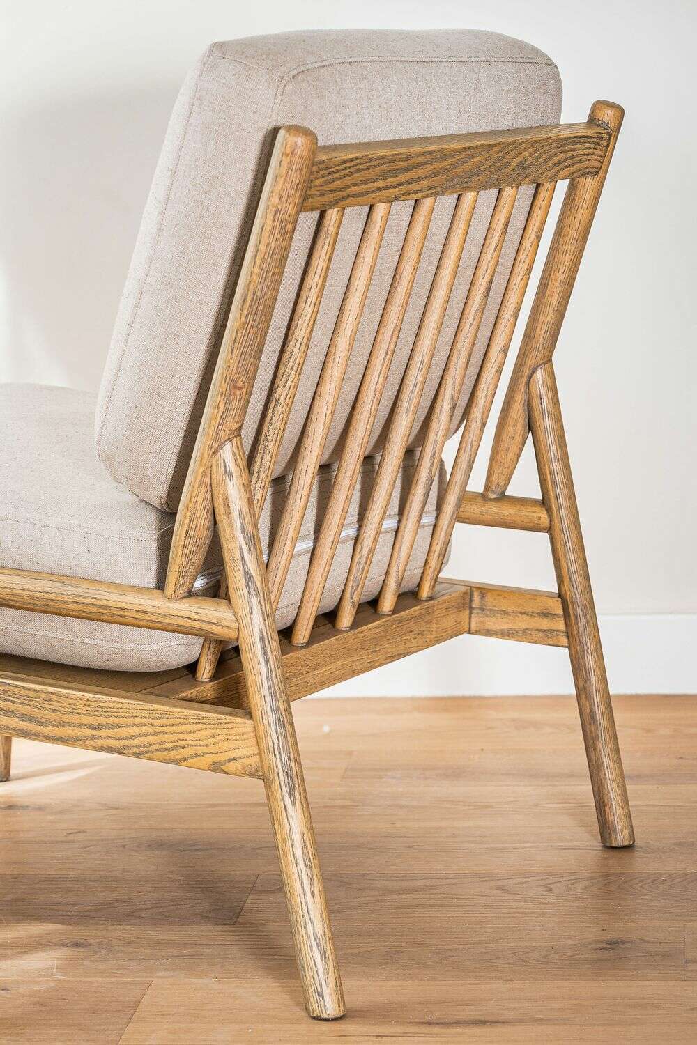 Divina butaca con estructura de caños redondos de fresno macizo y detalles en respaldo, tapizada en lino crudo, versátil y combinable.