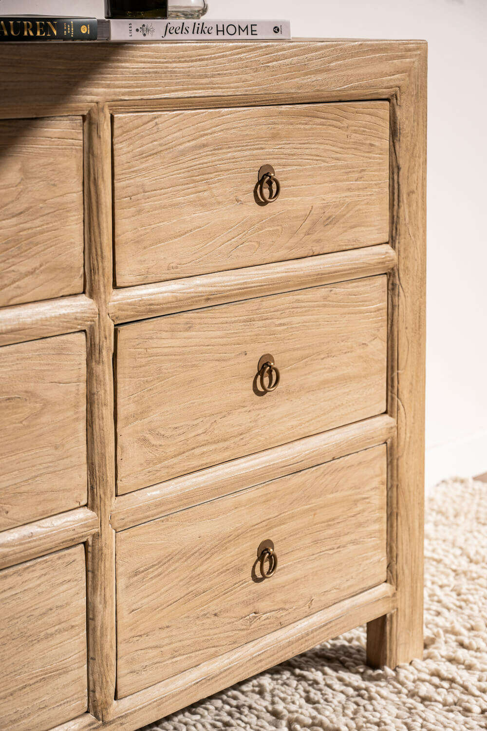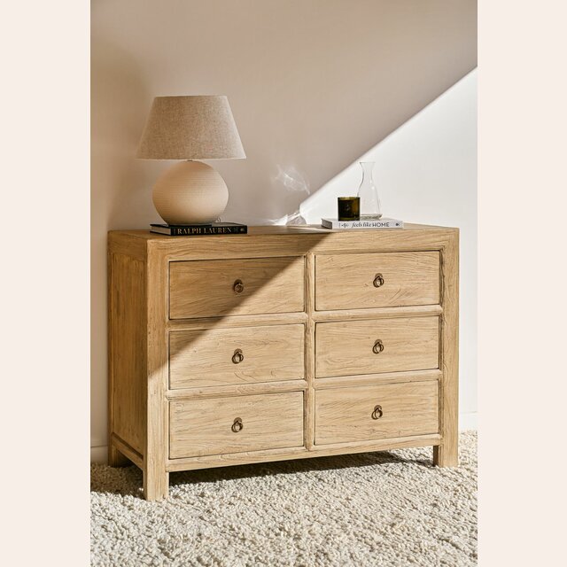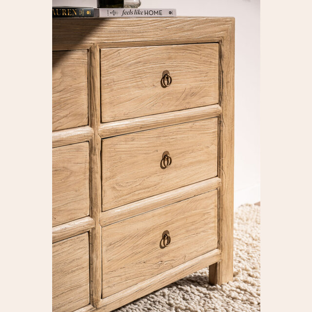 Cómoda de olmo antiguo en suave lustre natural y herrajes redondos color oro viejo.