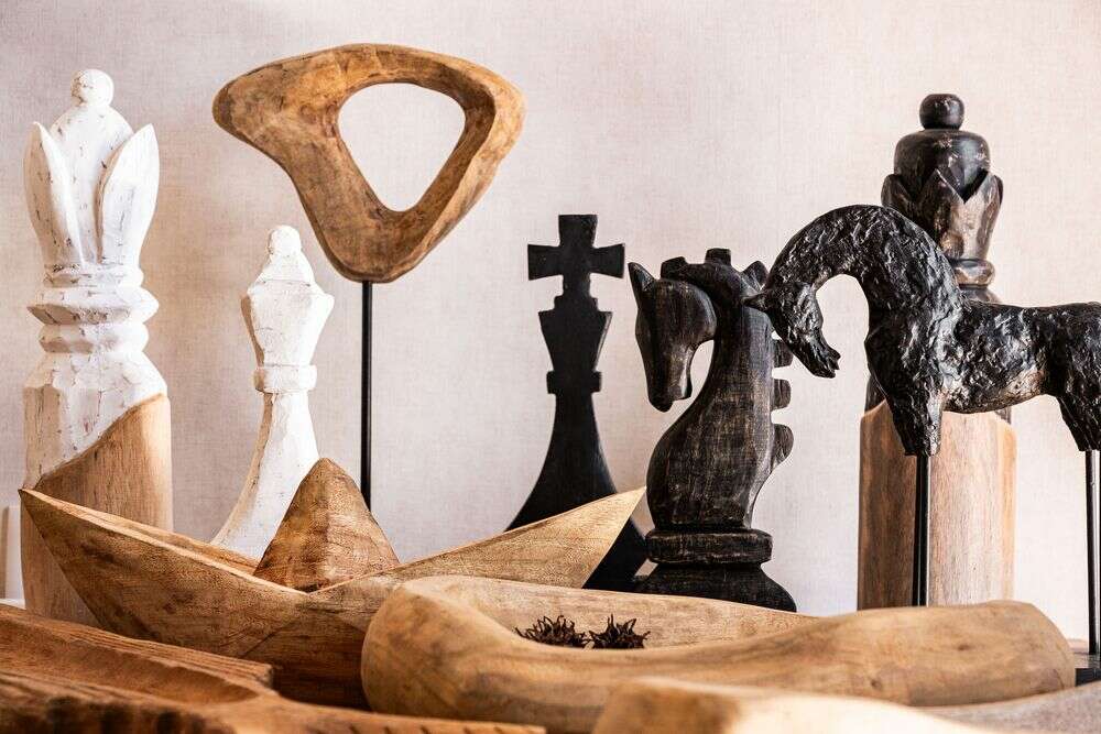 Colección de esculturas talladas en madera maciza de diferentes formas - abstractas o en motivos náutico, hípico o piezas de ajedrez.