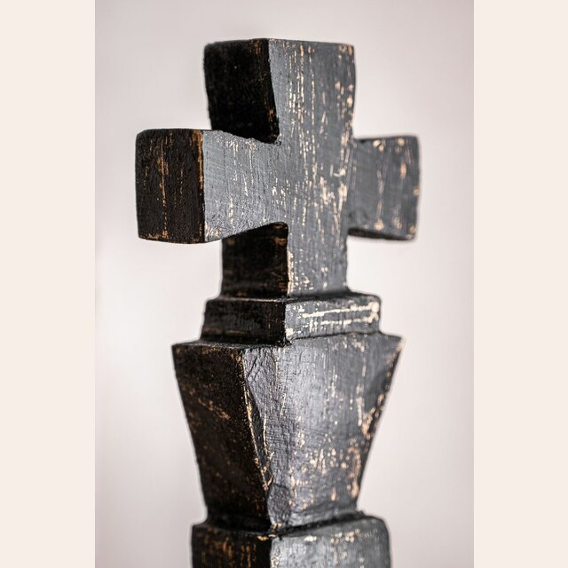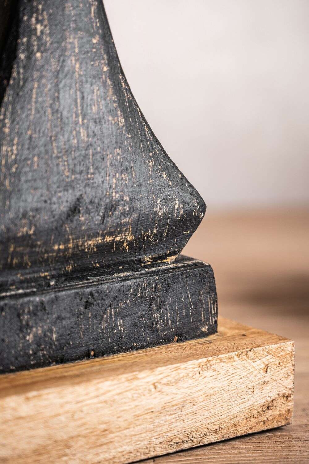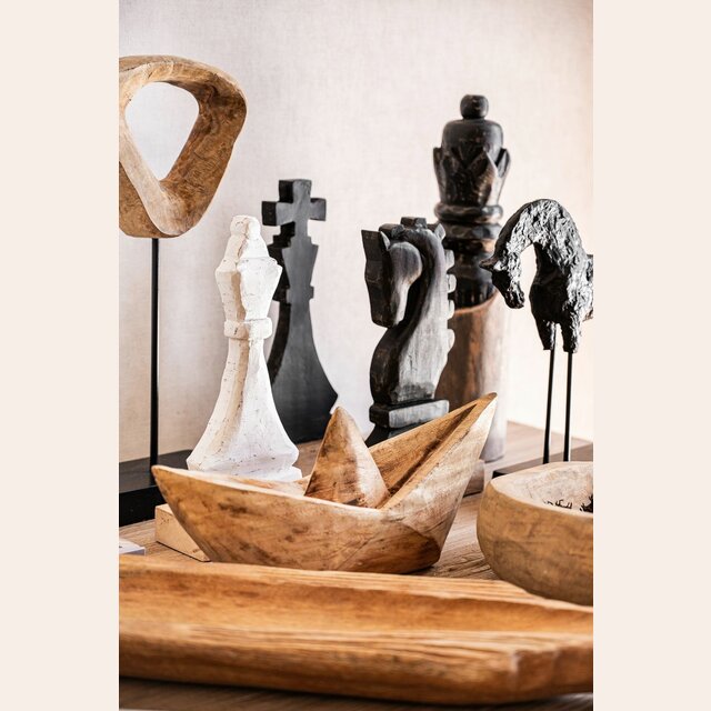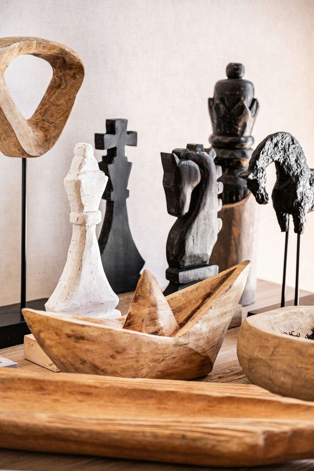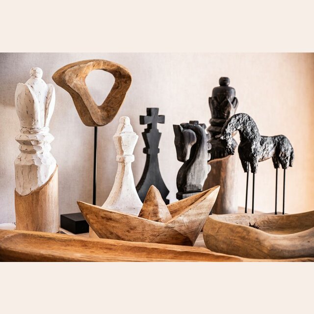 Colección de esculturas talladas en madera maciza de diferentes formas - abstractas o en motivos náutico, hípico o piezas de ajedrez.
