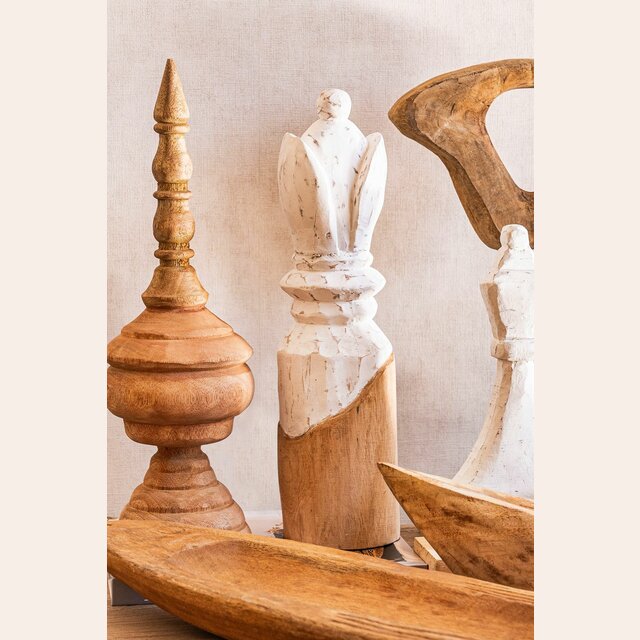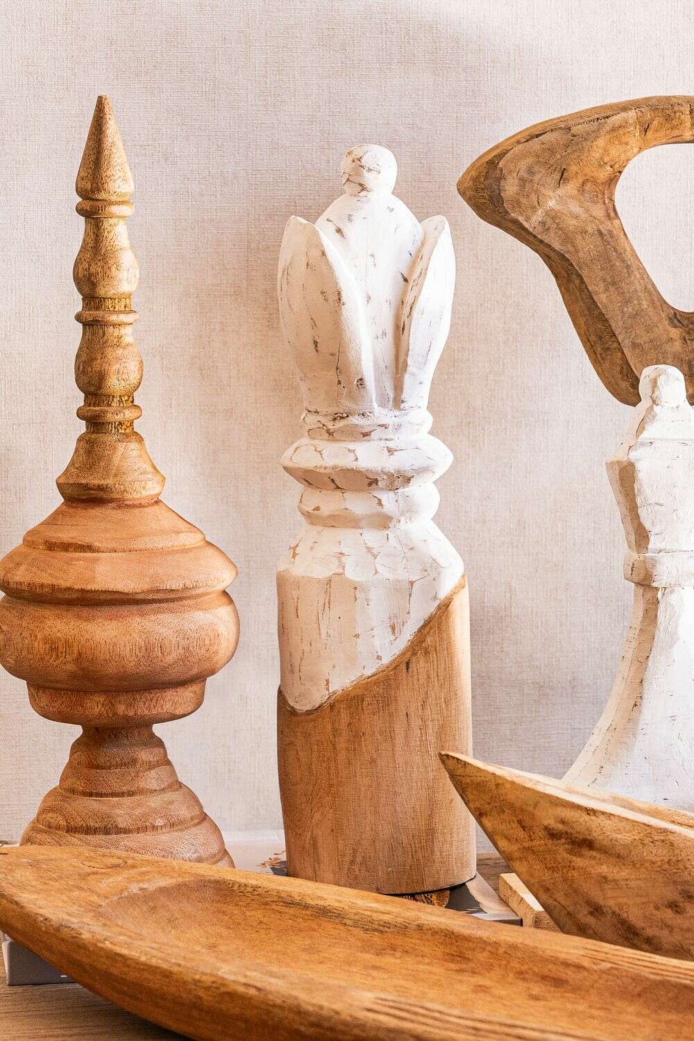 Colección de esculturas talladas en madera maciza de diferentes formas - abstractas o en motivos náutico, hípico o piezas de ajedrez.