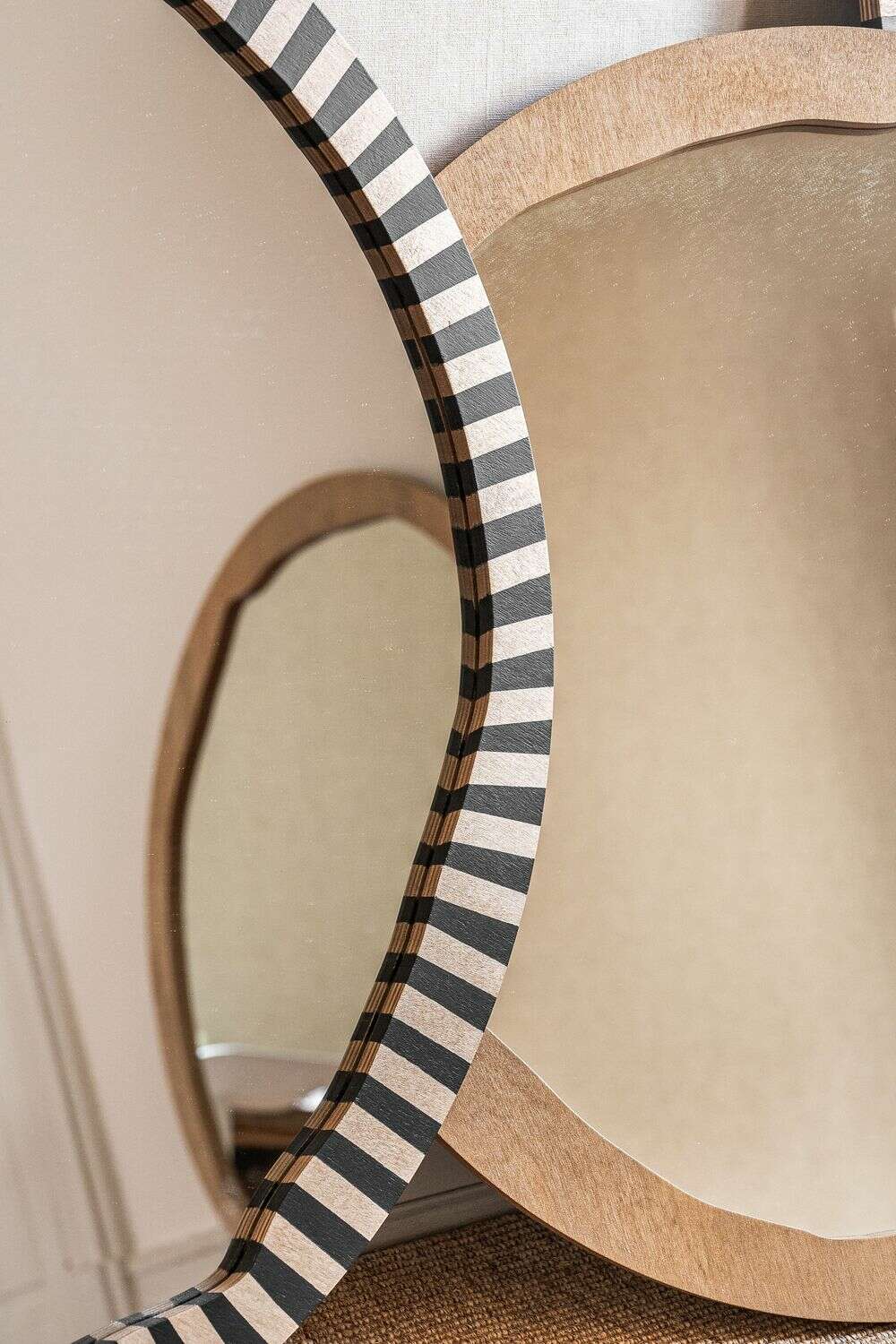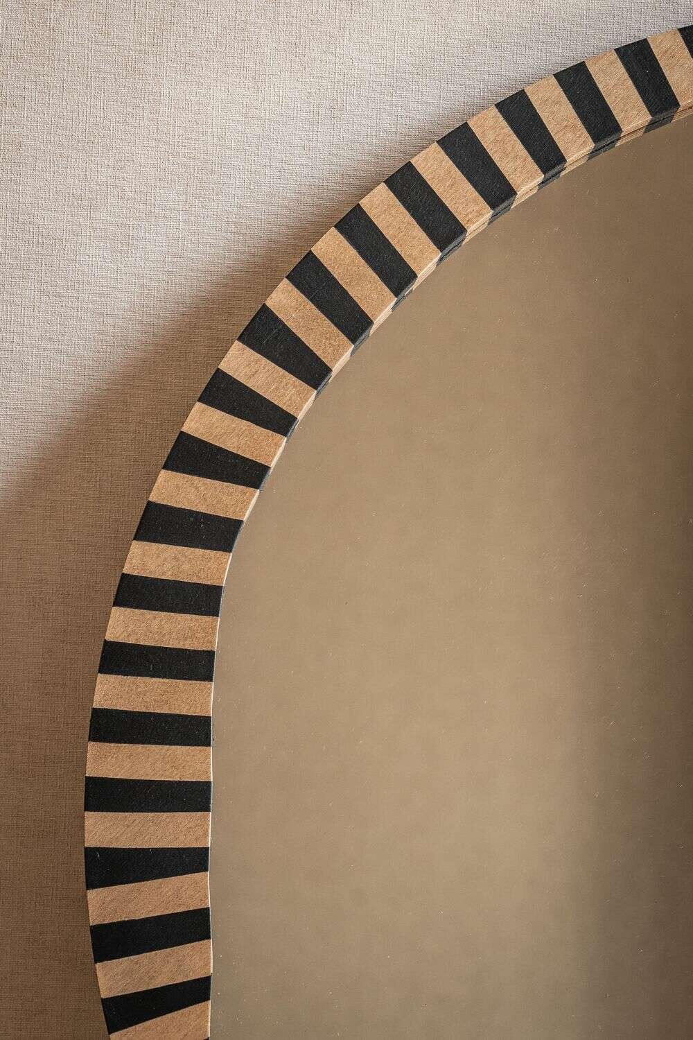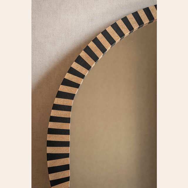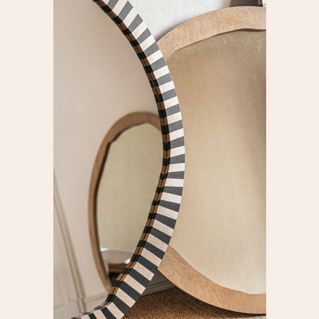 La colección de espejos Kenia con borde irregular y estampa a rayas es una pieza con personalidad y jugada para levantar espacios con una base neutra, o incluso dar más power a una decoración maximalista.