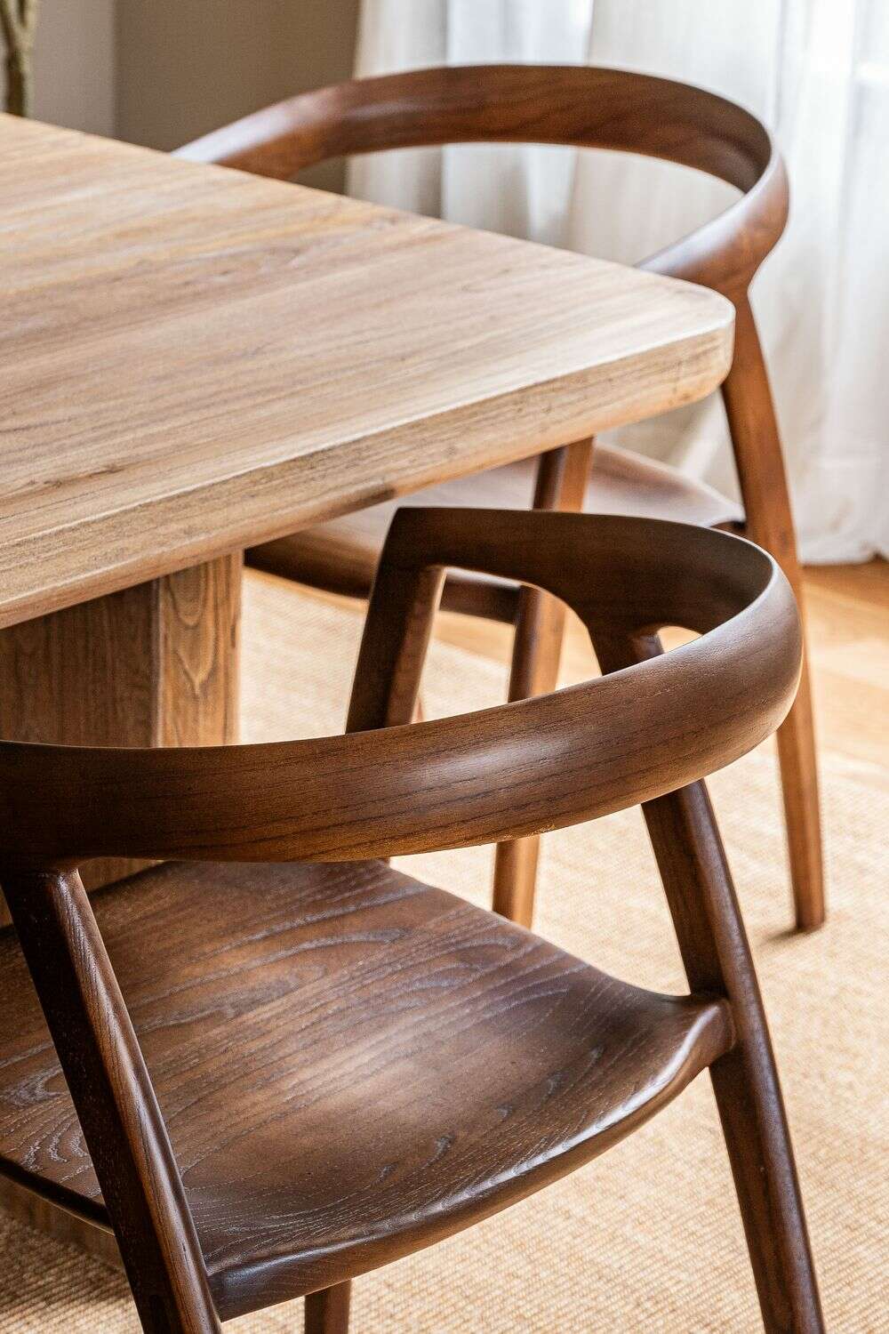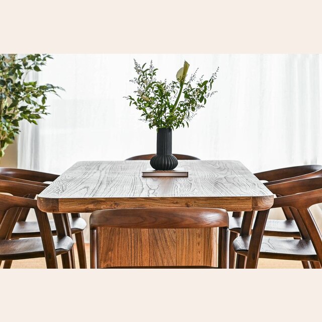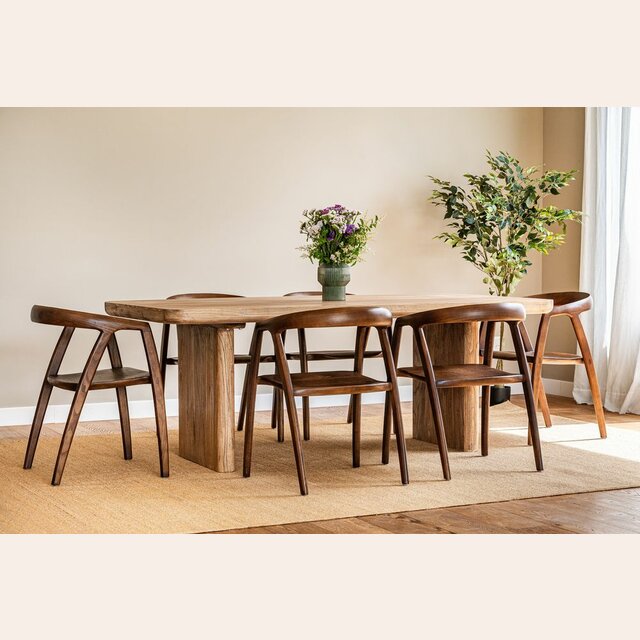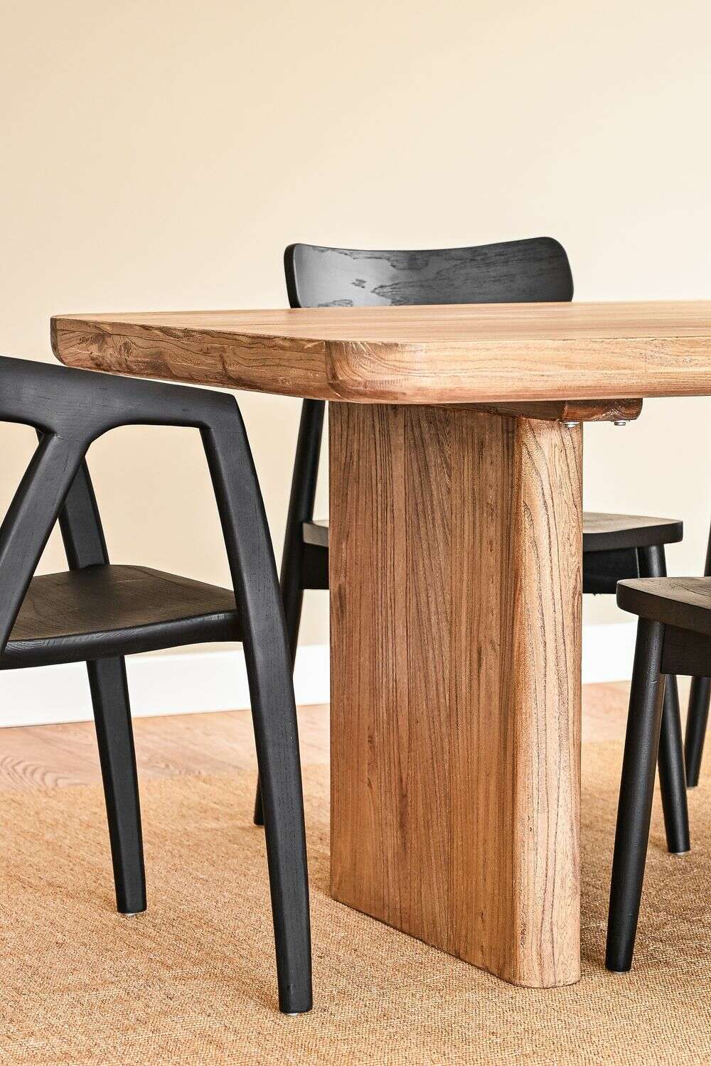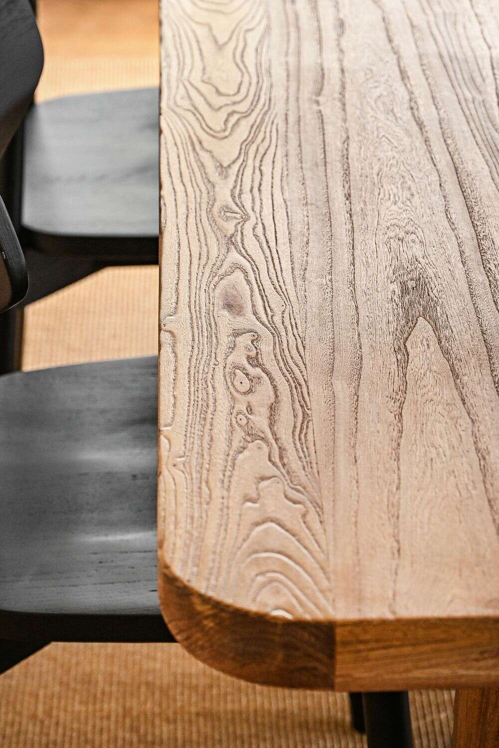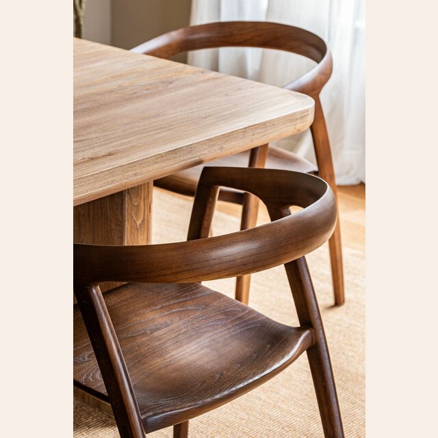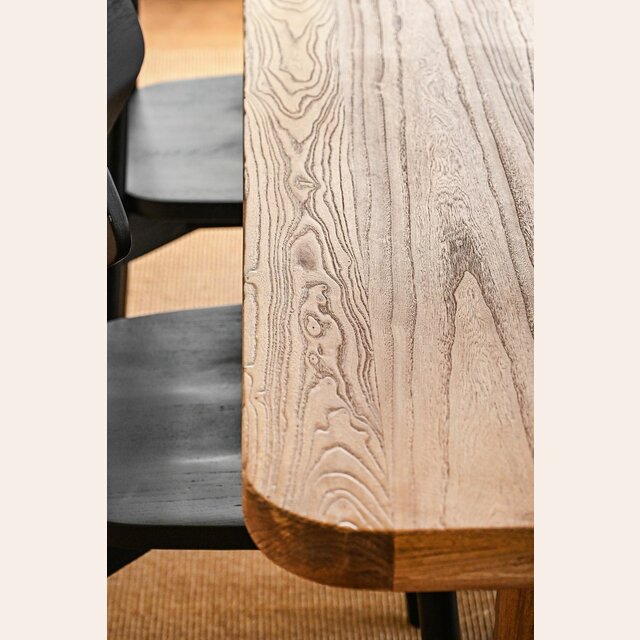 Mesa de comedor para 6 u 8 personas en madera de olmo antiguo recuperado con doble grosor en patas y tapa, en terminaciones curvas y redondeadas.