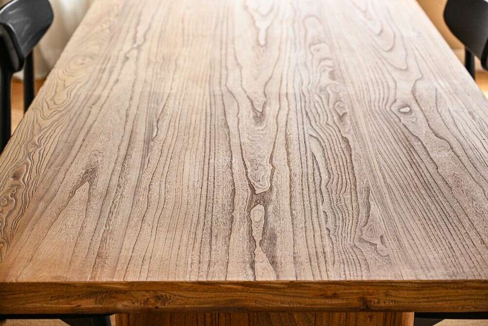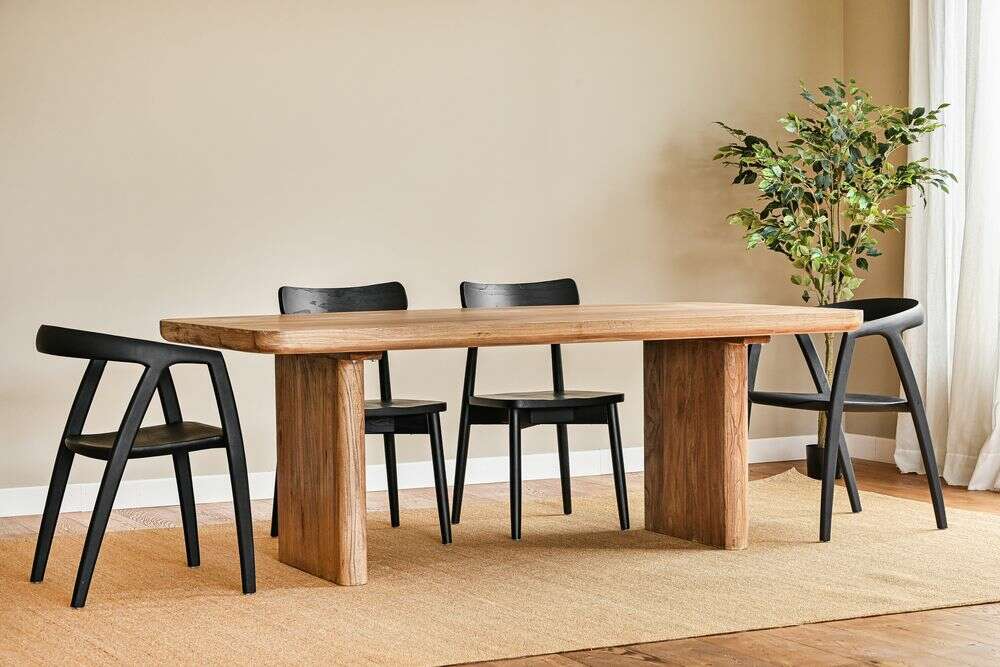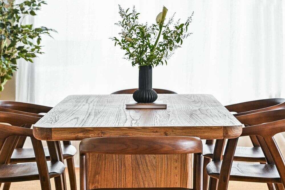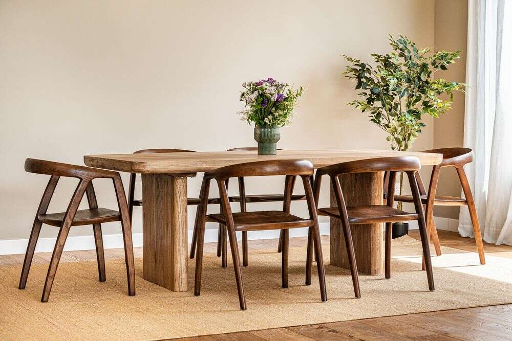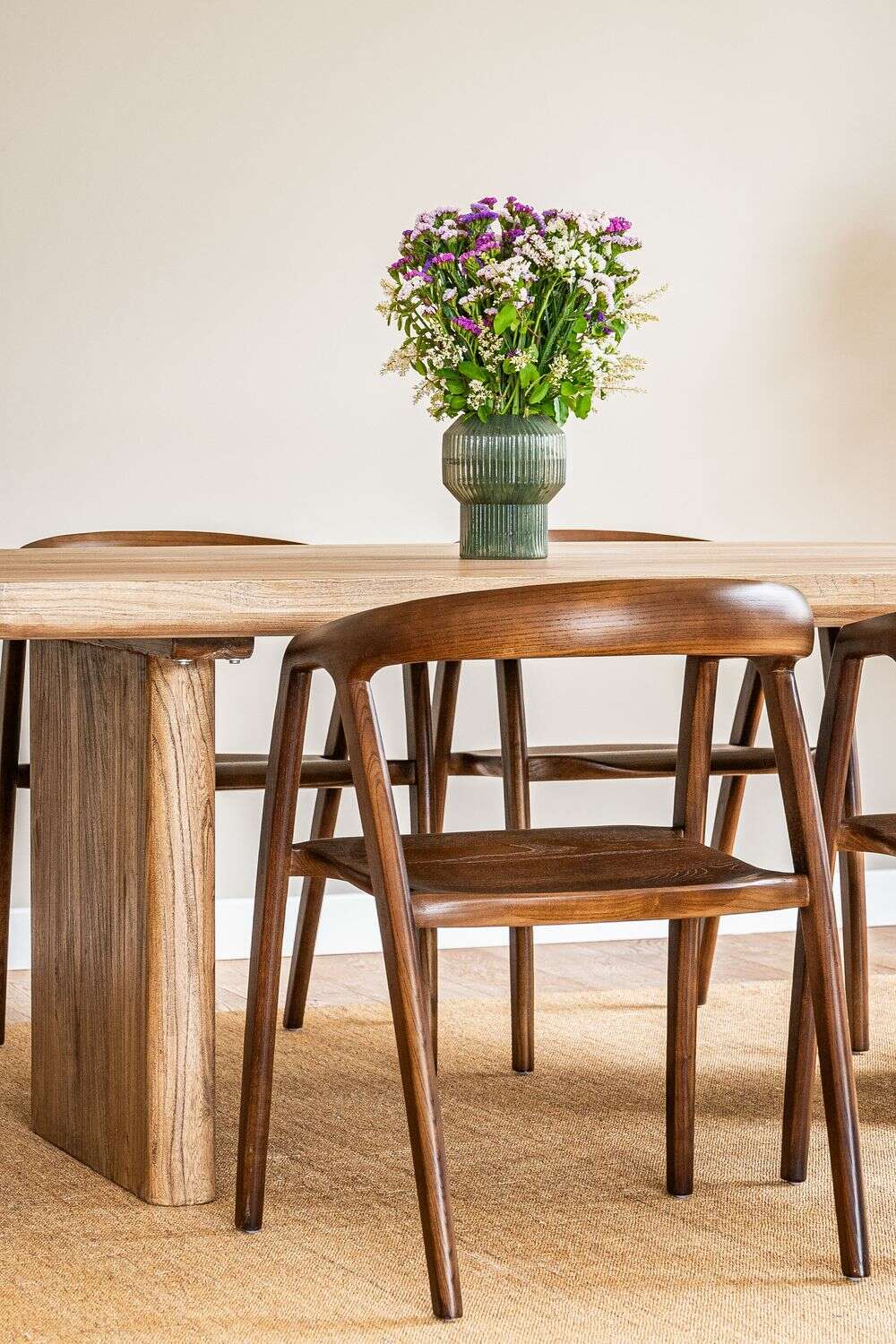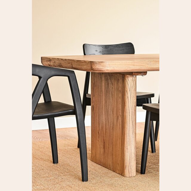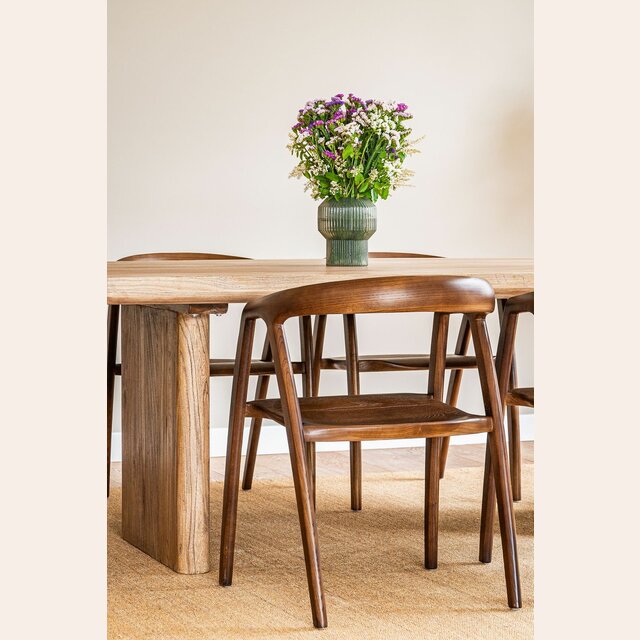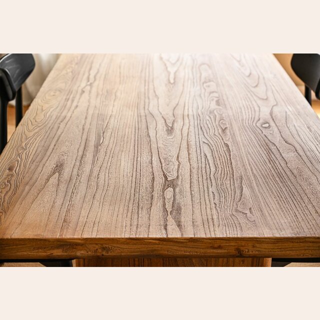 Mesa de comedor para 6 u 8 personas en madera de olmo antiguo recuperado con doble grosor en patas y tapa, en terminaciones curvas y redondeadas.