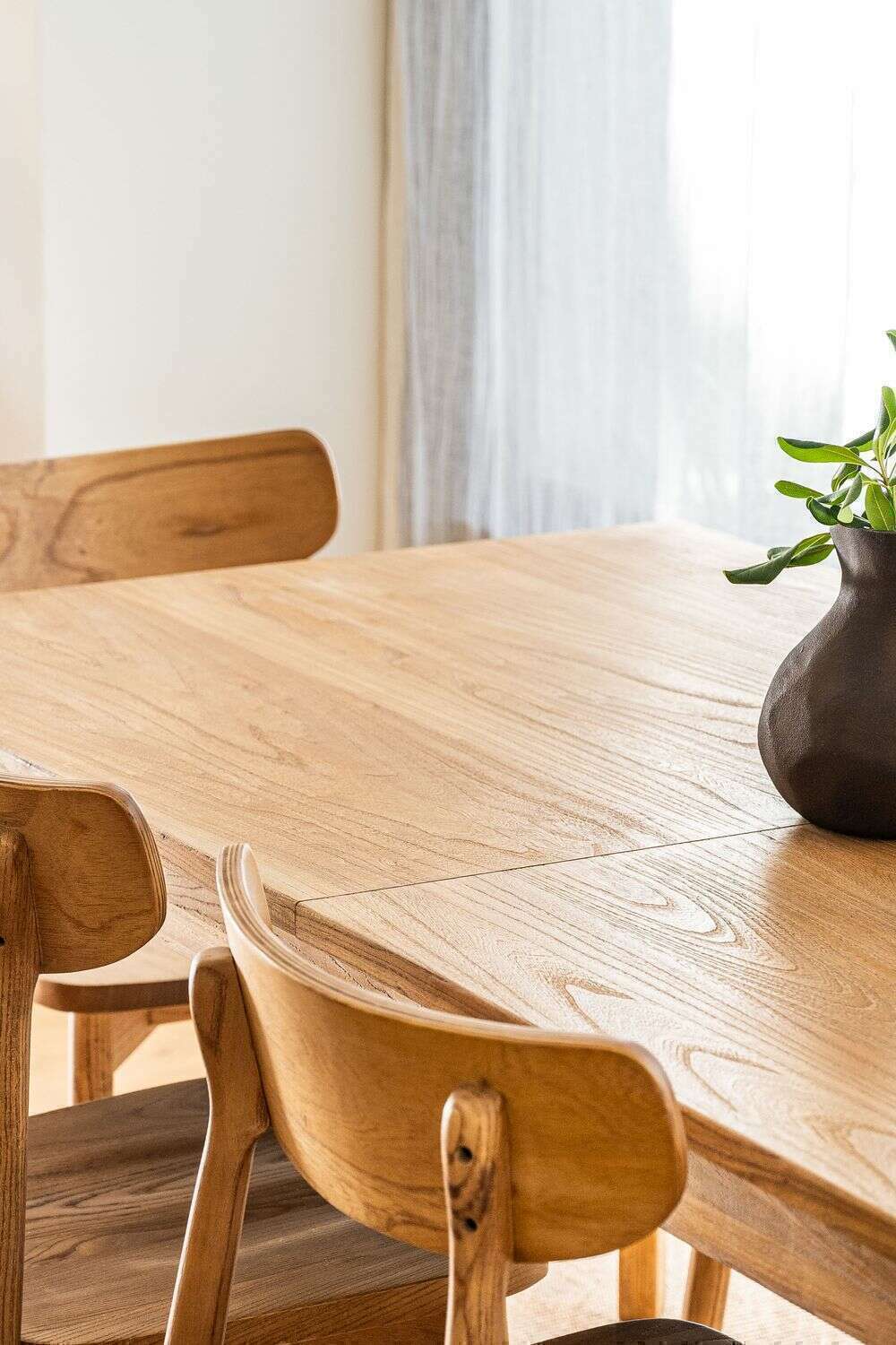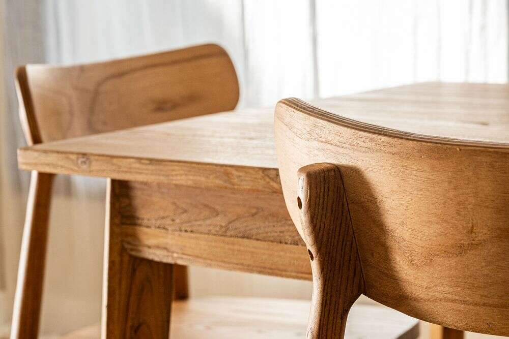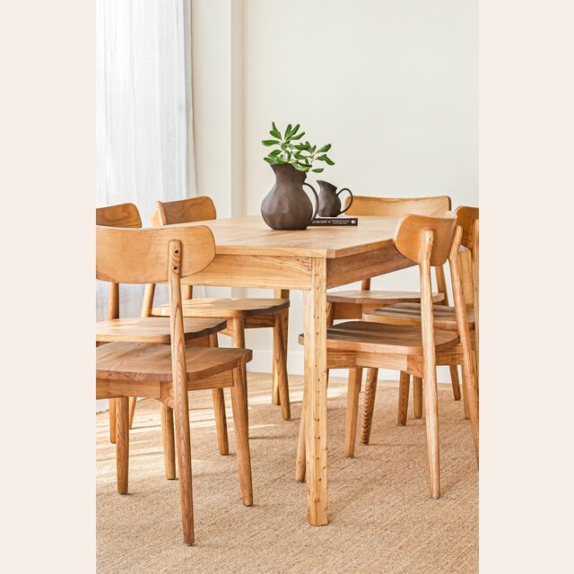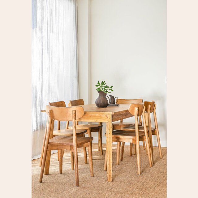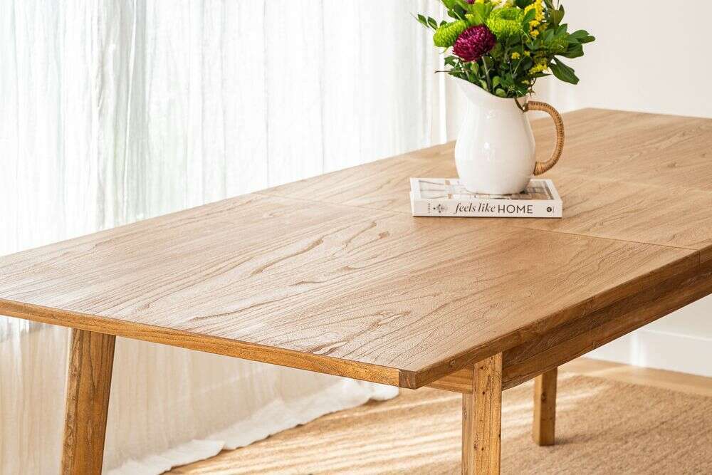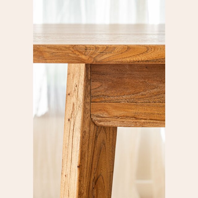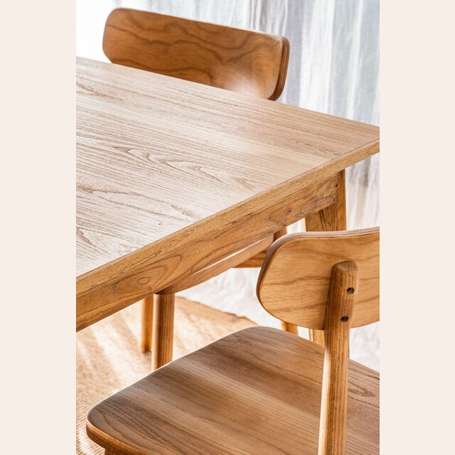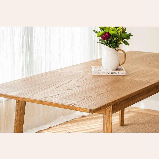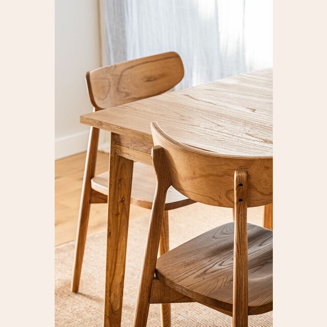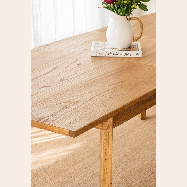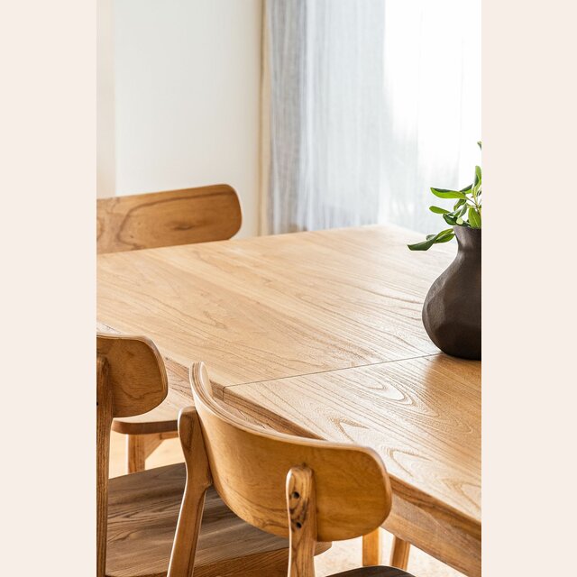 Mesa de comedor de línea minimalista en olmo antiguo lustre natural, con extensión de 50 cms.