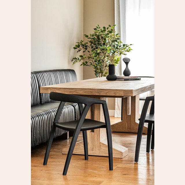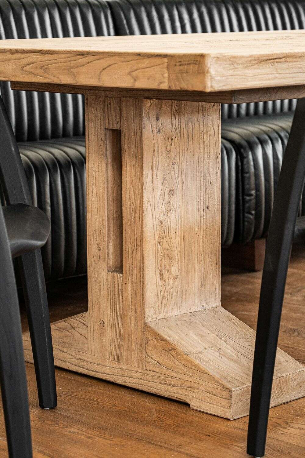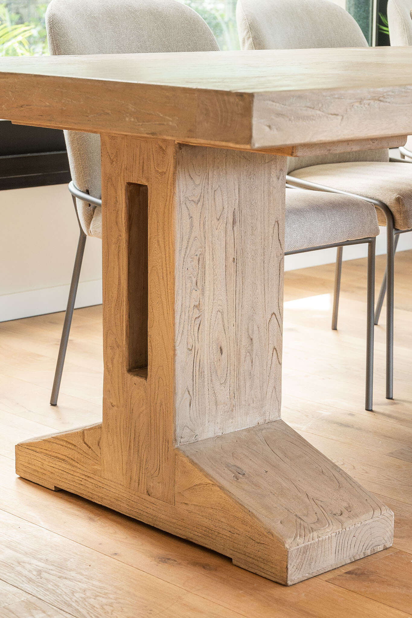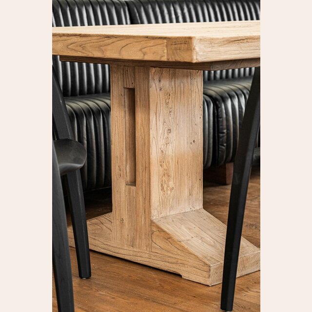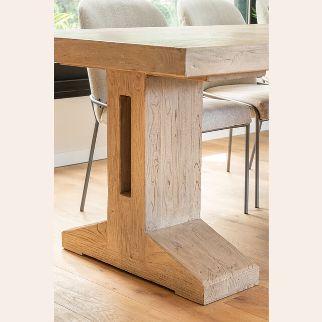 Impactante mesa de comedor de olmo antiguo reciclado en lustre natural, con base recta maciza de cómoda disposición para las piernas.