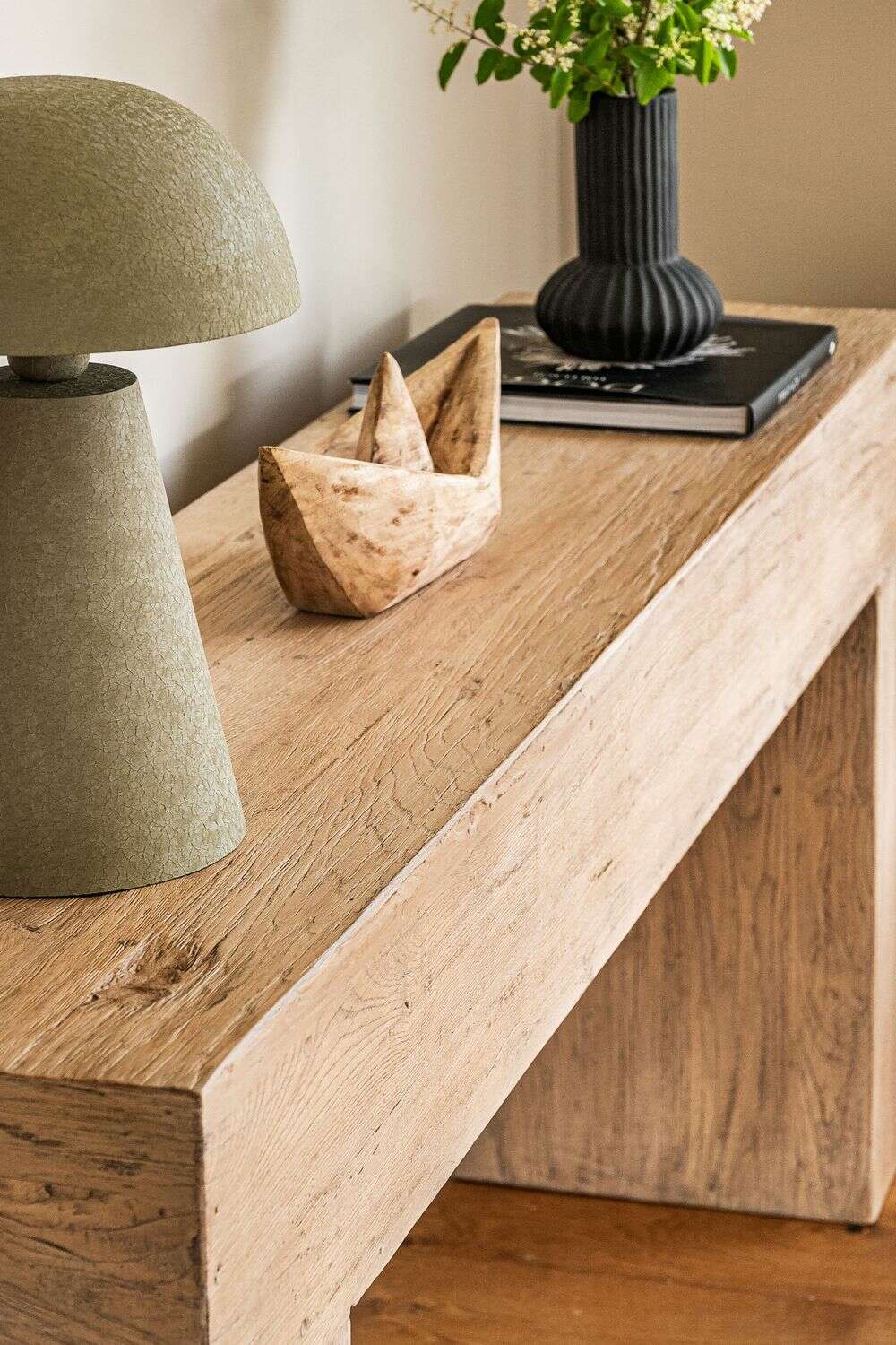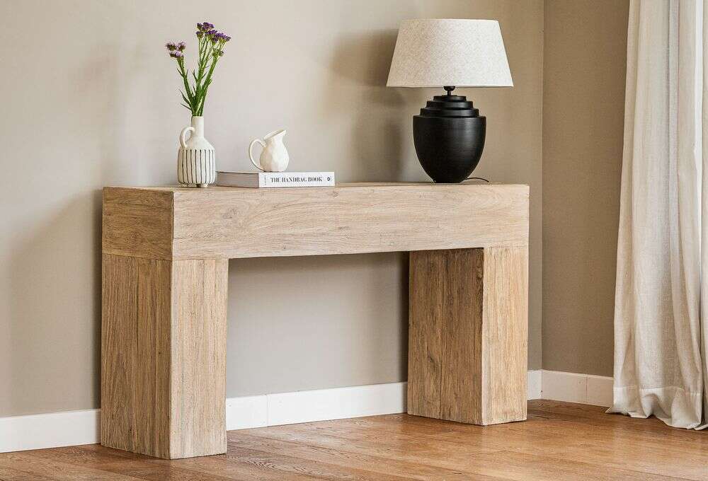 Impactante consola de olmo antiguo recuperado macizo en lustre natural, ideal para múltiples funciones: recibidor, detrás de sillón, hall de distribución, en espacios angostos...
