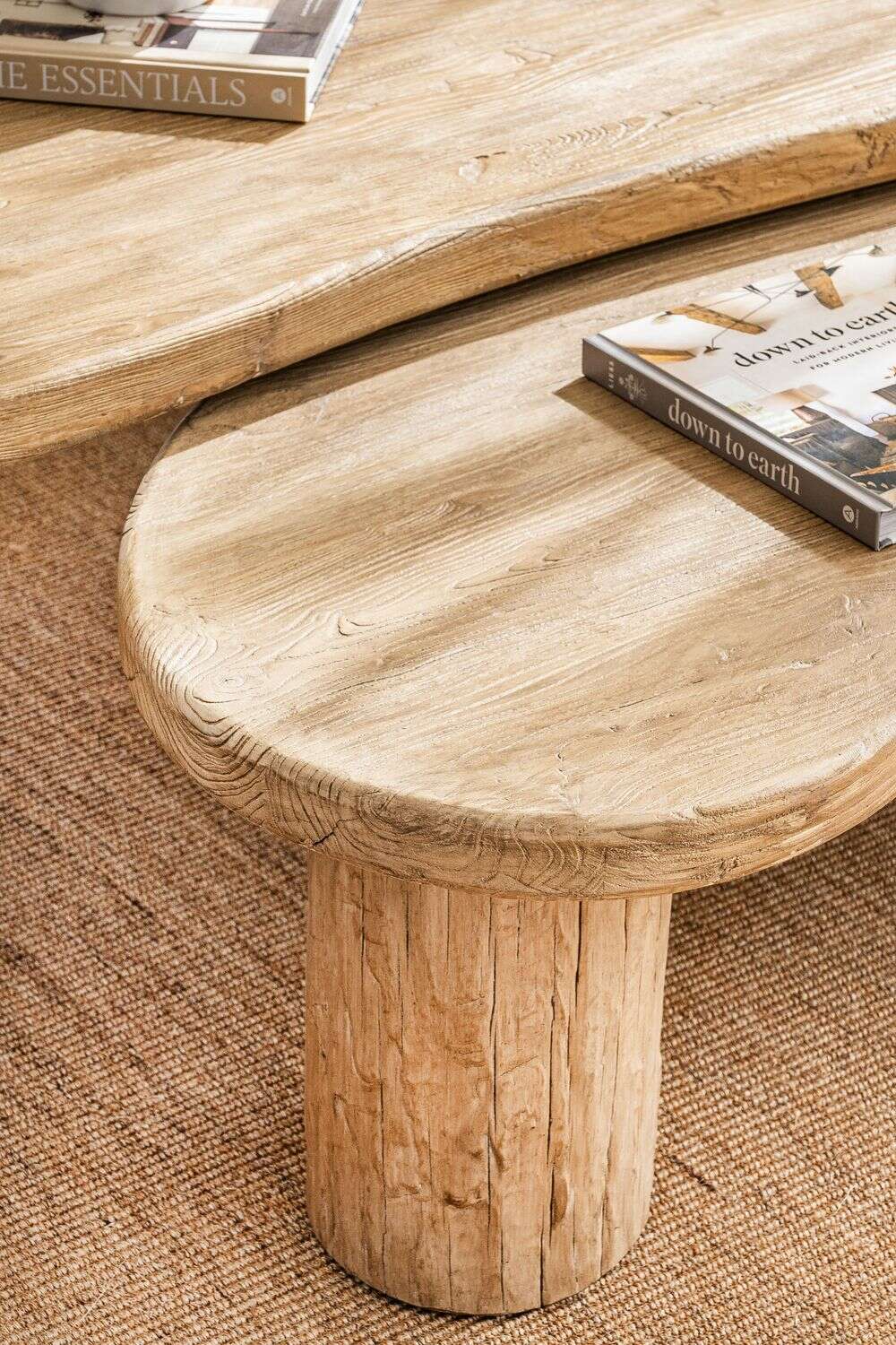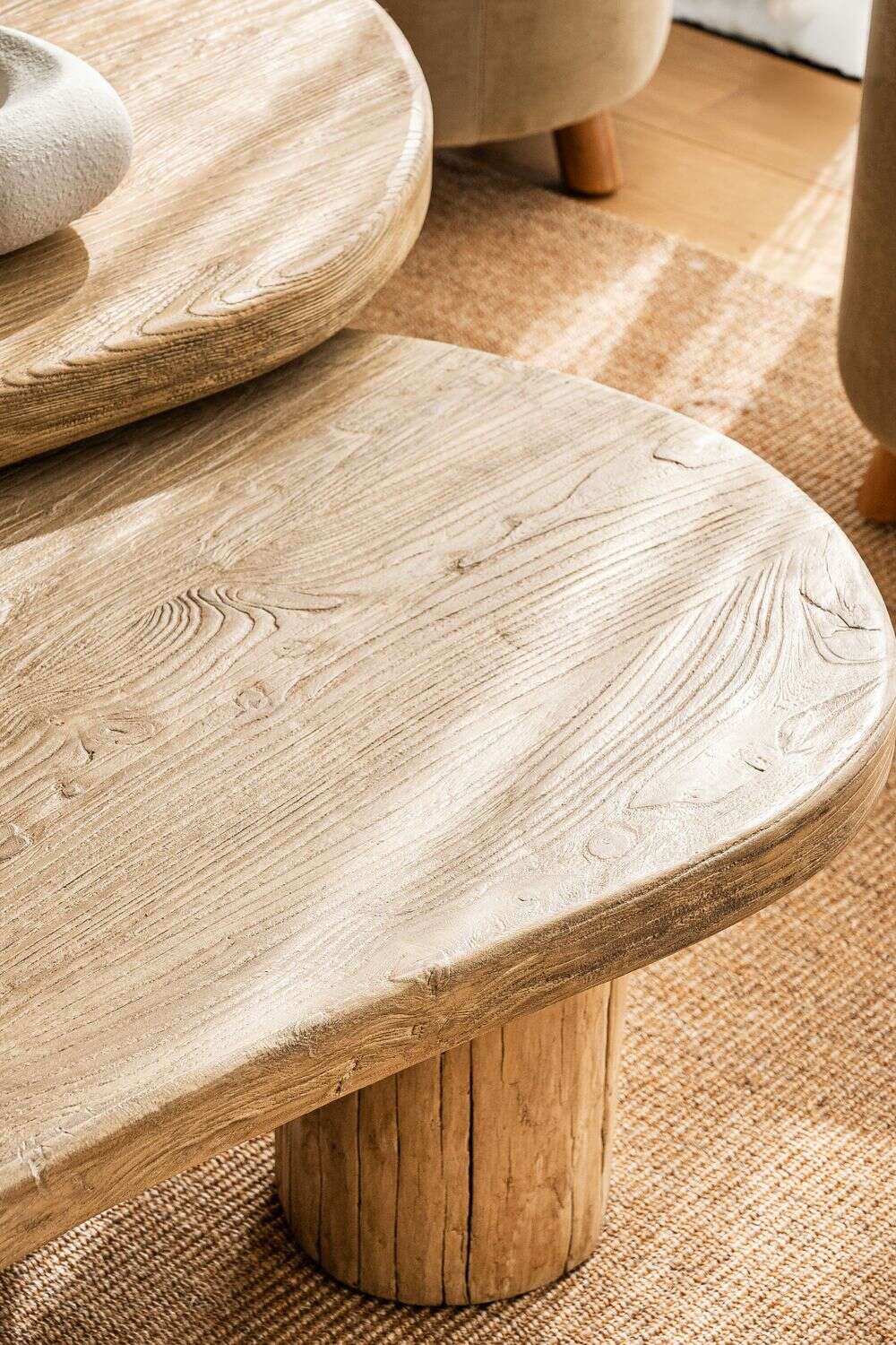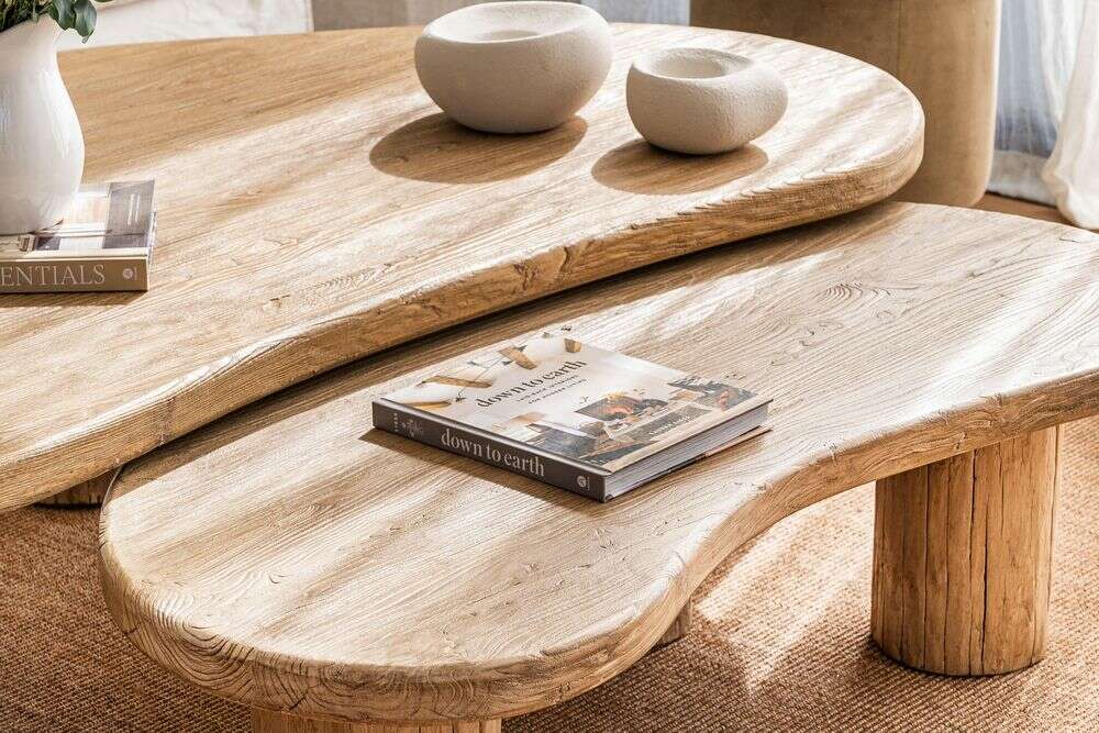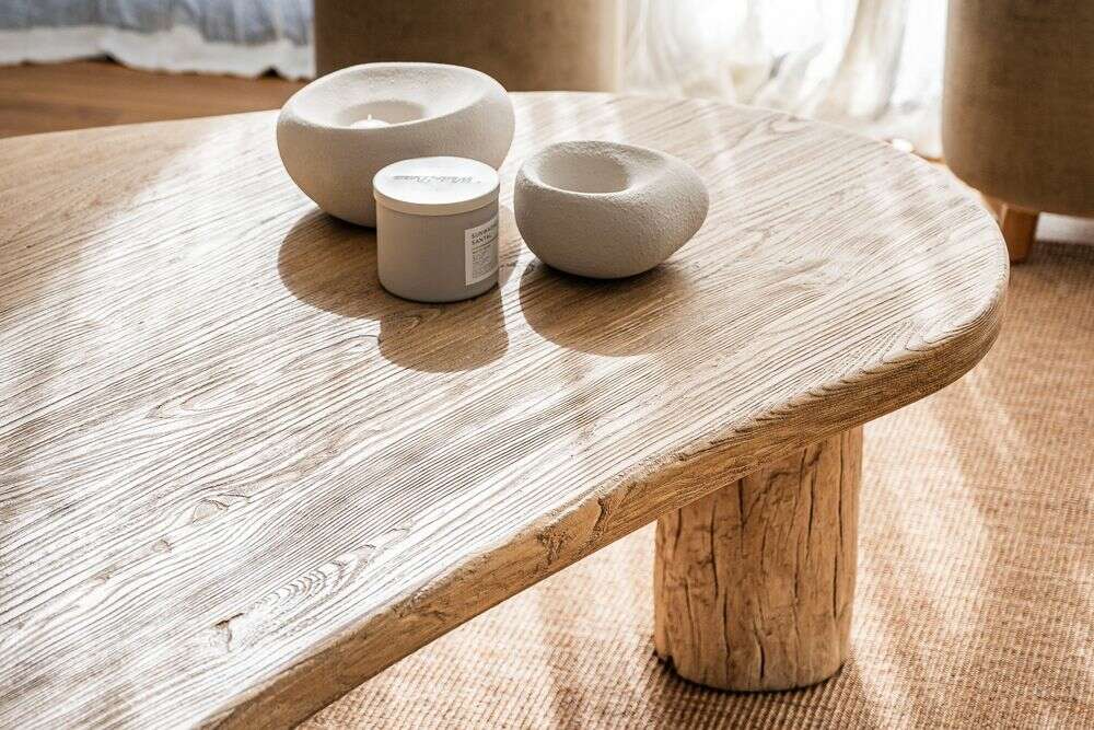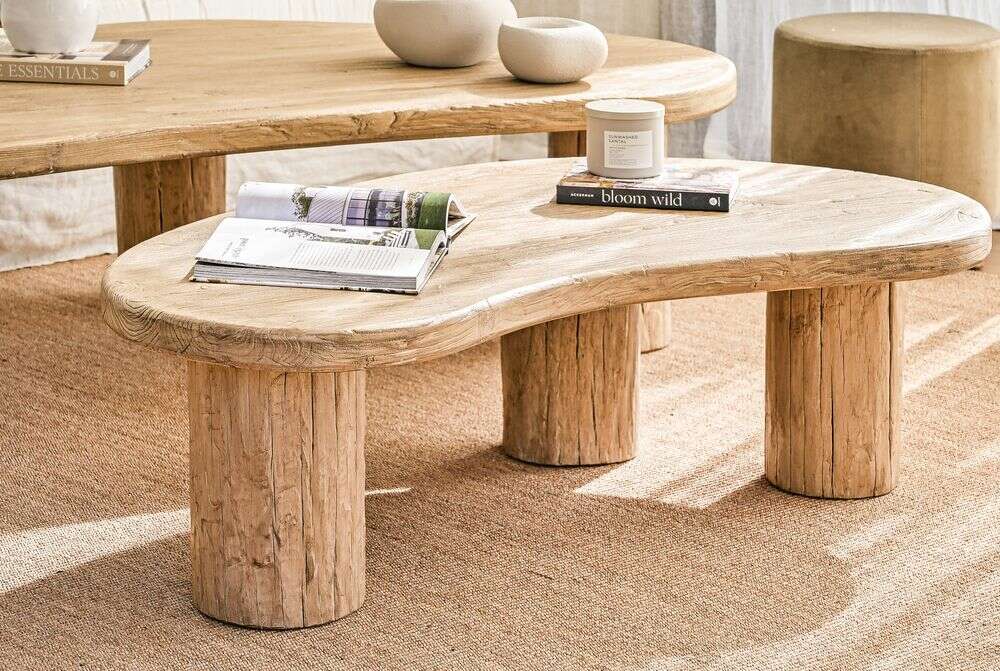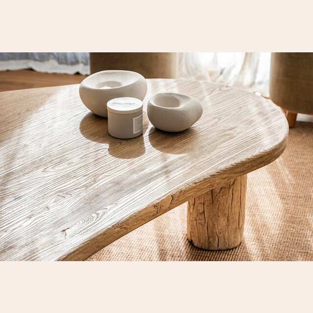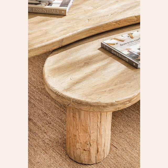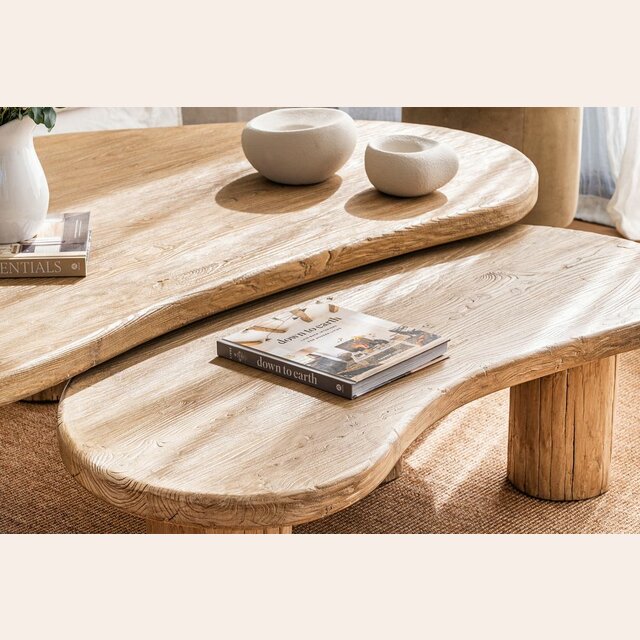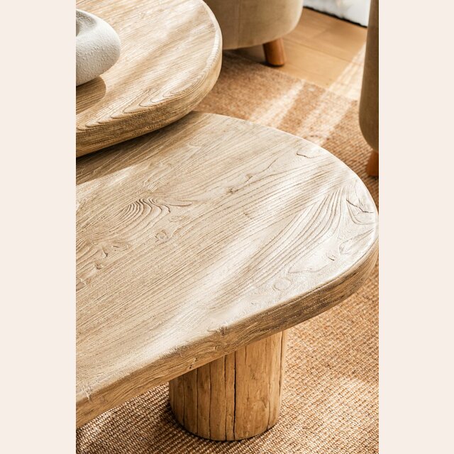 Mesa ratona de olmo antiguo en lustre natural con forma de ondas irregulares y bordes curvos.