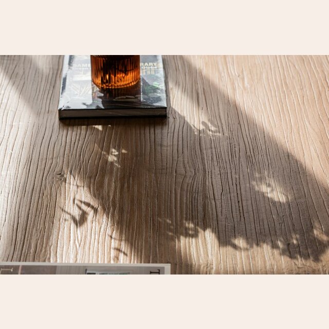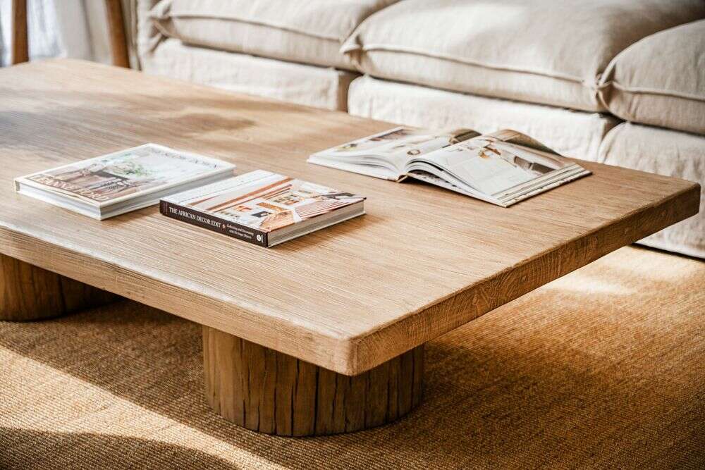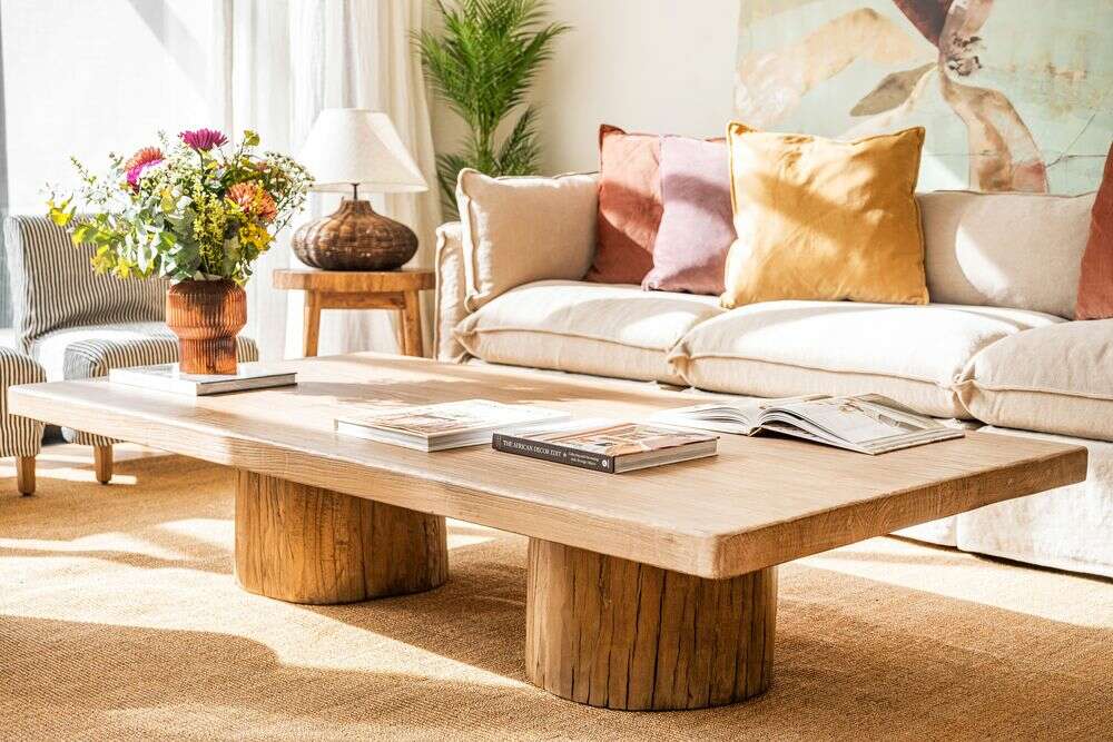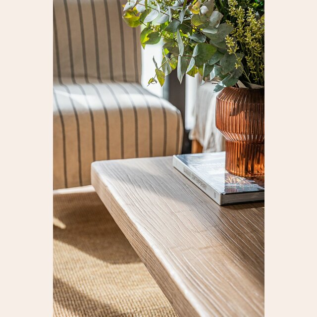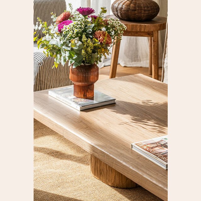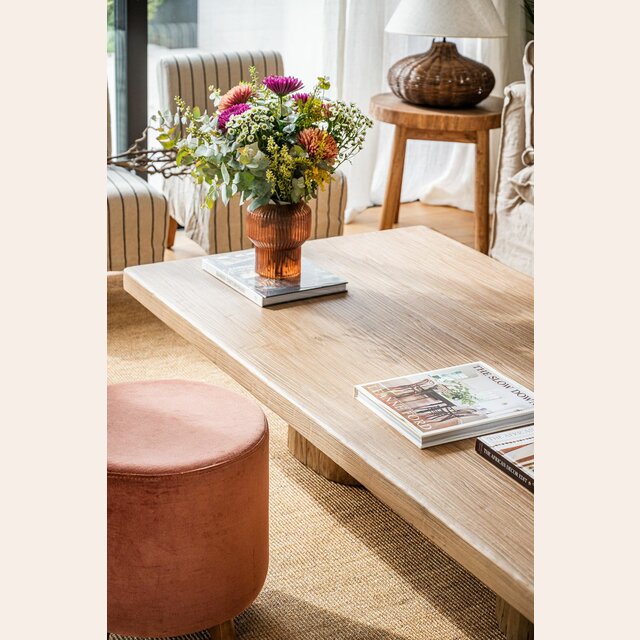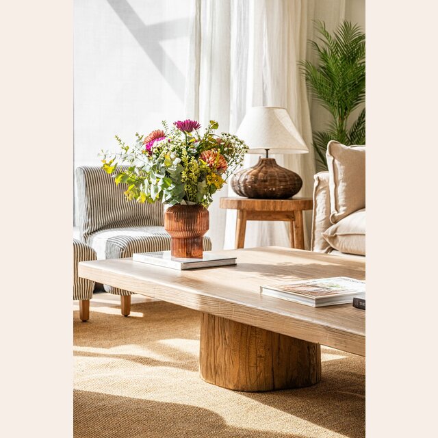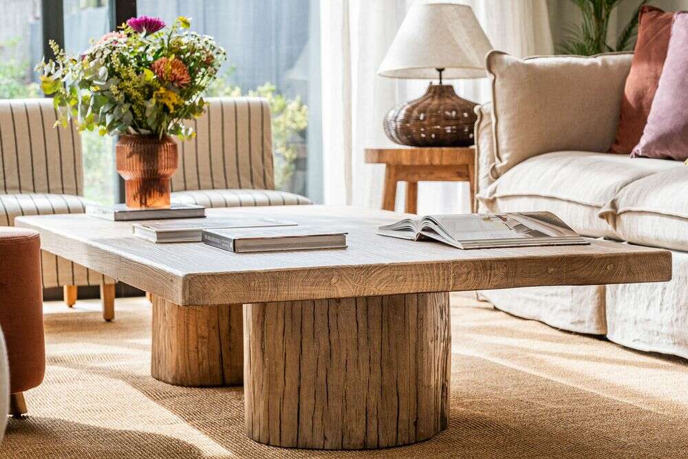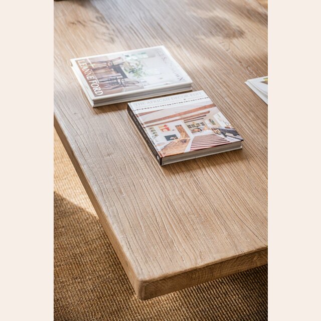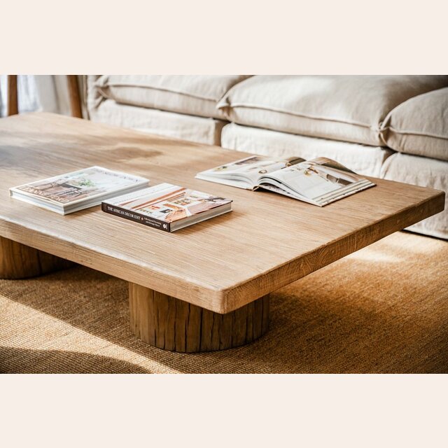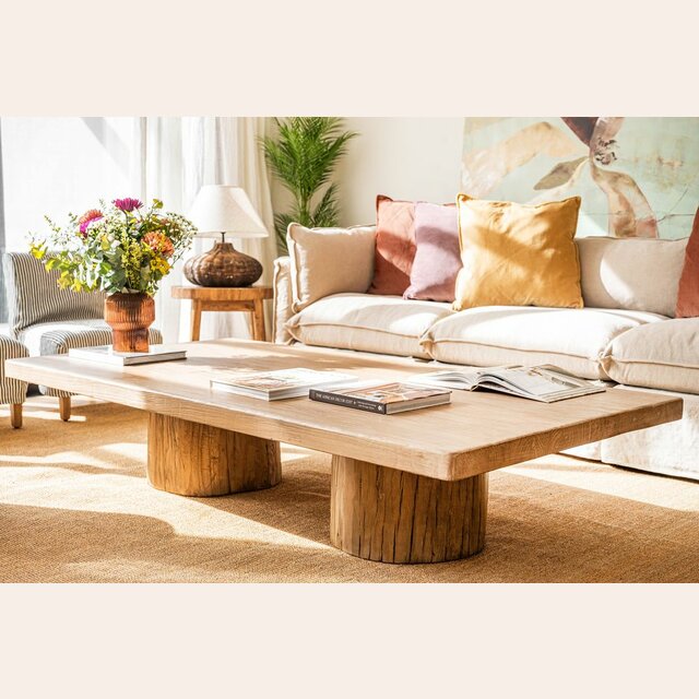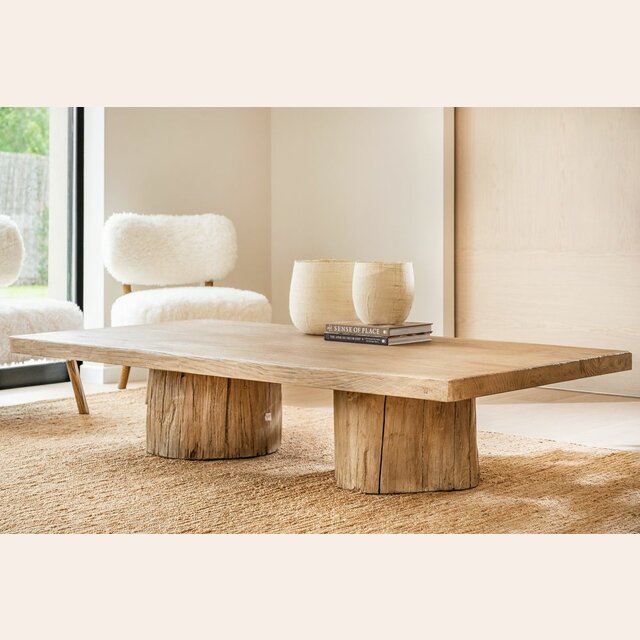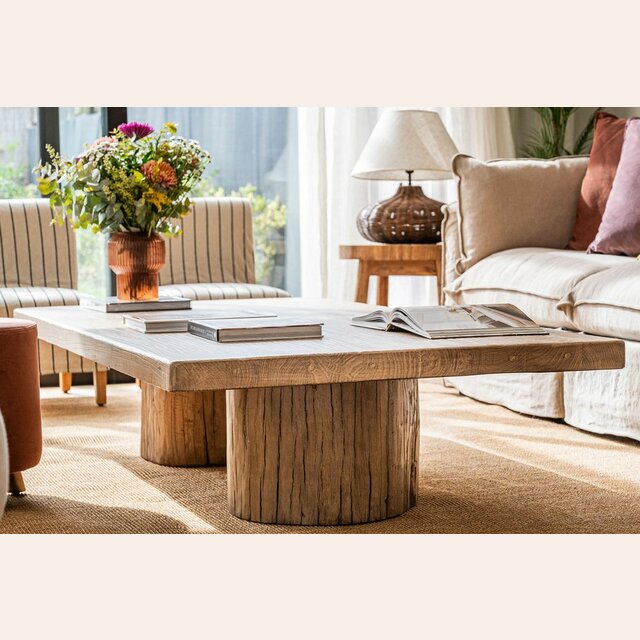 Exclusiva colección de mesas ratonas con base de troncos macizos y tapa de olmo antiguo reciclado en suave lustre natural.