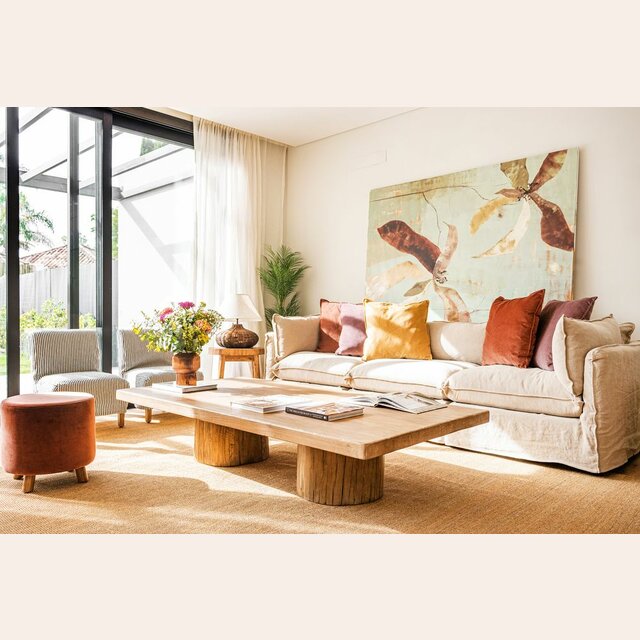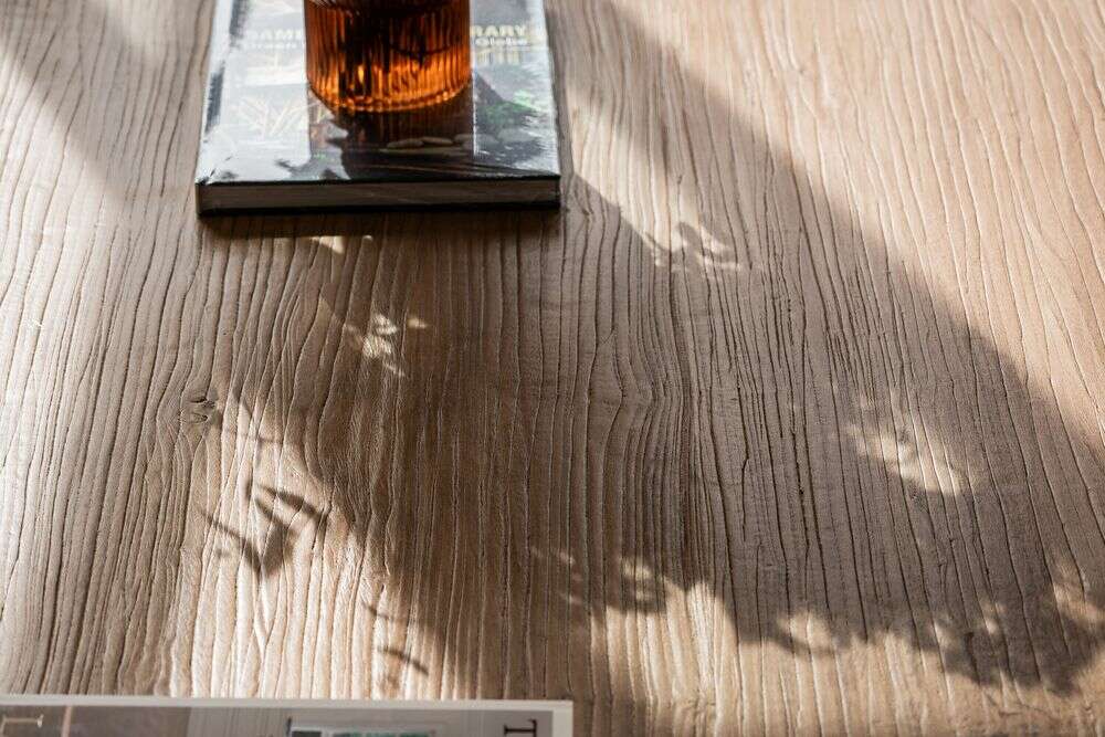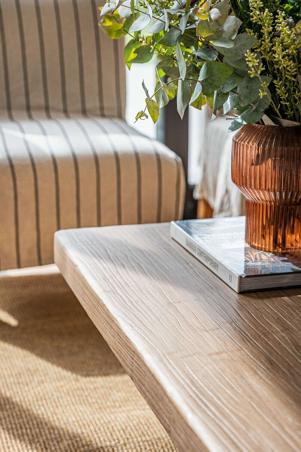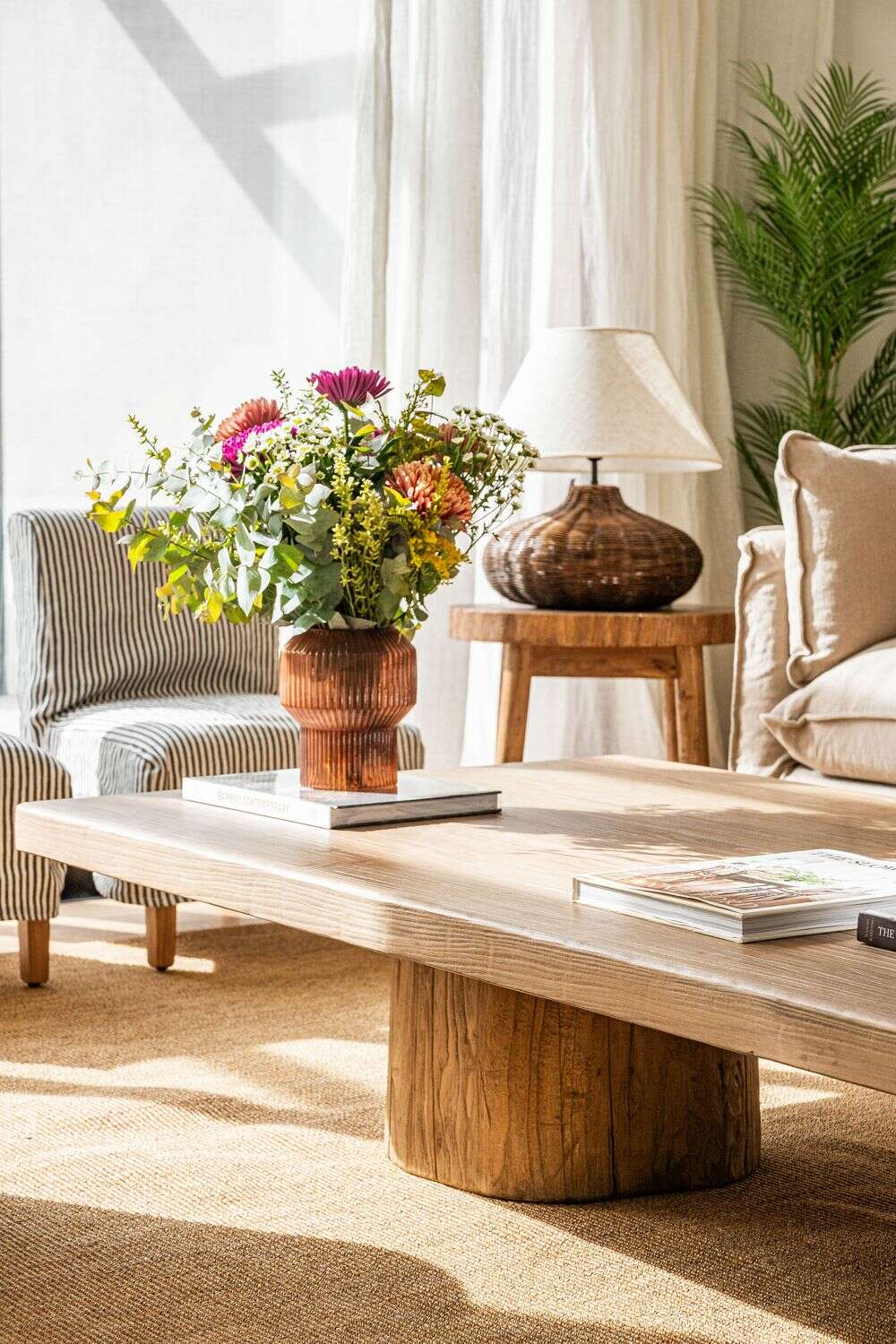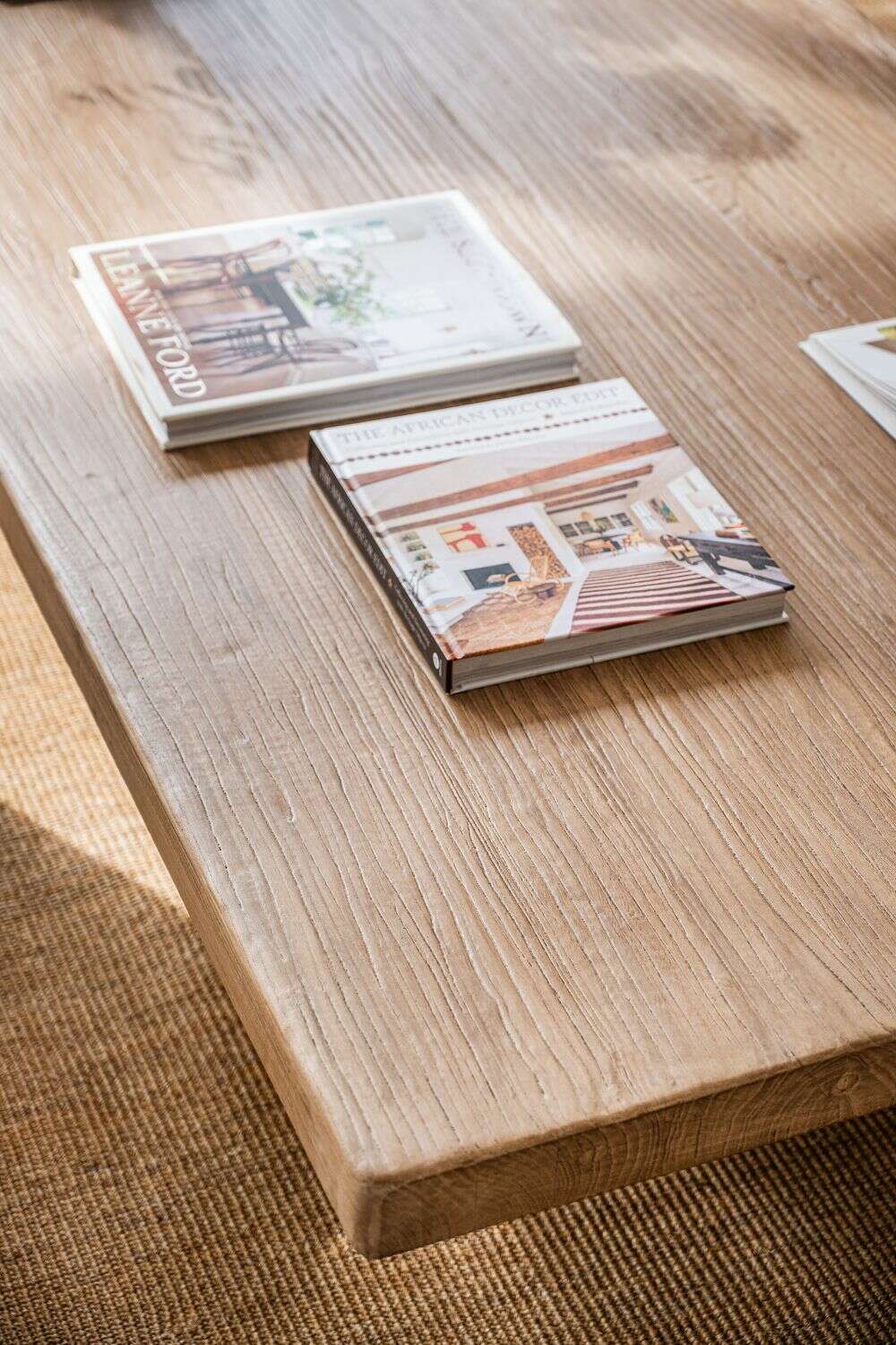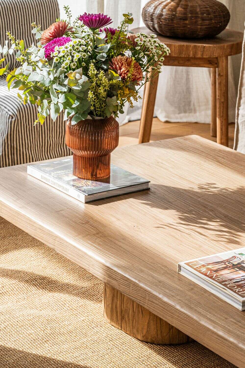 Exclusiva colección de mesas ratonas con base de troncos macizos y tapa de olmo antiguo reciclado en suave lustre natural.