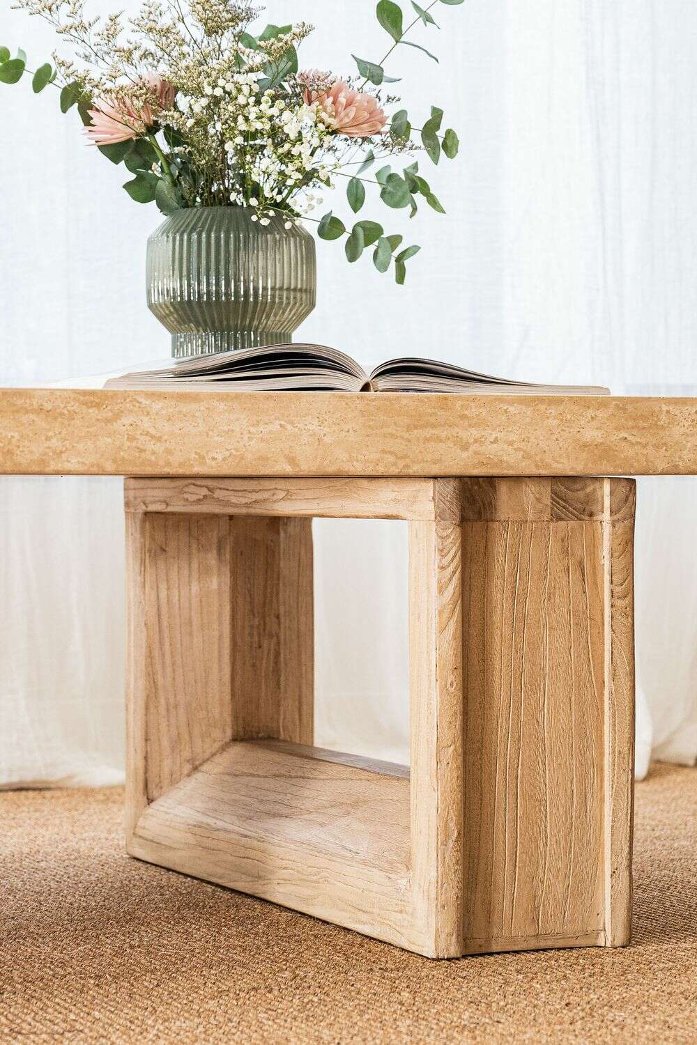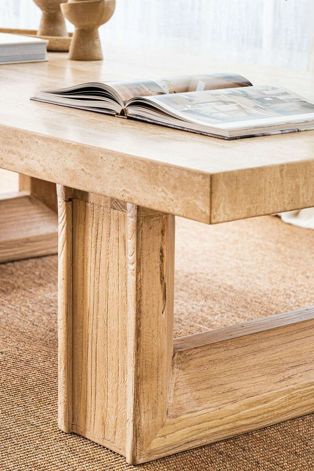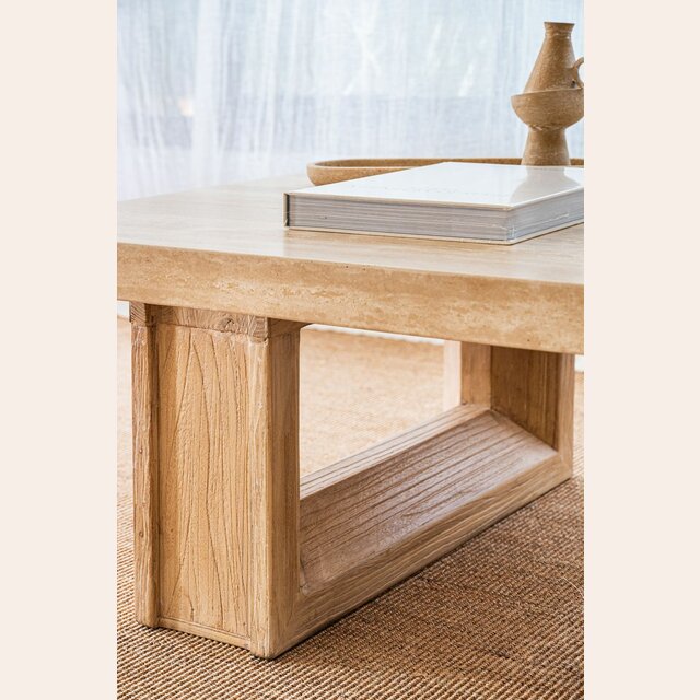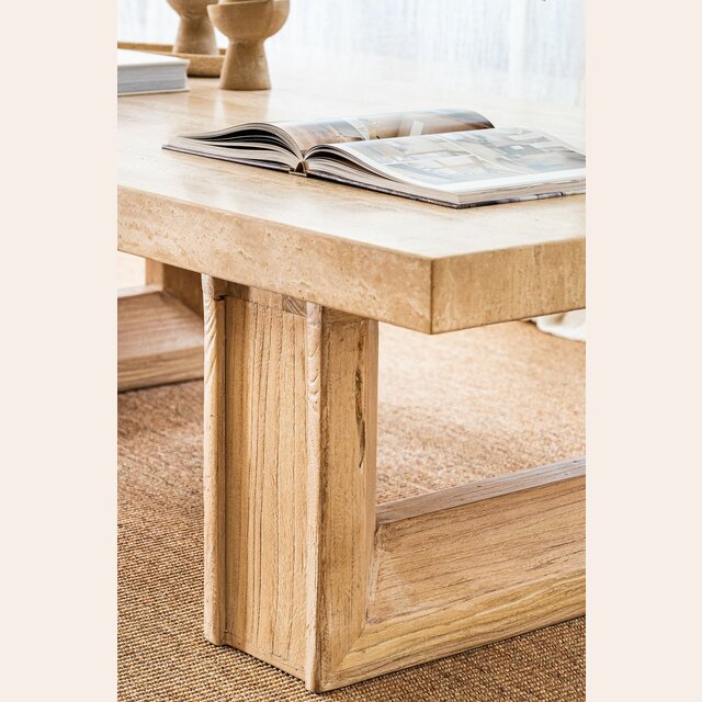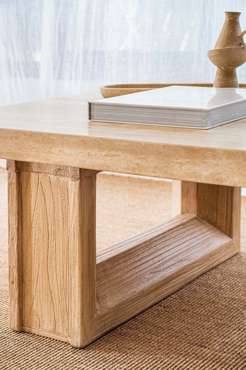 Impactante pieza para mesa de centro con estructura de olmo macizo antiguo en lustre natural y tapa de travertino natural de gran espesor.