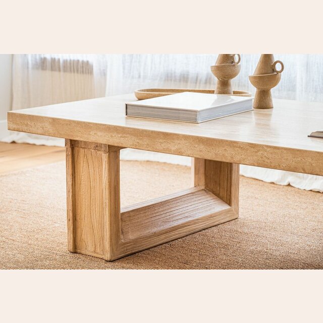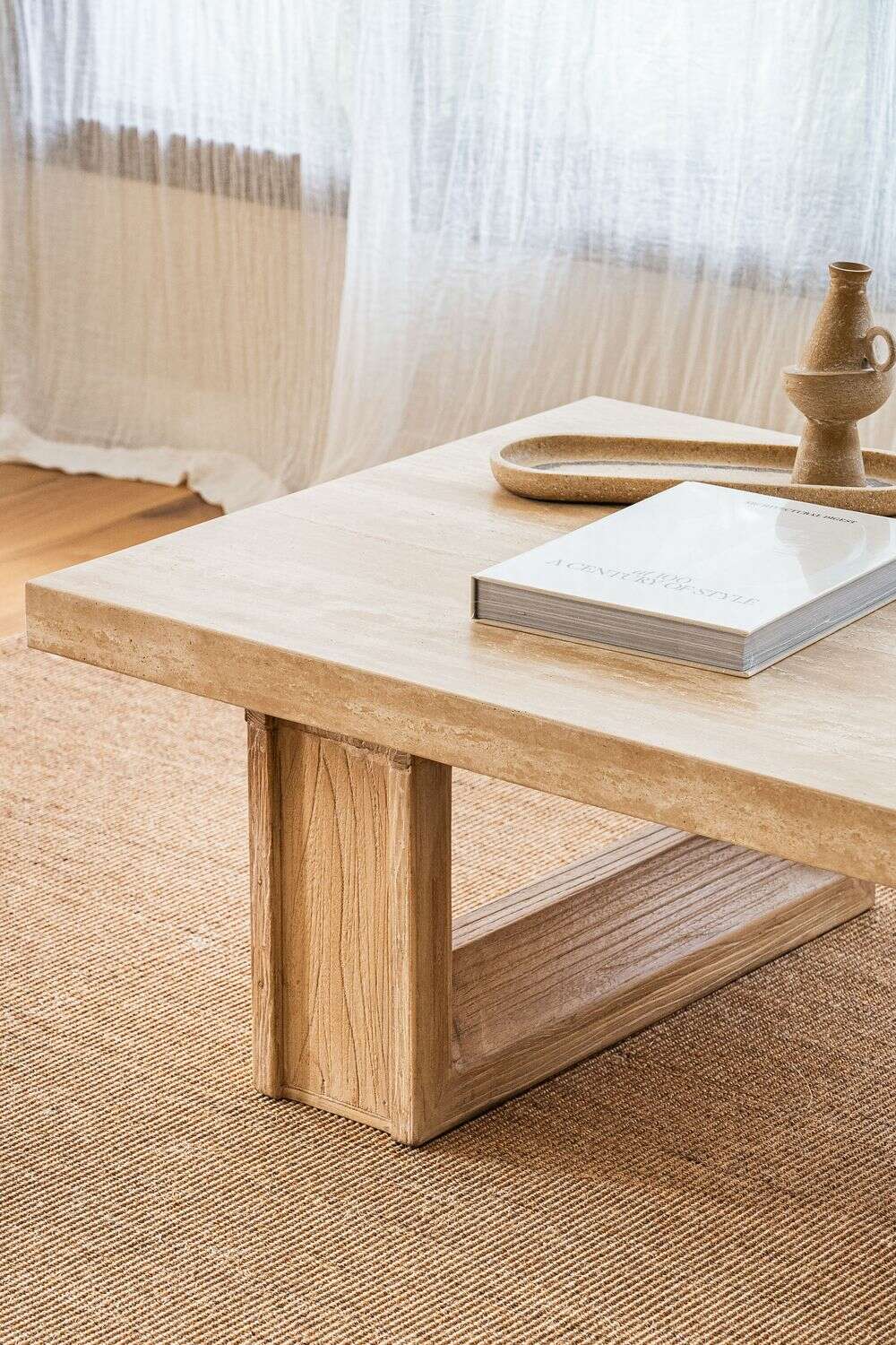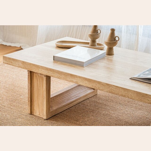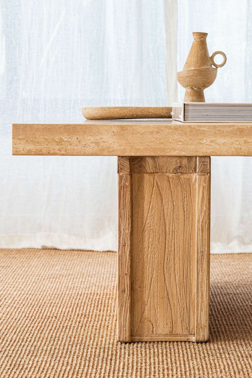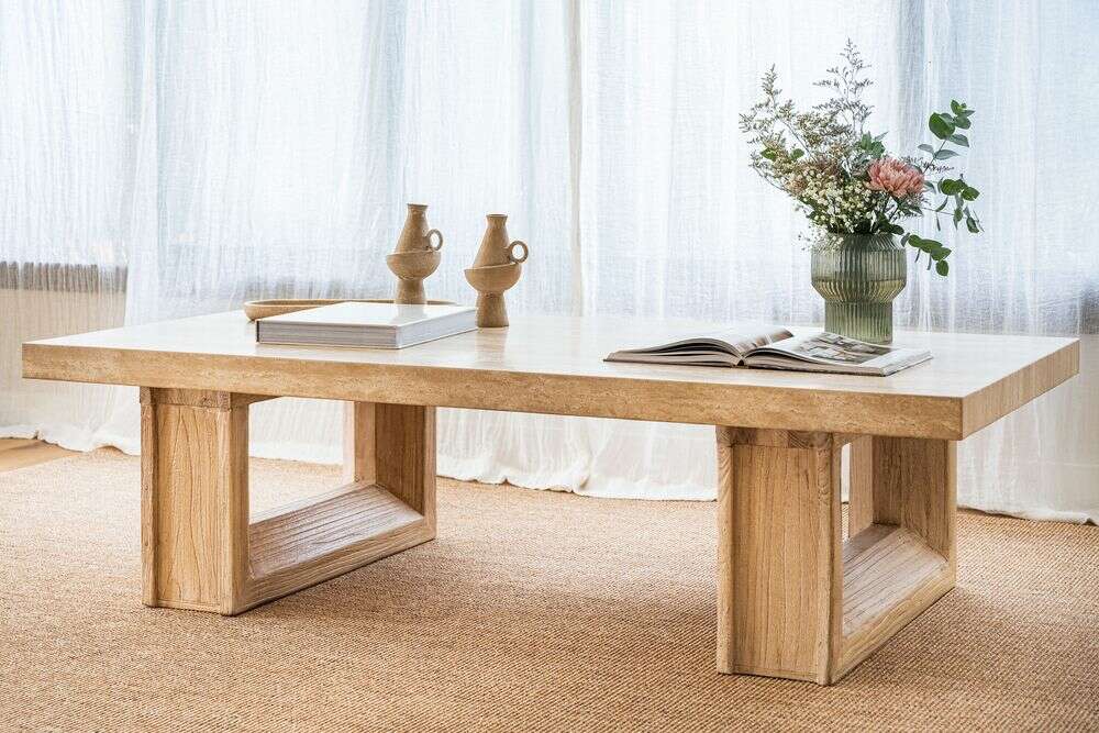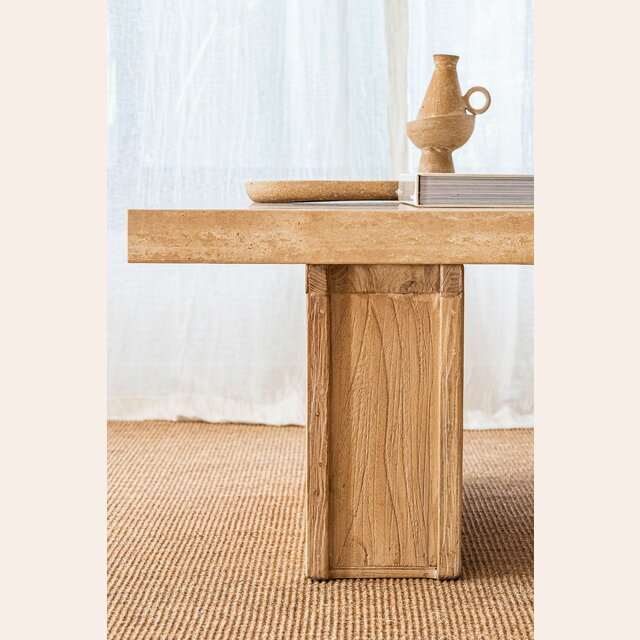 Impactante pieza para mesa de centro con estructura de olmo macizo antiguo en lustre natural y tapa de travertino natural de gran espesor.