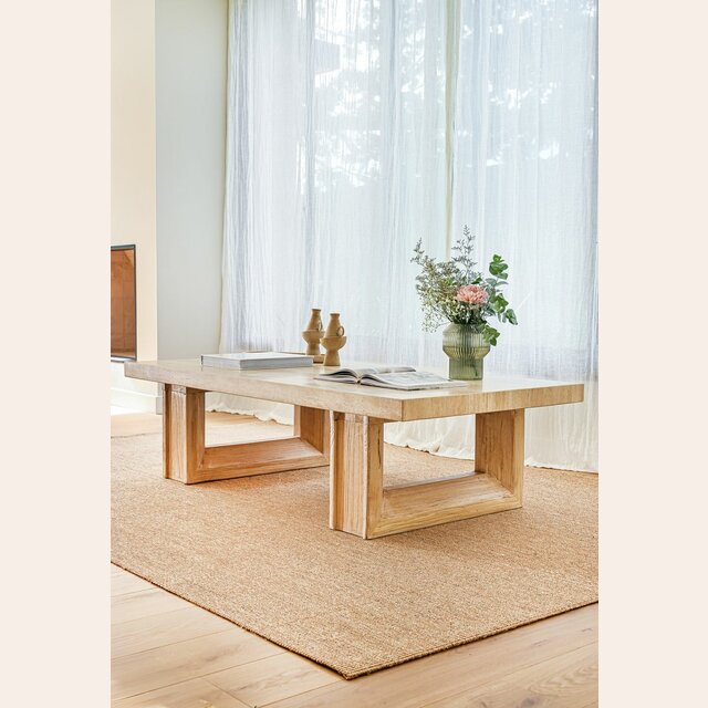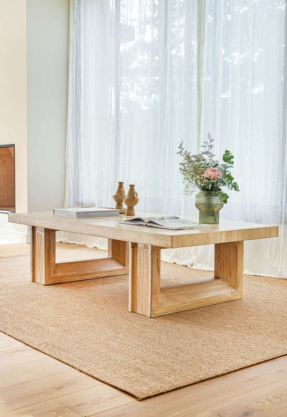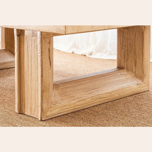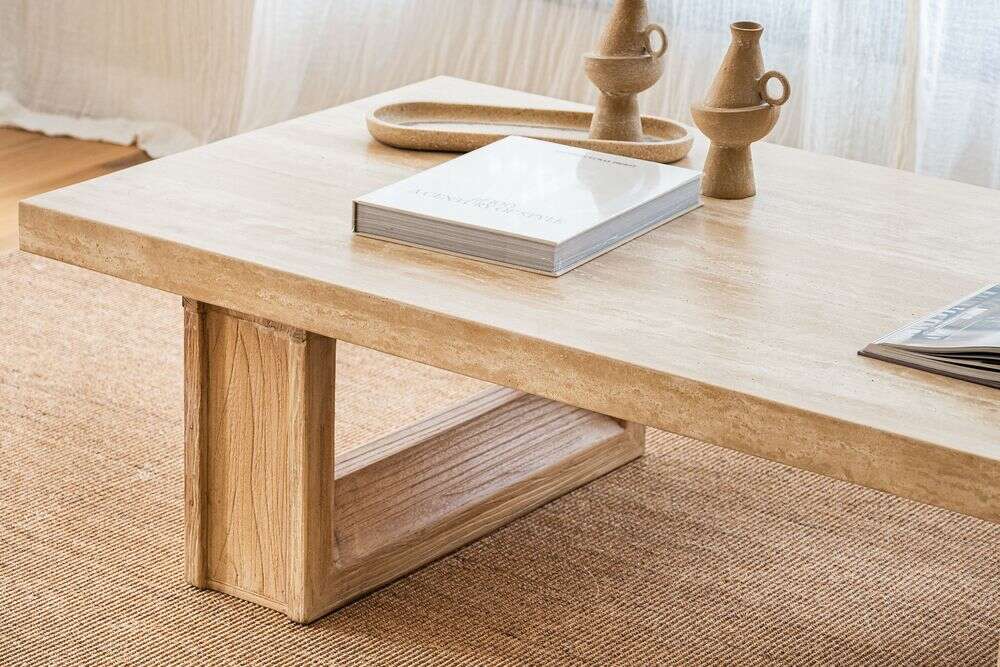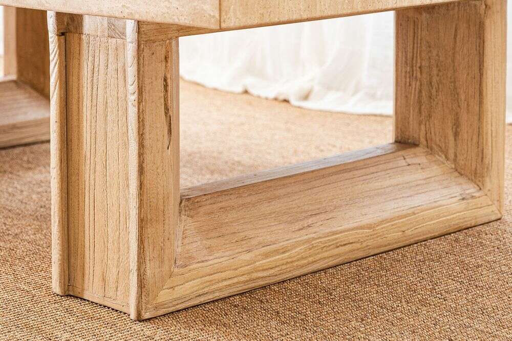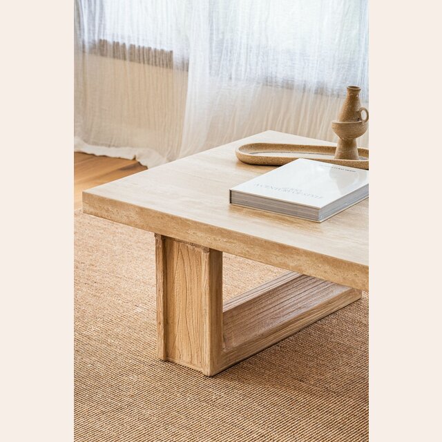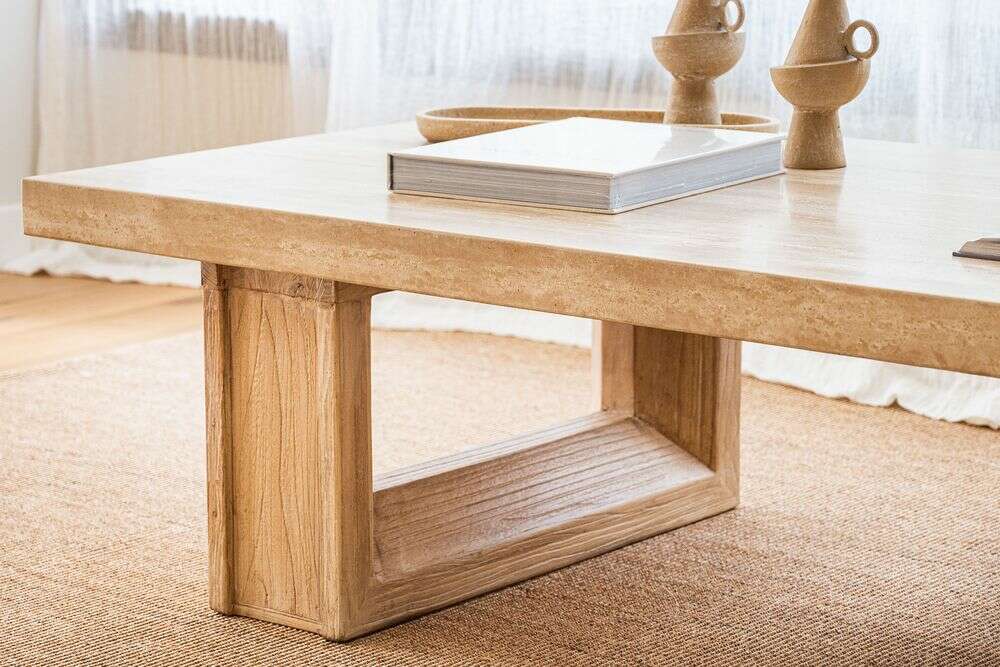 Impactante pieza para mesa de centro con estructura de olmo macizo antiguo en lustre natural y tapa de travertino natural de gran espesor.