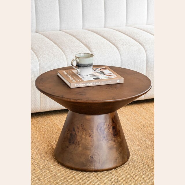Mesa redonda de base cónica con estructura en mdf y revestimiento símil raíz.