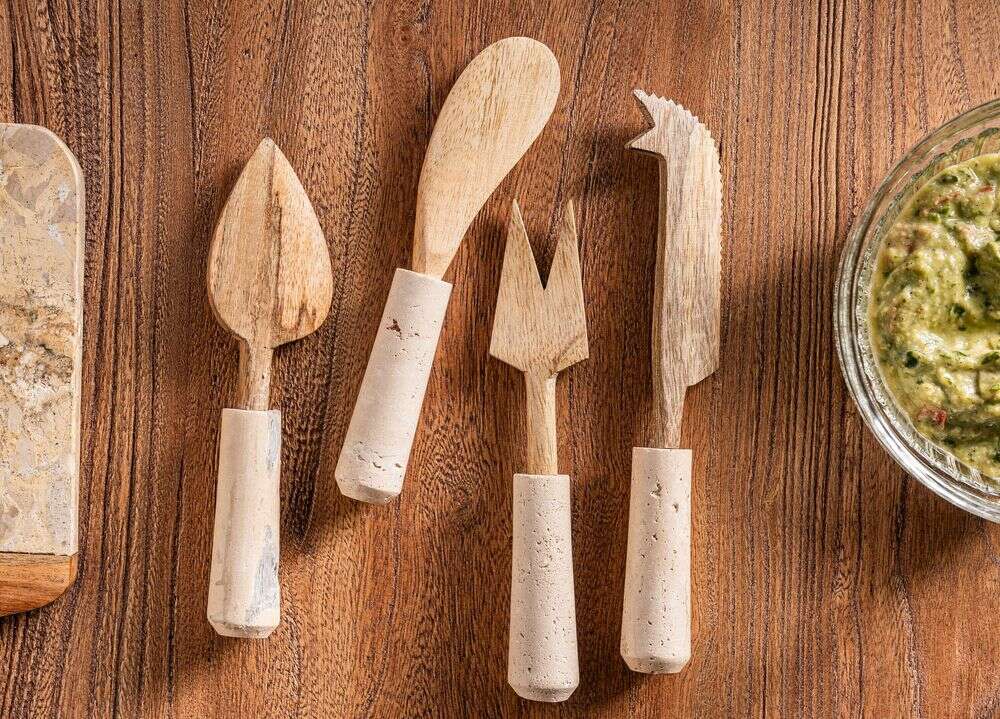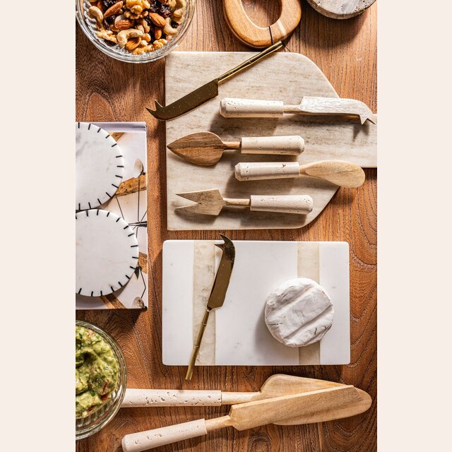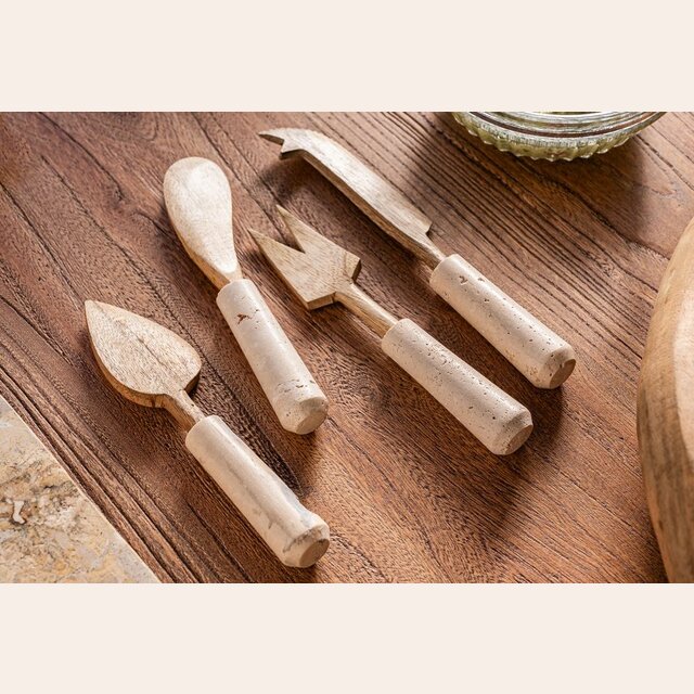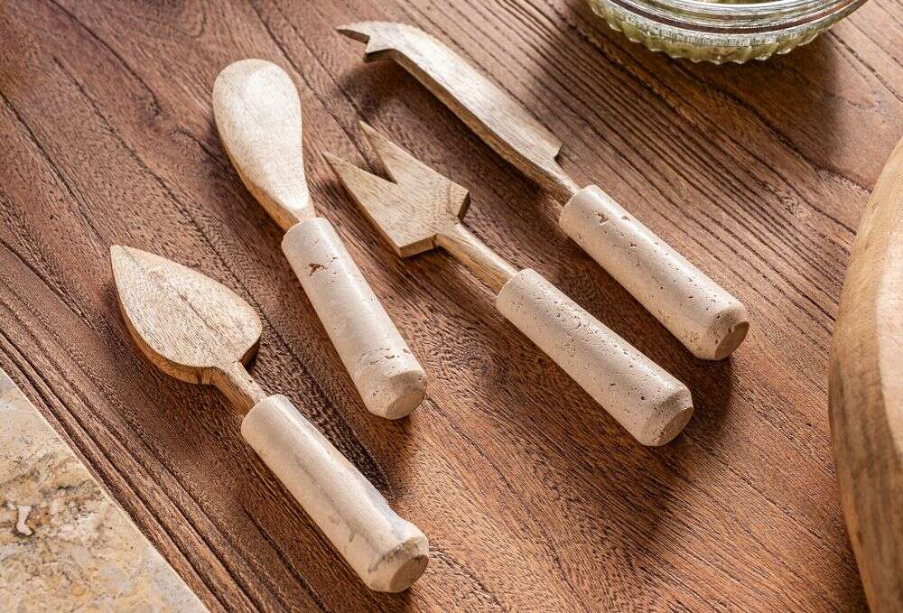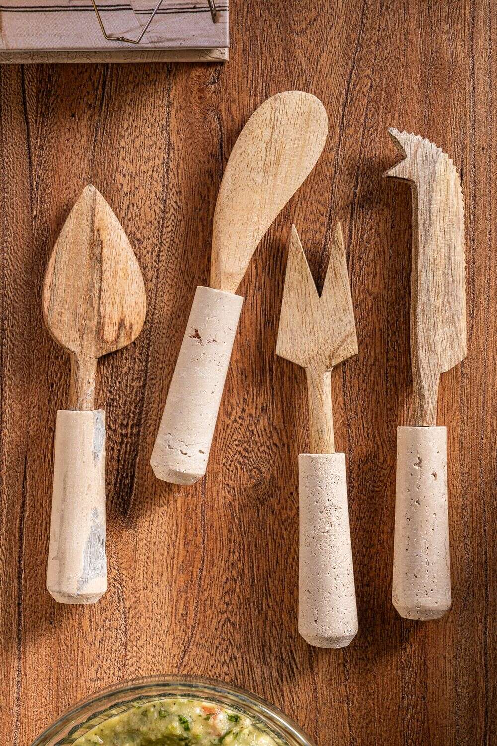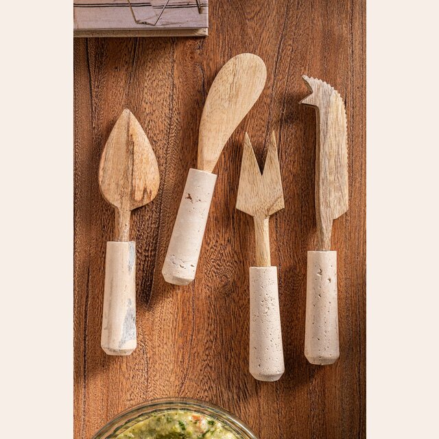 SET 4 CUCHILLOS DE QUESO MADERA Y TRAVERTINO