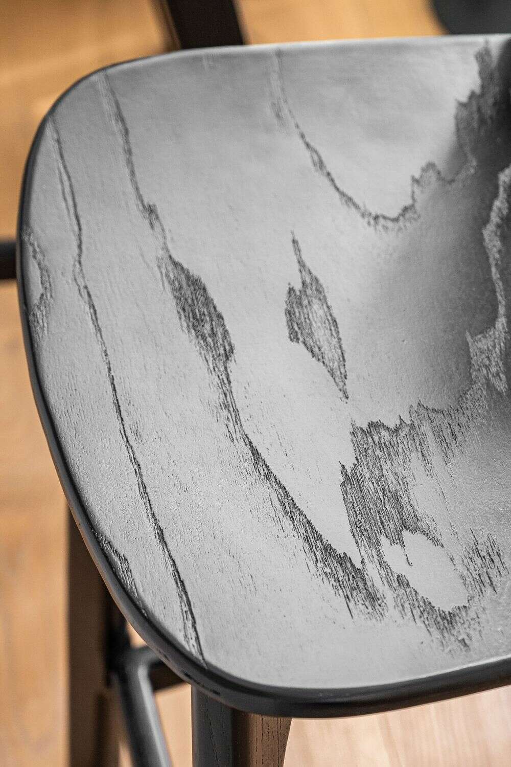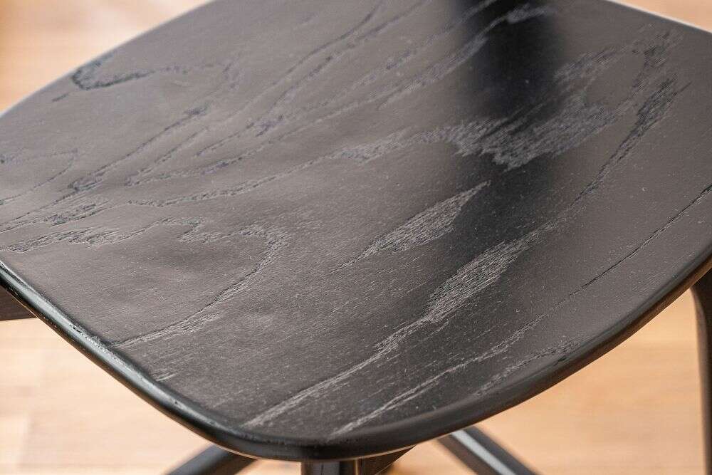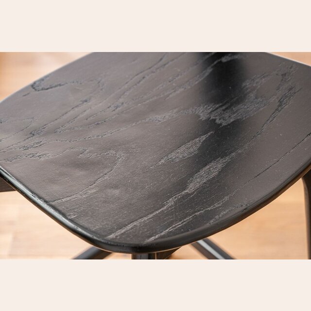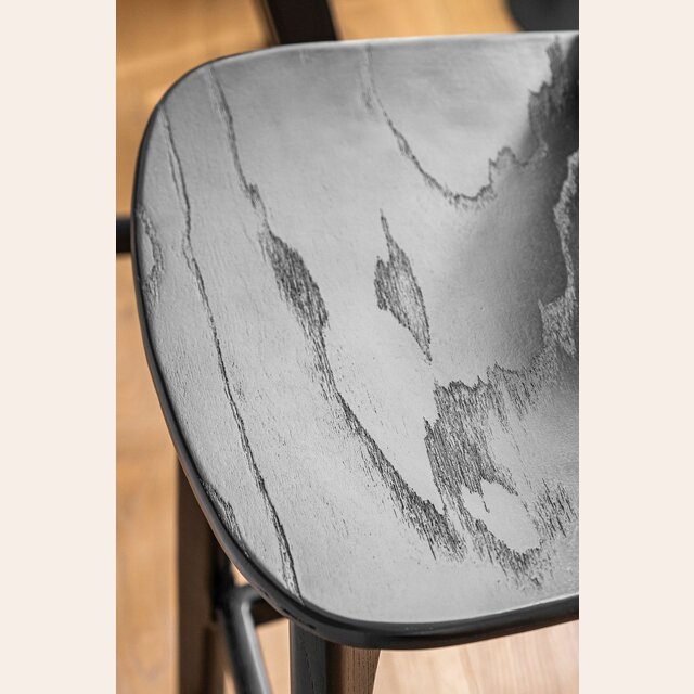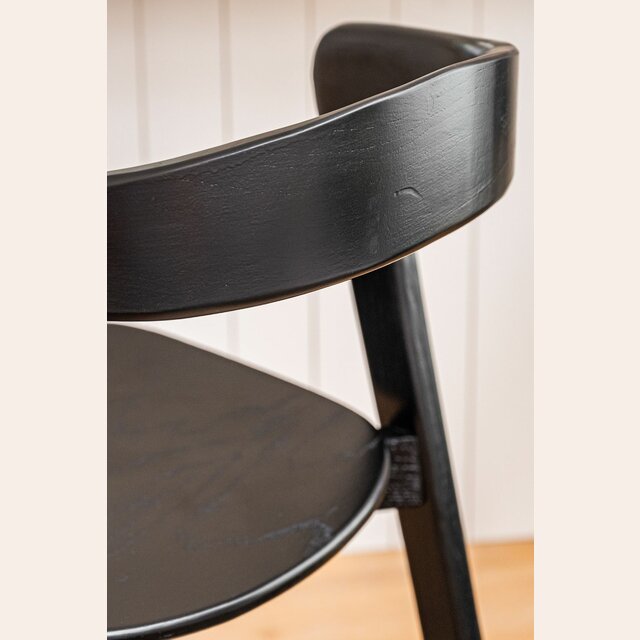 Amplia y comodísima silla alta para isla o bar: estructura de olmo macizo en lustre total black, asiento ergonómico y alucinantes curvas en asiento y espalda.