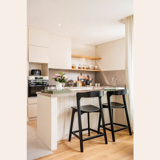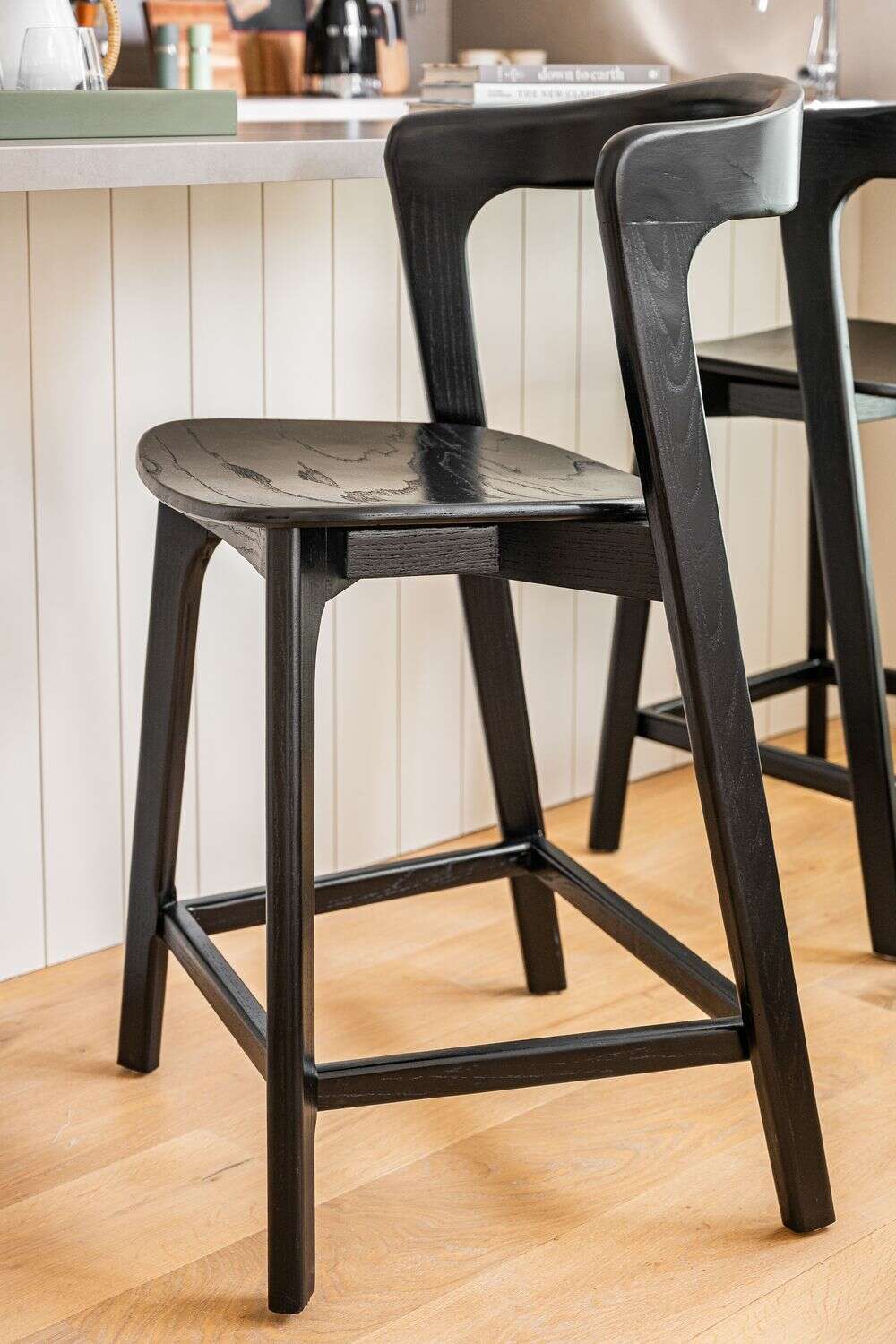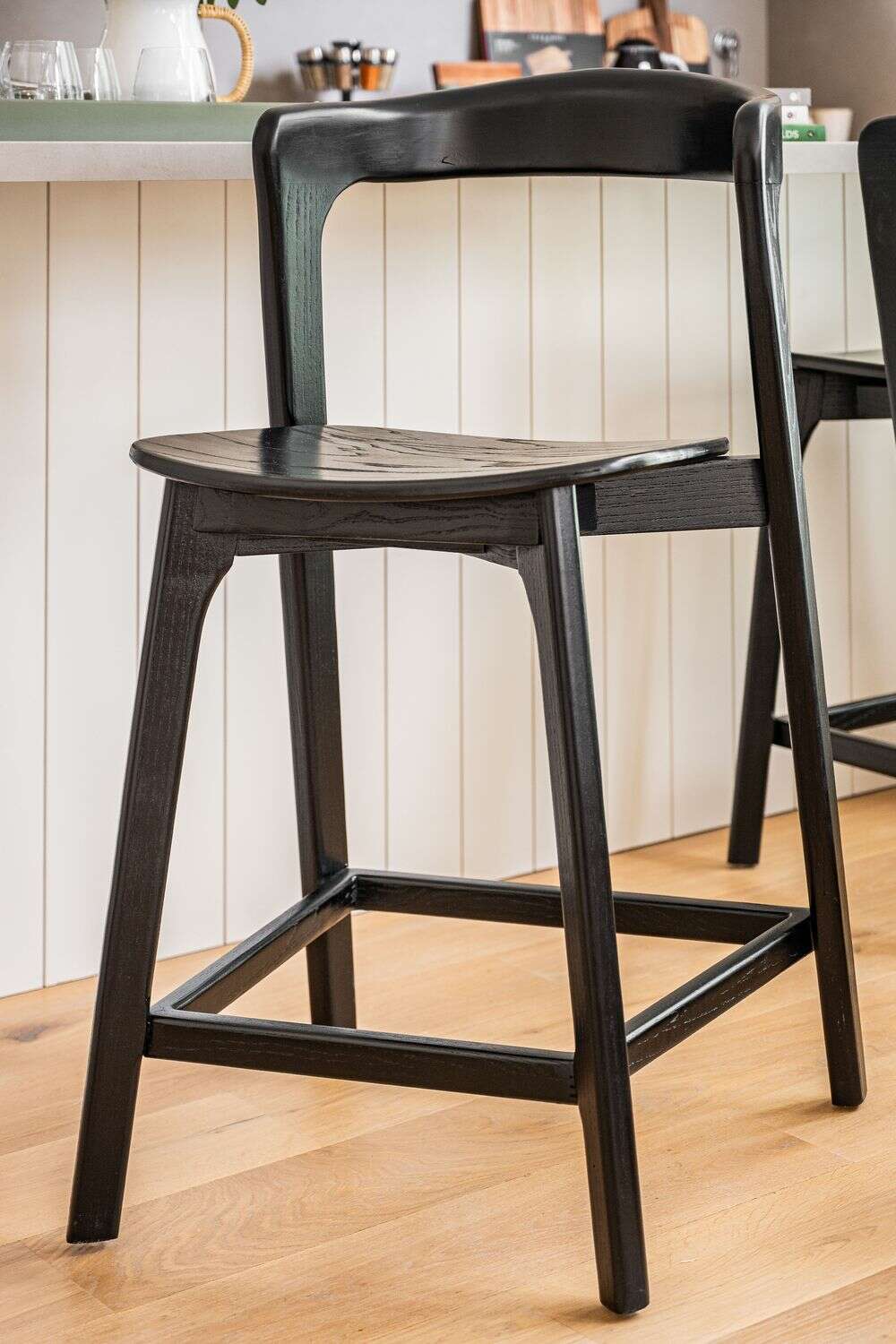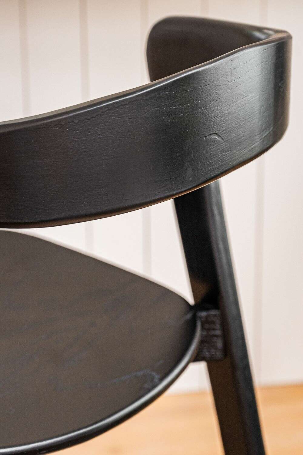 Amplia y comodísima silla alta para isla o bar: estructura de olmo macizo en lustre total black, asiento ergonómico y alucinantes curvas en asiento y espalda.