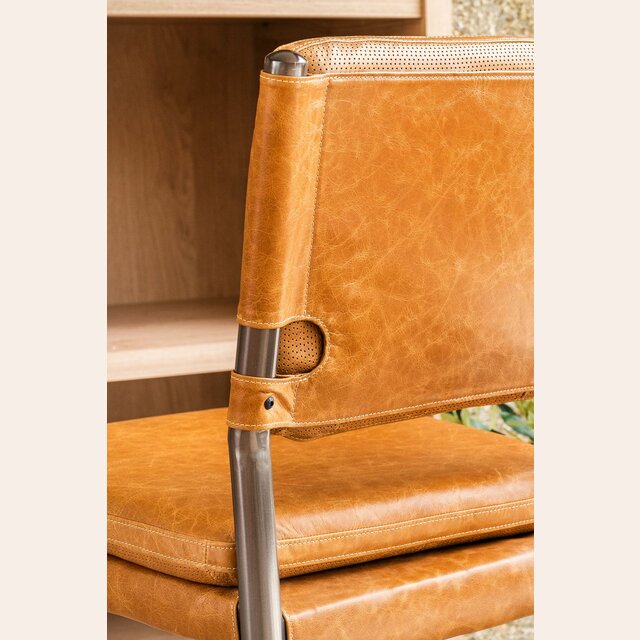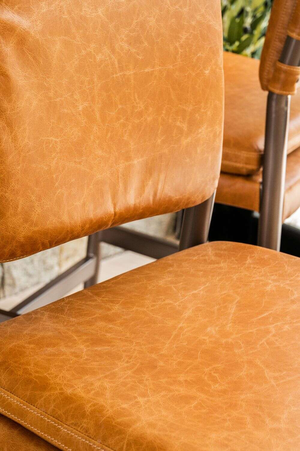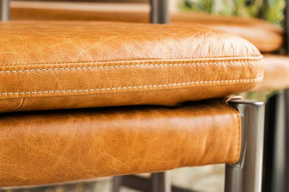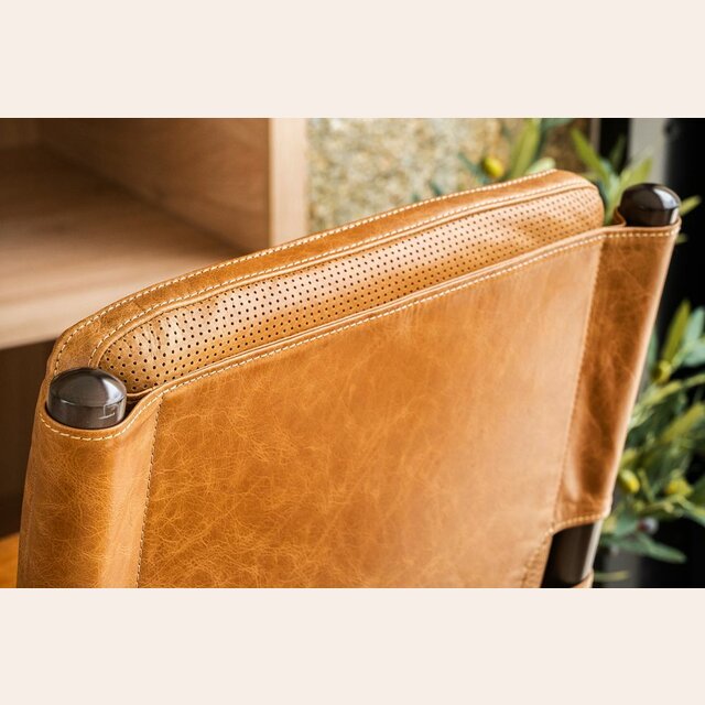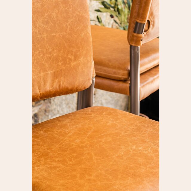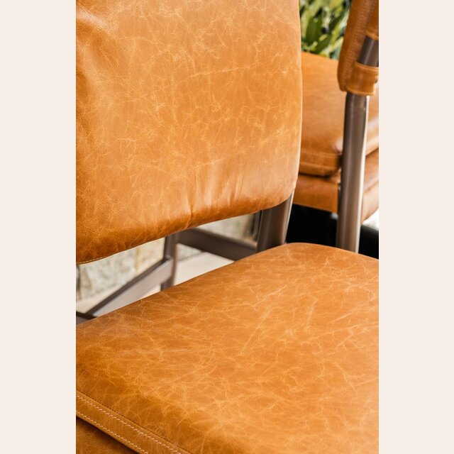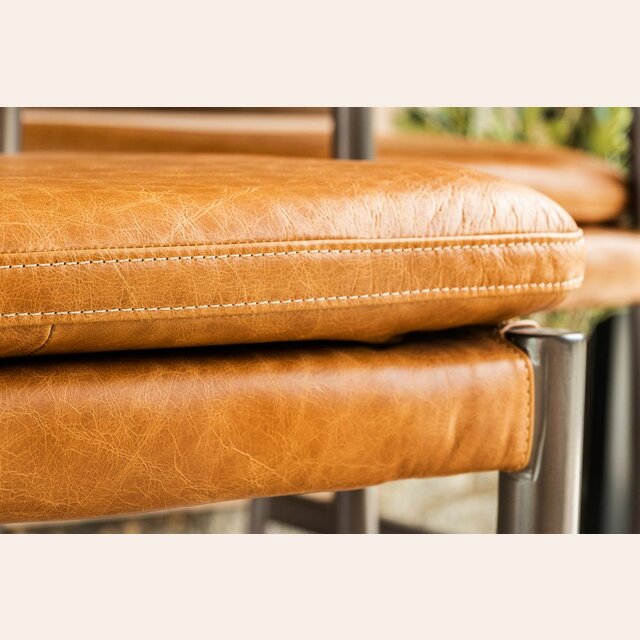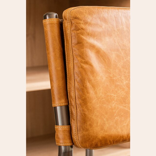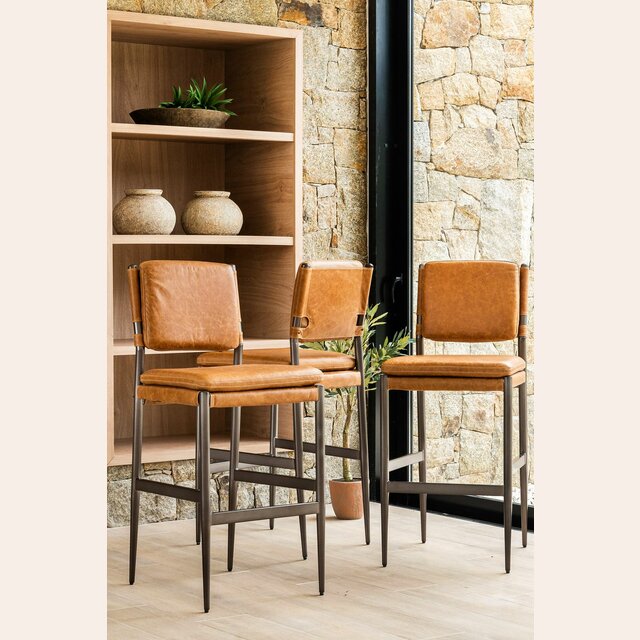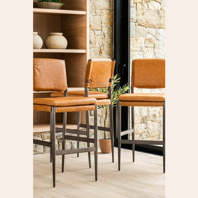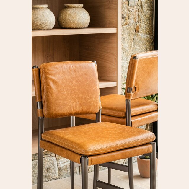 Amplia y comodísima silla alta para isla o bar con asiento y respaldo tapizado en cuero italiano envejecido color caramelo, sobre estructura de metal grafito con apoyapiés.