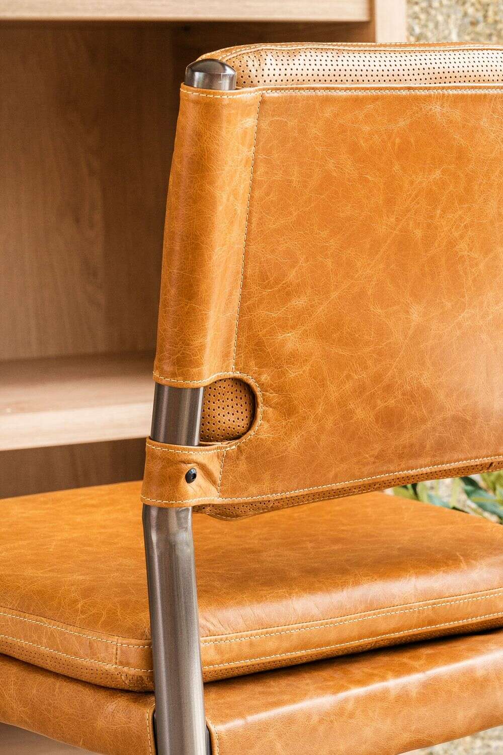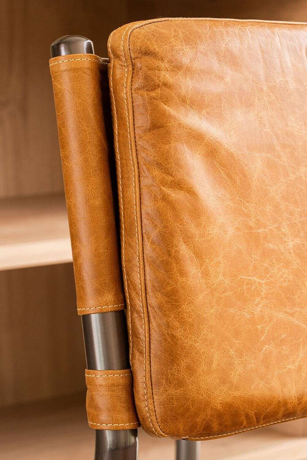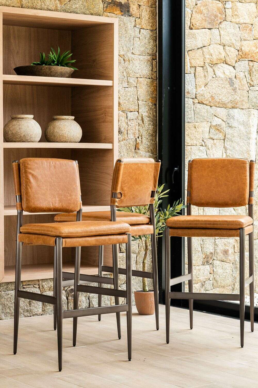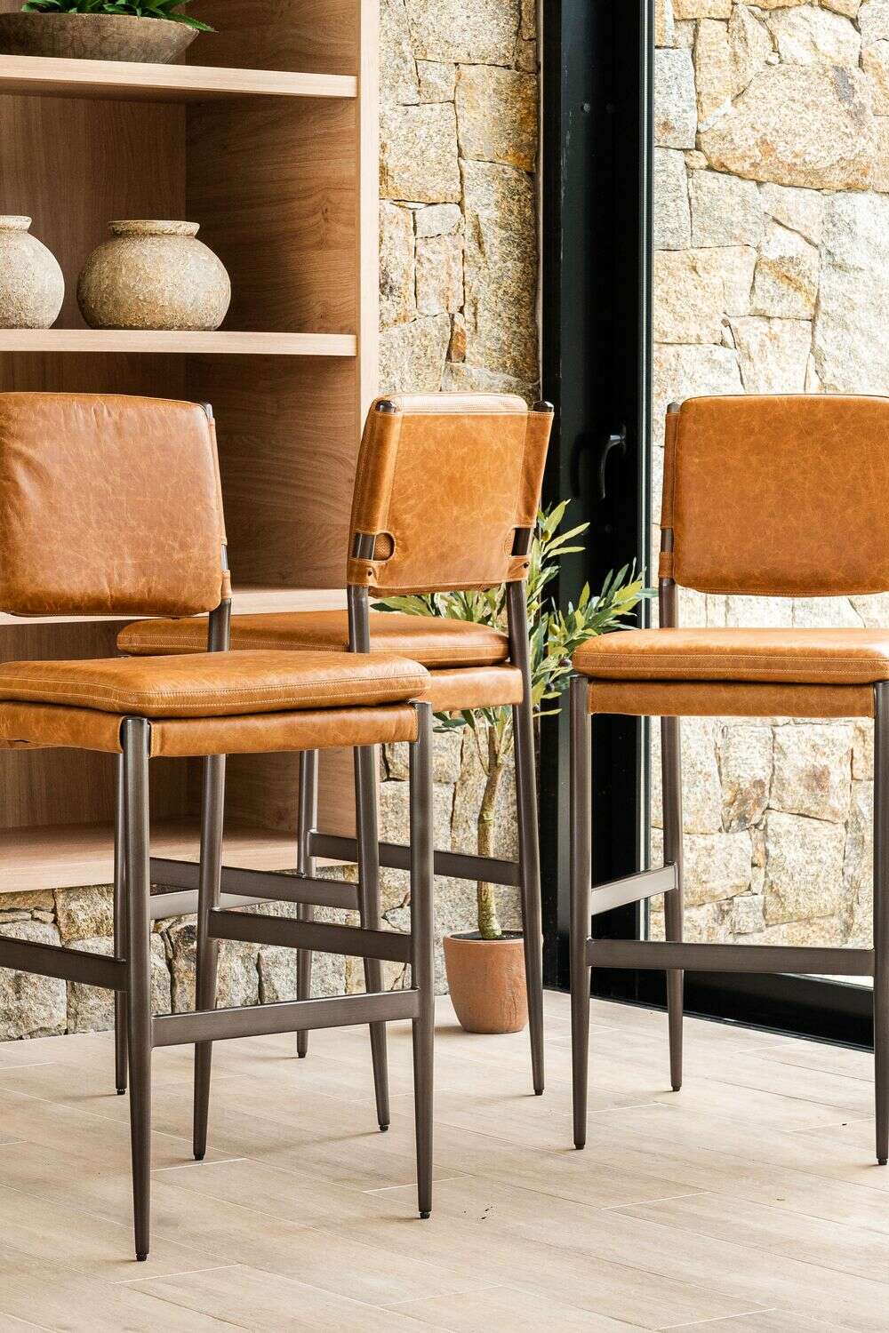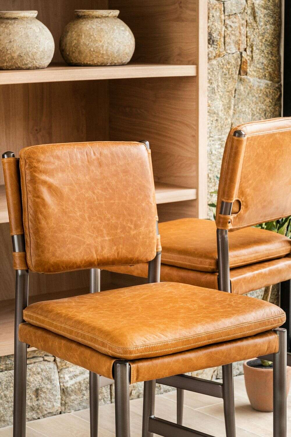 Amplia y comodísima silla alta para isla o bar con asiento y respaldo tapizado en cuero italiano envejecido color caramelo, sobre estructura de metal grafito con apoyapiés.