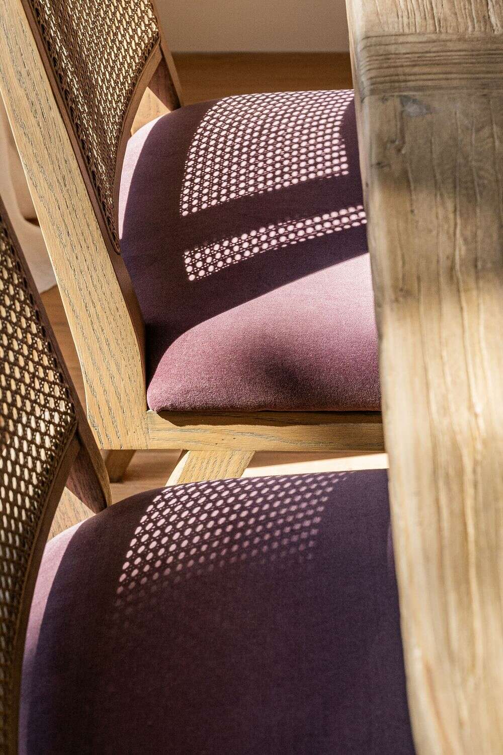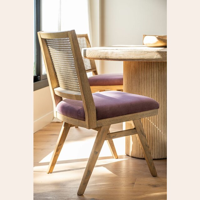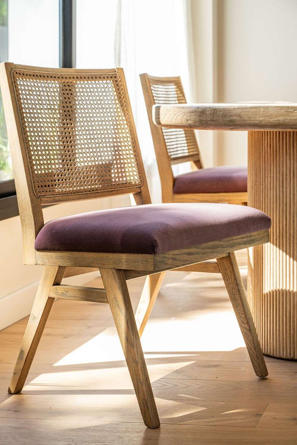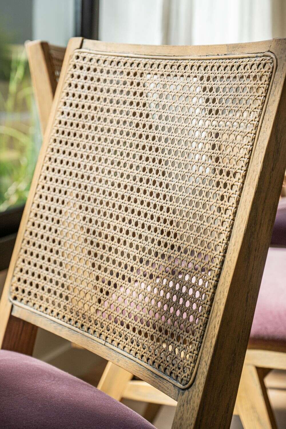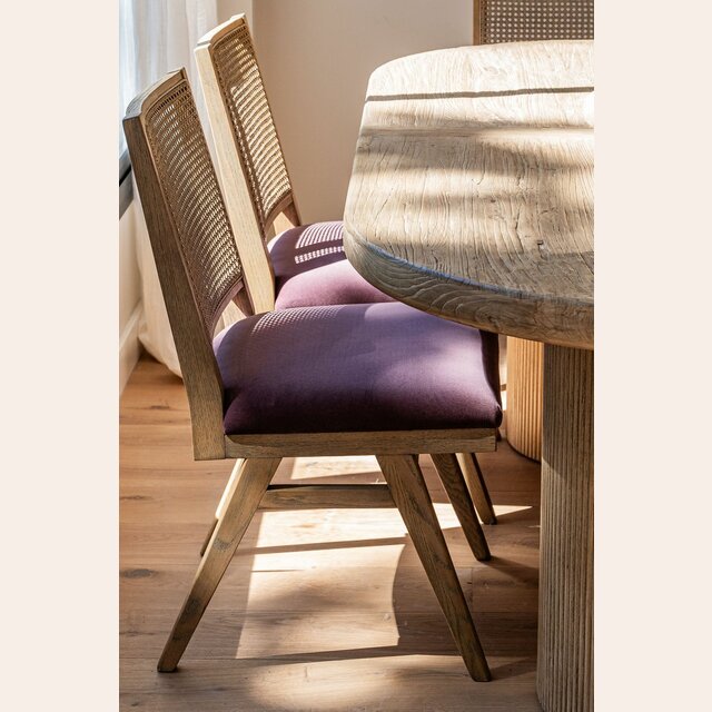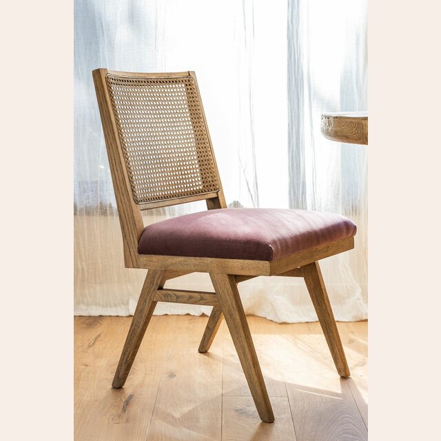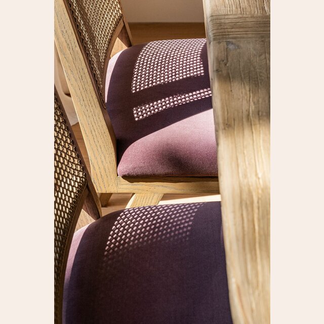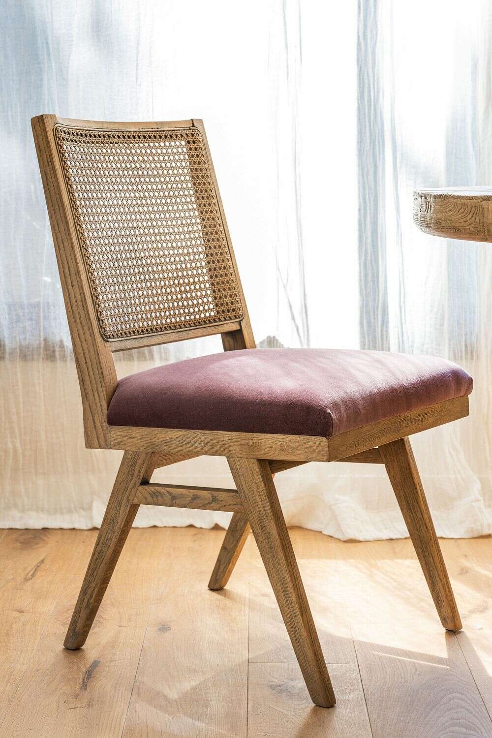 Versión customizada de una de las sillas favoritas en fresno macizo y respaldo de esterilla, con asiento retapizado en terciopelo natural color uva.