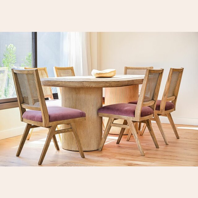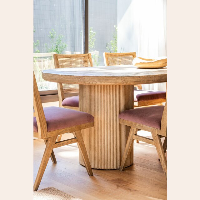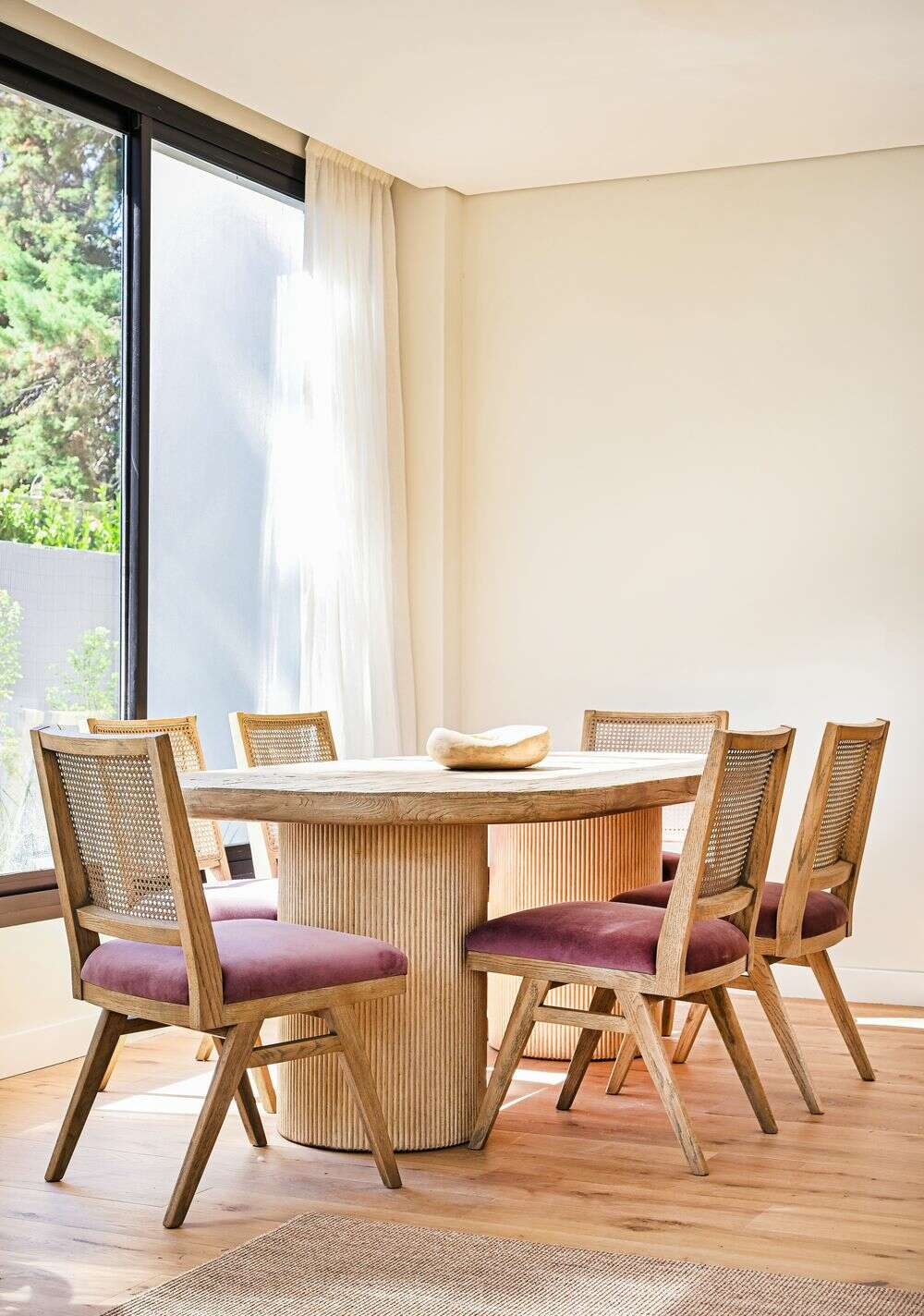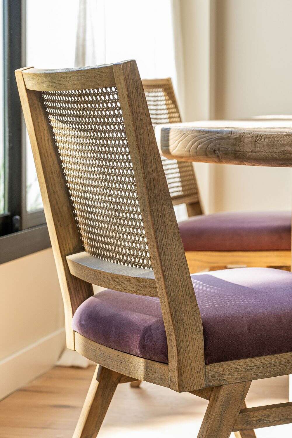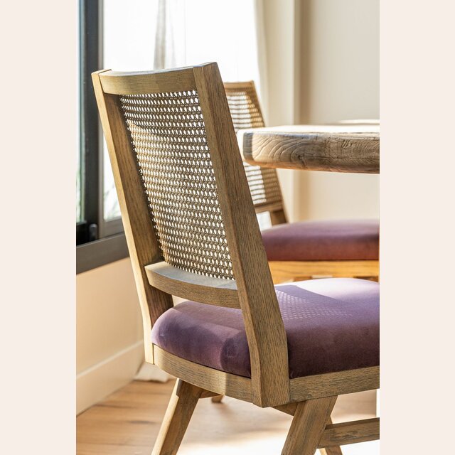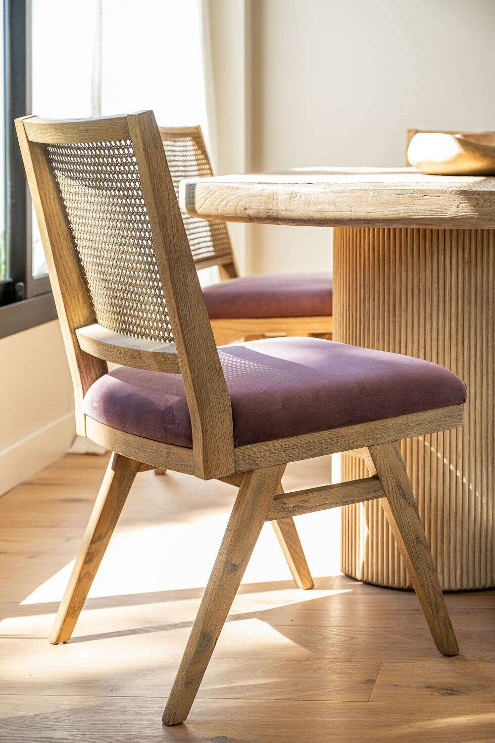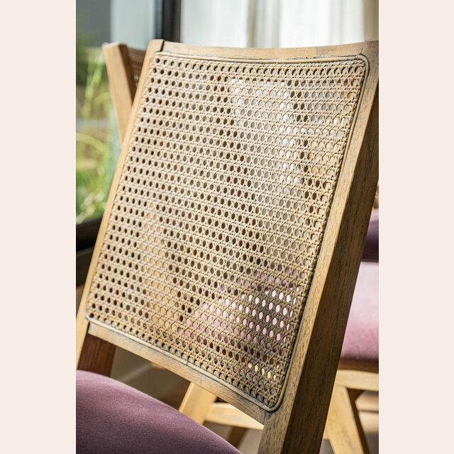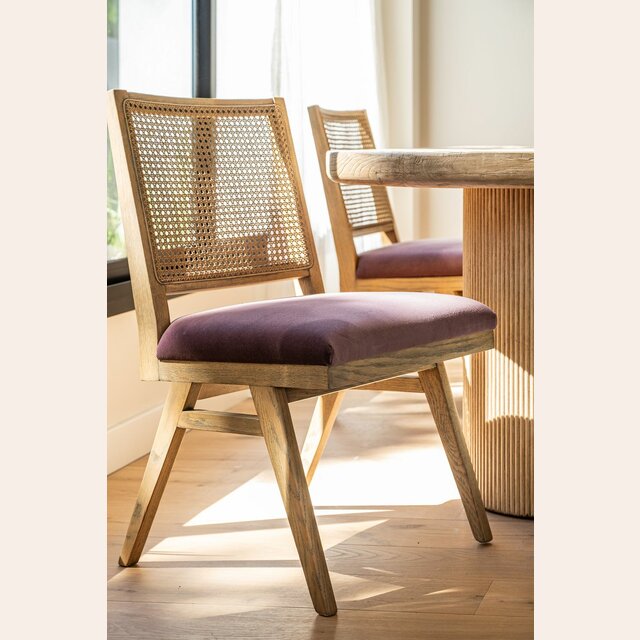 Versión customizada de una de las sillas favoritas en fresno macizo y respaldo de esterilla, con asiento retapizado en terciopelo natural color uva.