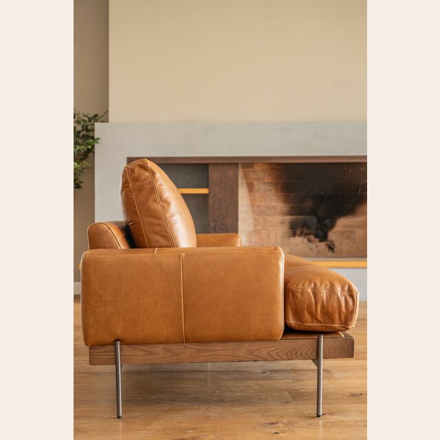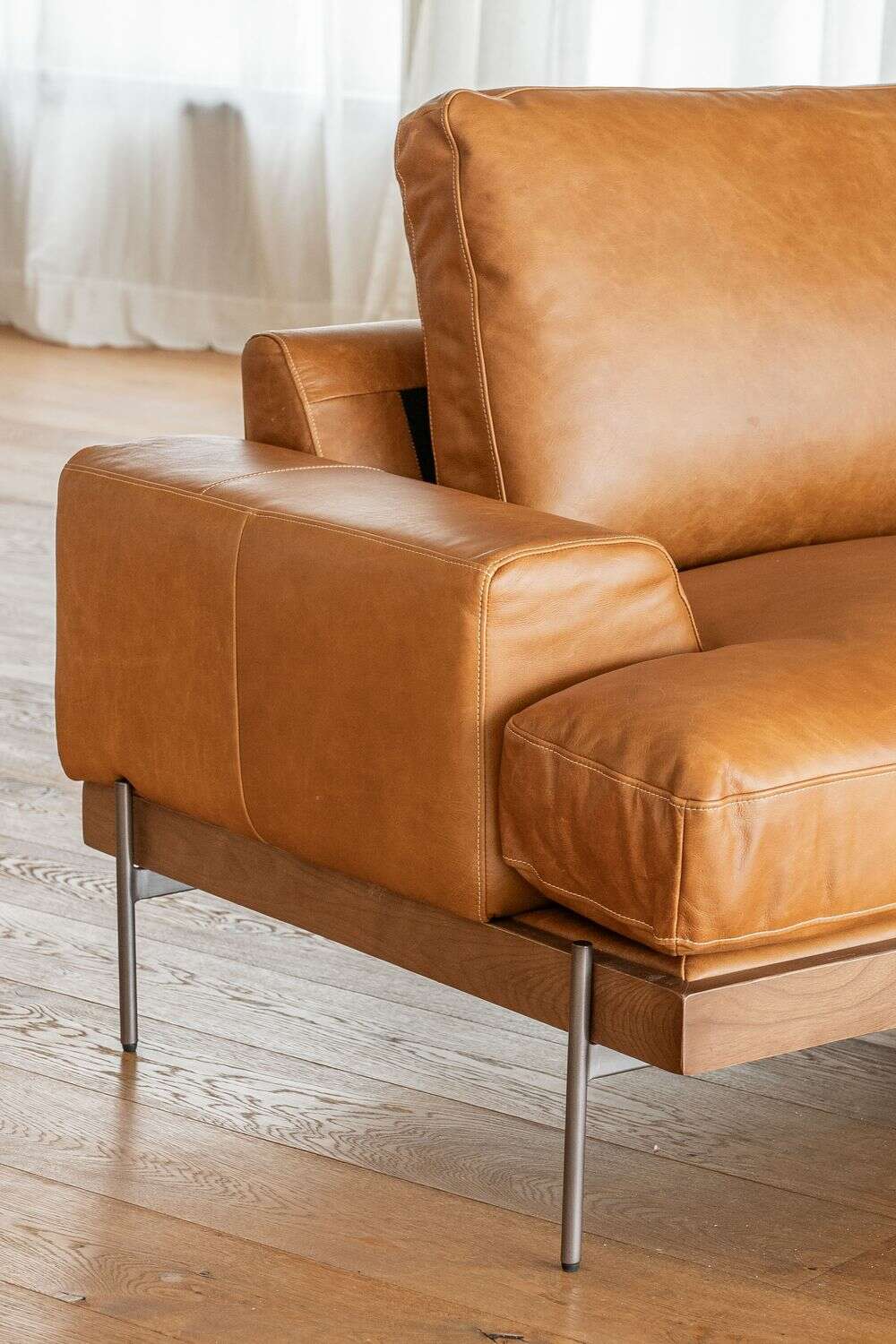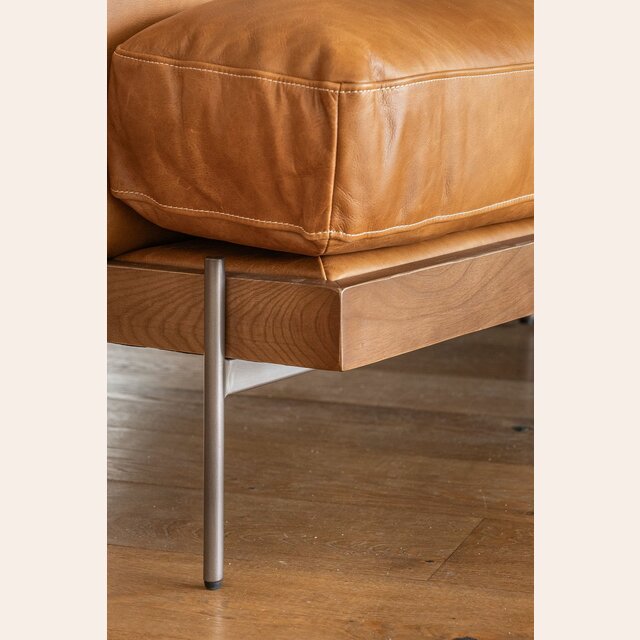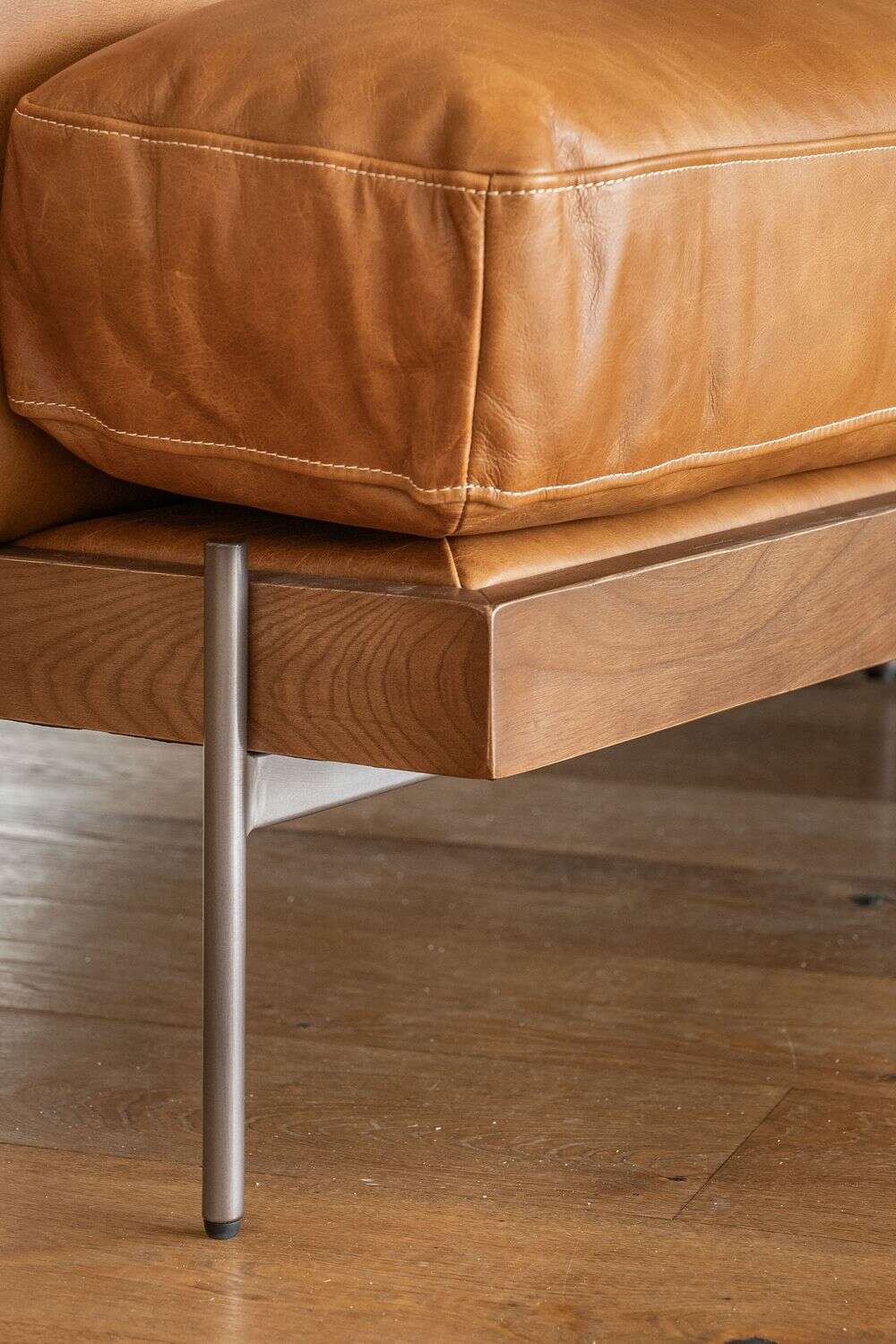 Impactante sillón moderno con estructura minimal de metal grafito y asiento tapizado en cuero italiano color caramelo.