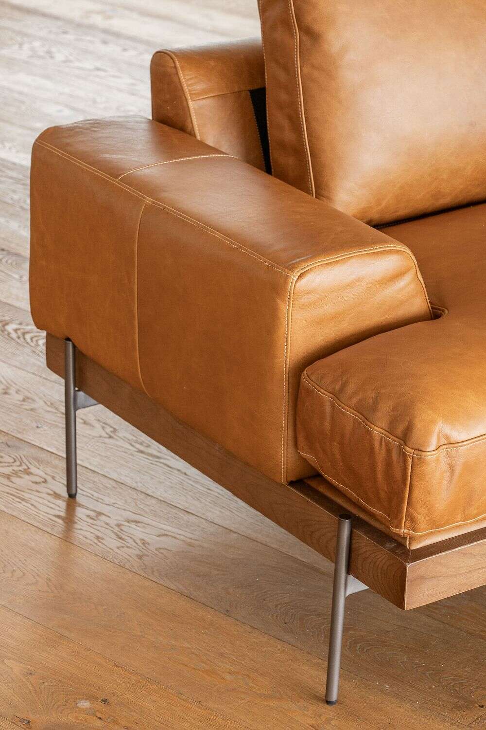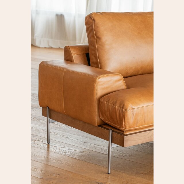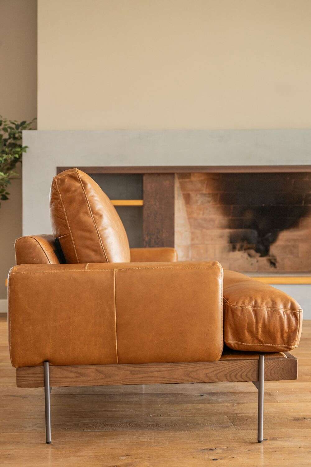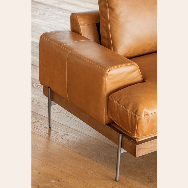 Impactante sillón moderno con estructura minimal de metal grafito y asiento tapizado en cuero italiano color caramelo.