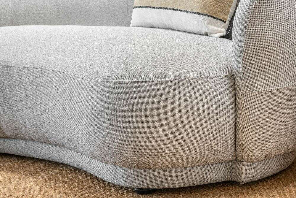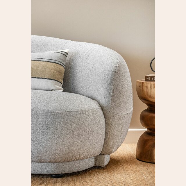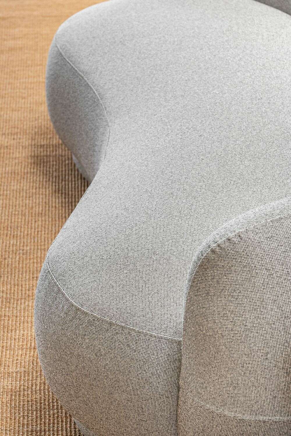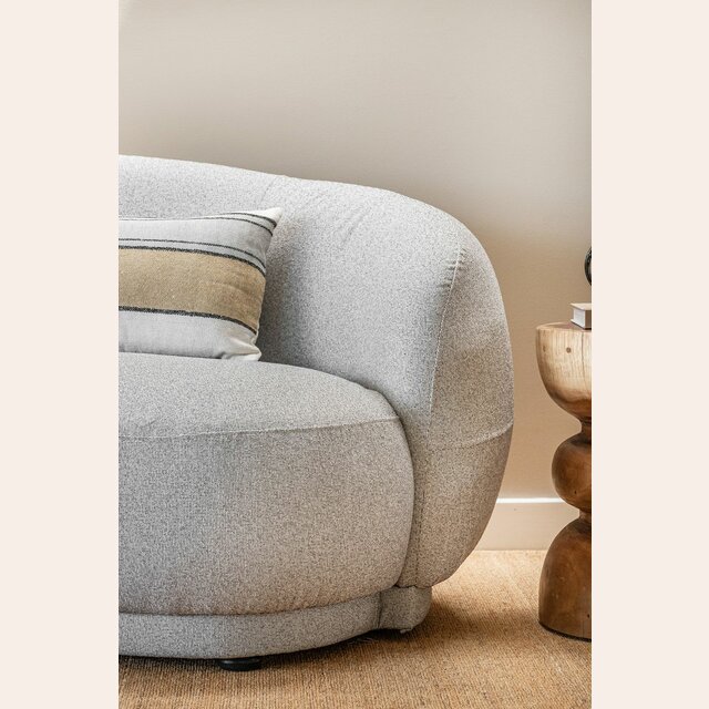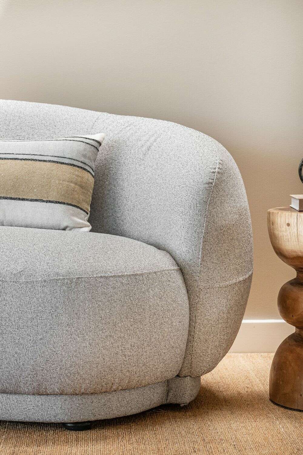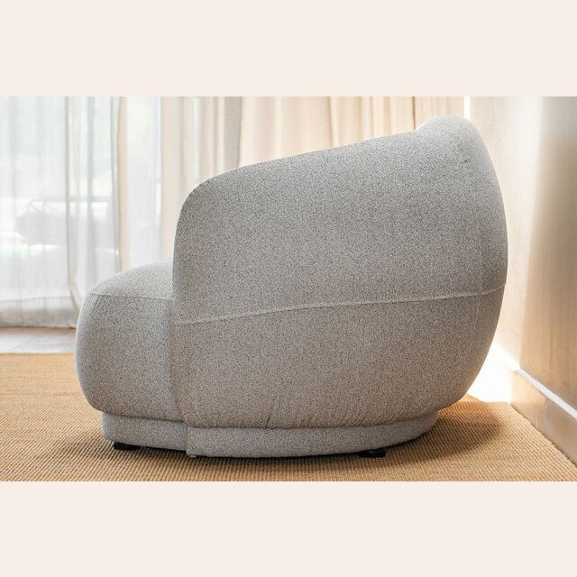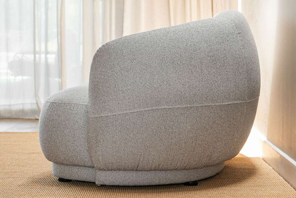 Sillón de forma curva y redondeada tapizado en lino antimanchas, ideal para cerrar un espacio de estar y romper con las líneas rectas, o en un dormitorio para crear un espacio de living y descanso.