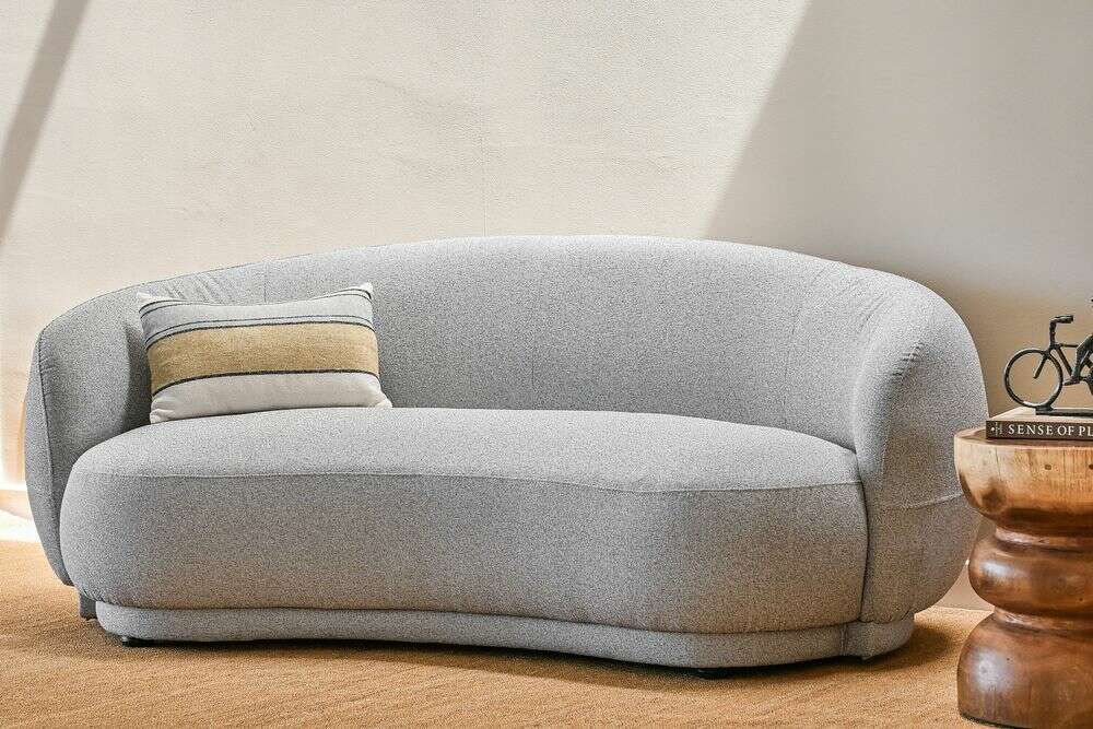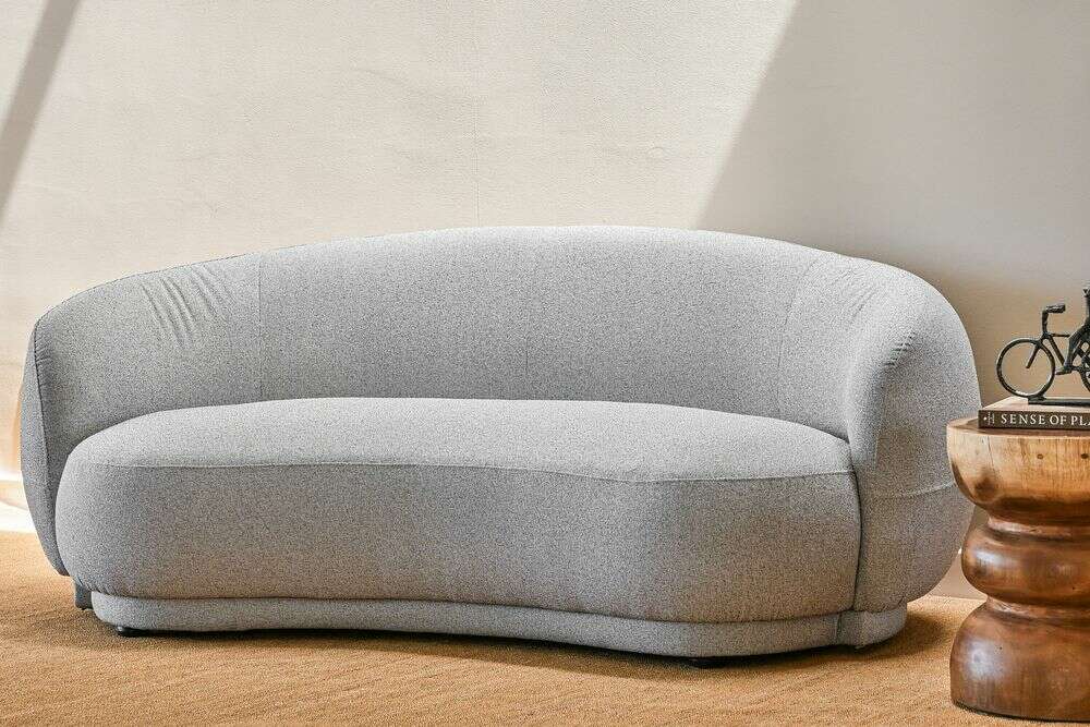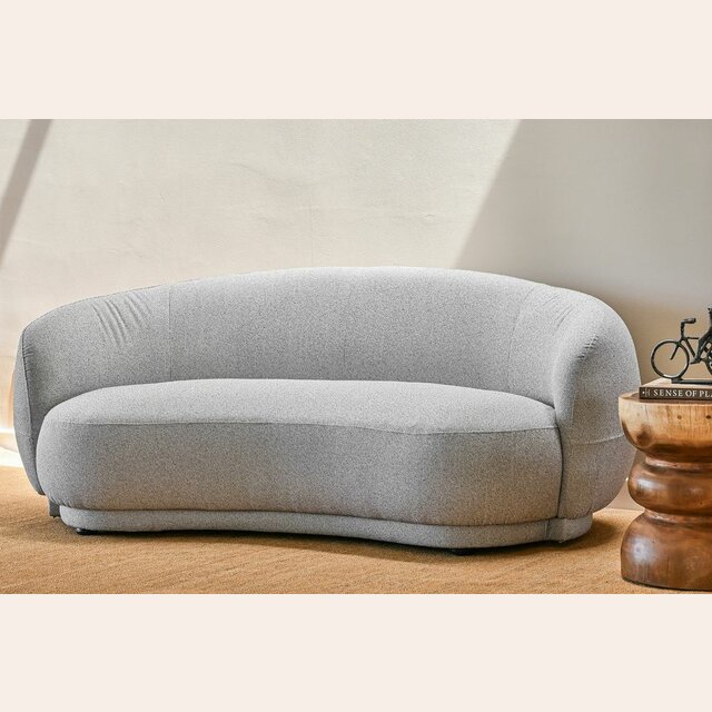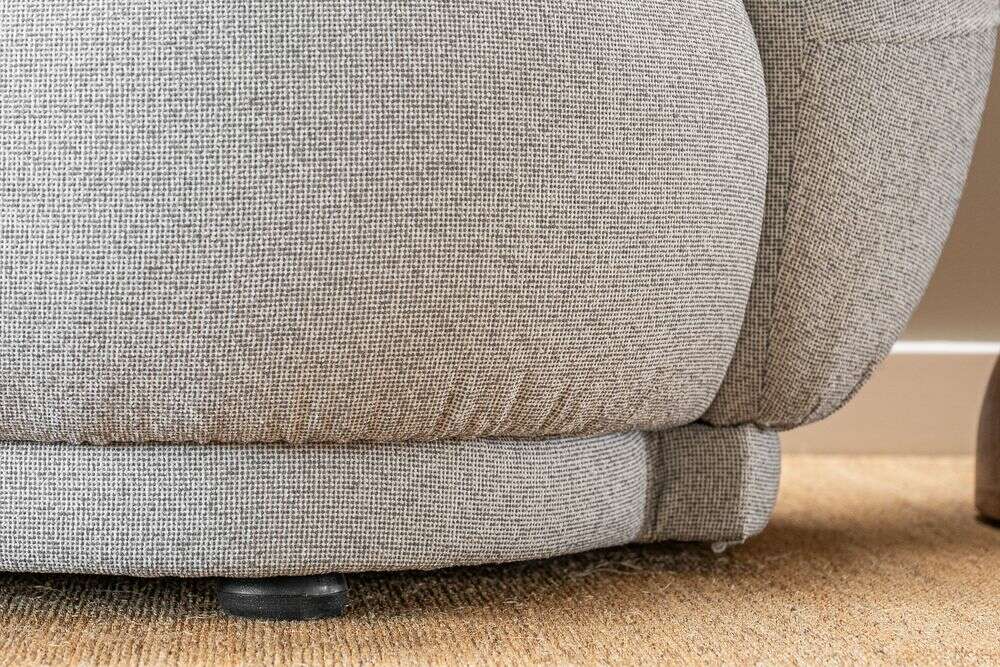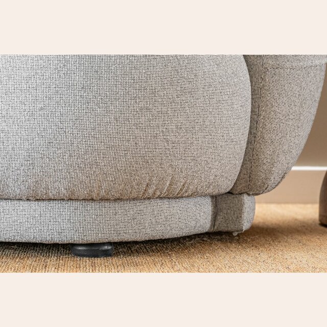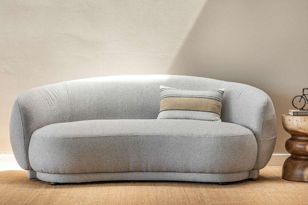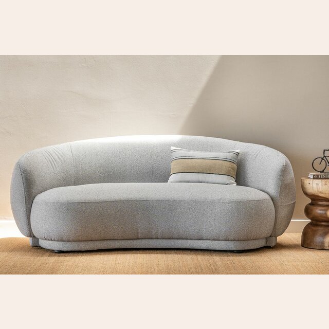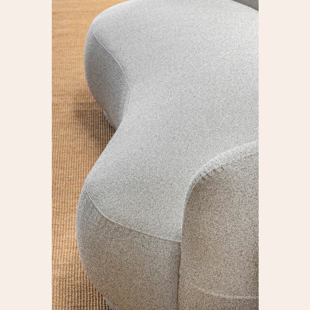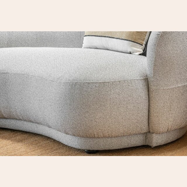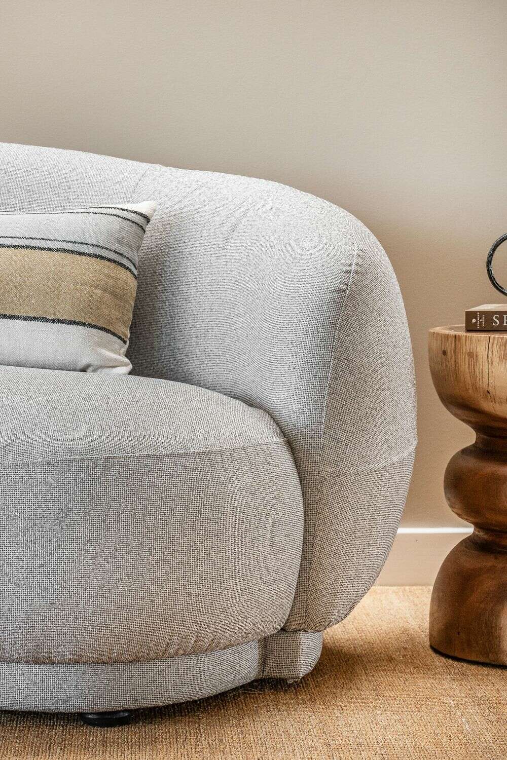 Sillón de forma curva y redondeada tapizado en lino antimanchas, ideal para cerrar un espacio de estar y romper con las líneas rectas, o en un dormitorio para crear un espacio de living y descanso.